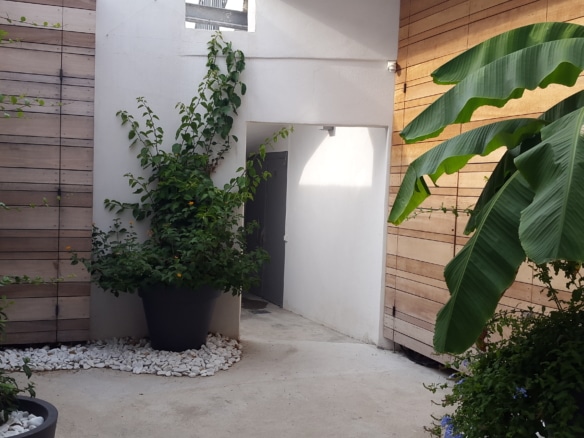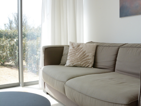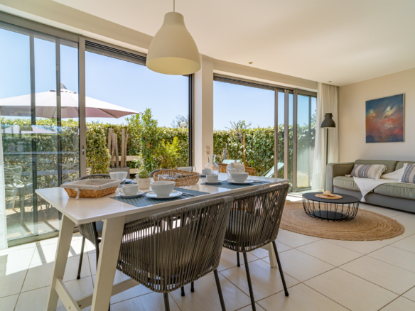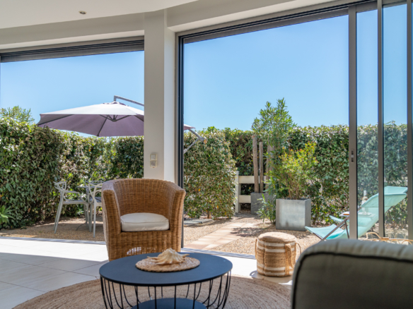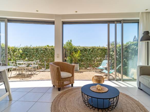 Contemporary designed holiday apartment with private garden and direct access to the beach. This apartment has its own private entrance at the back, leading to a quiet and green patio area. This beautiful holiday apartment has been entirely decorated by an interior designer and equipped with air conditioning and very comfortable and brand new beddings, a well equipped kitchen and contemporary designed bathroom.