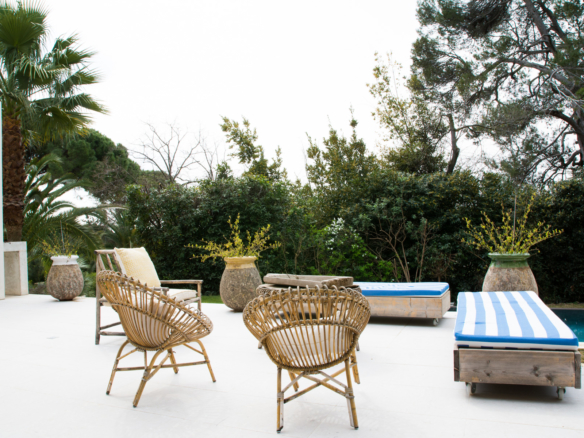 This contemporary villa offers ample living space of about 300 square meters and has been decorated with a characterful combination of Bohème and vintage furniture. On the ground floors, the entrance hall leads directly to the living area which comprises a comfortable seating room with its fireplace, then to the east side, a small dining area, and a contemporary open kitchen with a bar. All bay windows open fully to allow a perfect connection between the inside and outside space. On the west side of the living room is a cosy study room with an extra sofa bed for 1 person.