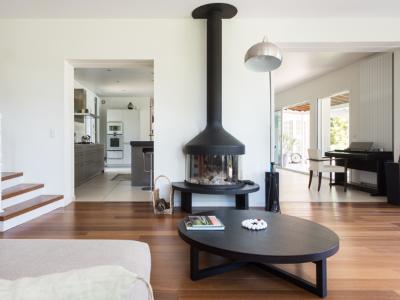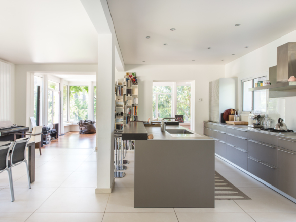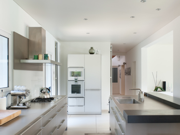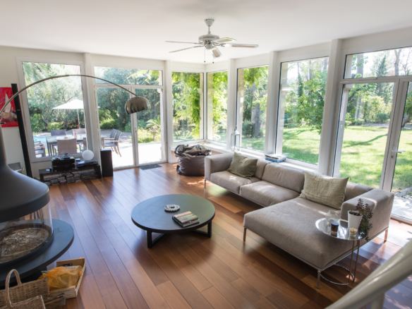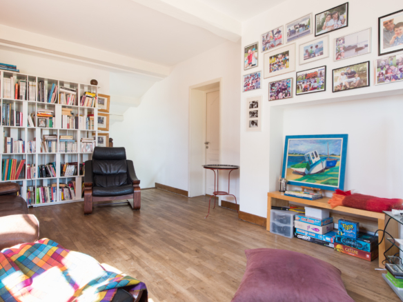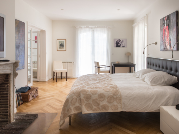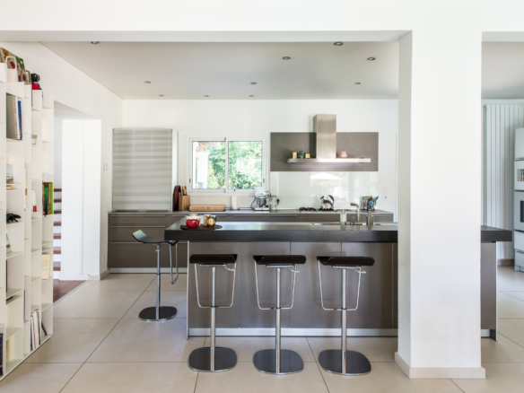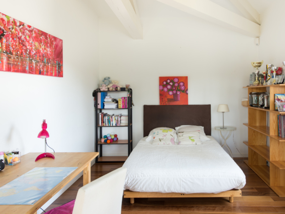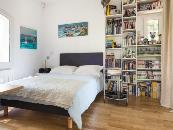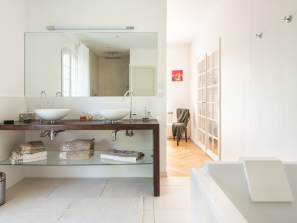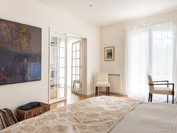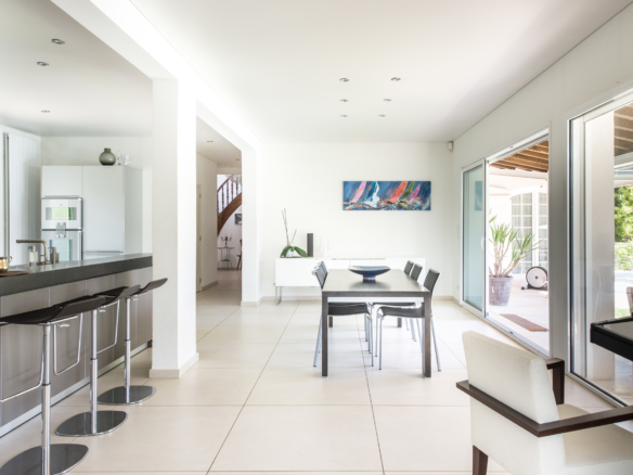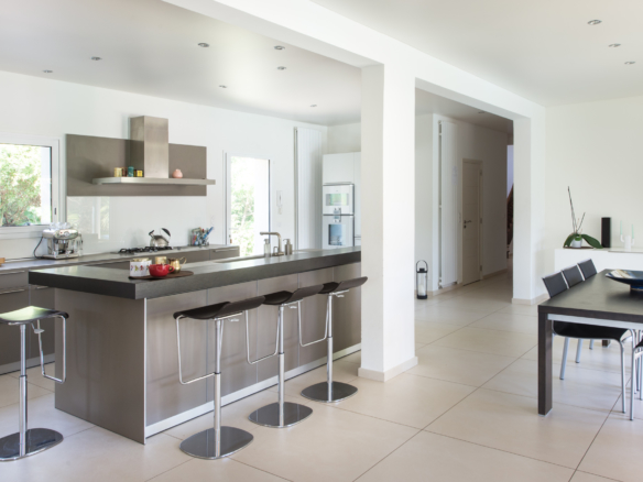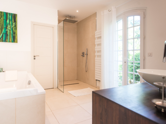On the ground floor, there is an 80-m2 living room with a dining area overlooking a large terrace and the garden through sliding glass doors. The modern kitchen is seamlessly intgrated to the main room thanks to its central island with bar and open floor design. On one side of the main living space, you will find the master bedroom with an en-suite bathroom and a dressing room. On the opposite side, there is a double bedroom with an en-suite shower room and a toilet, with direct access to a private terrace.