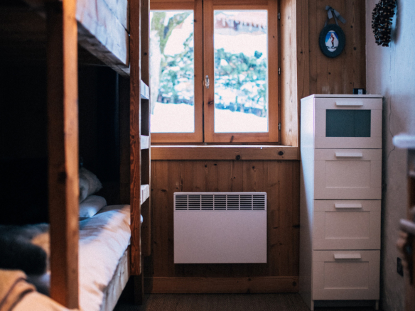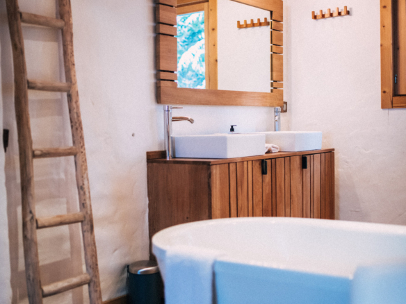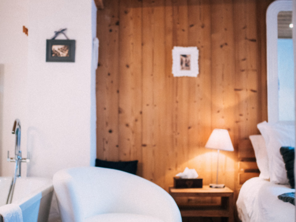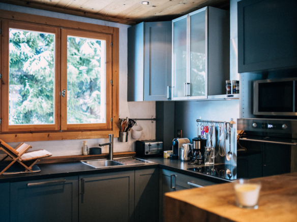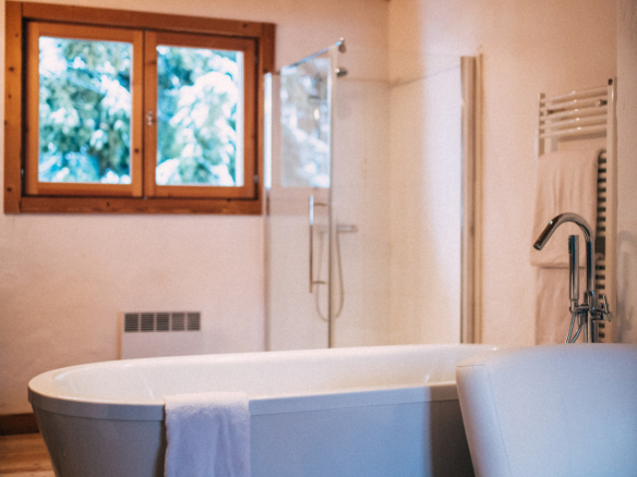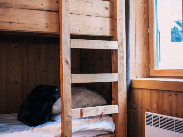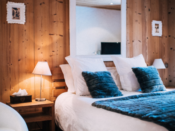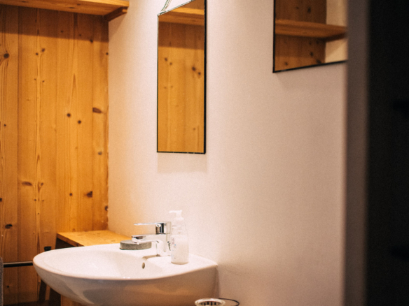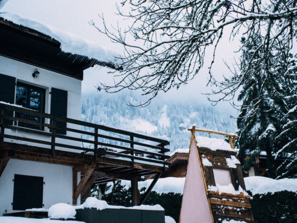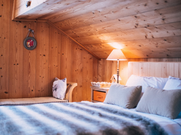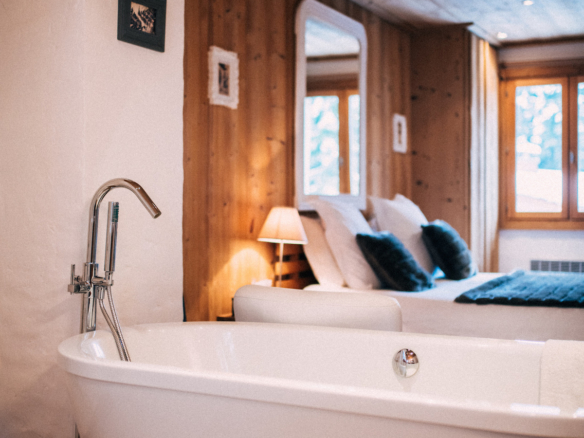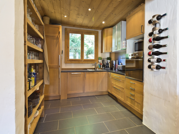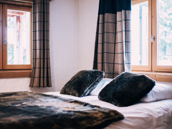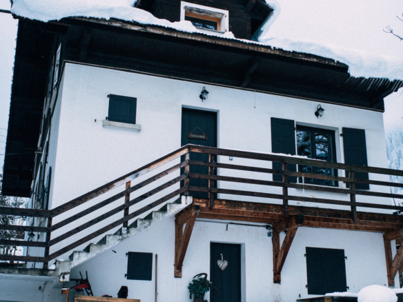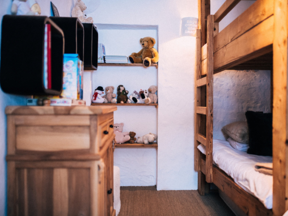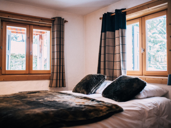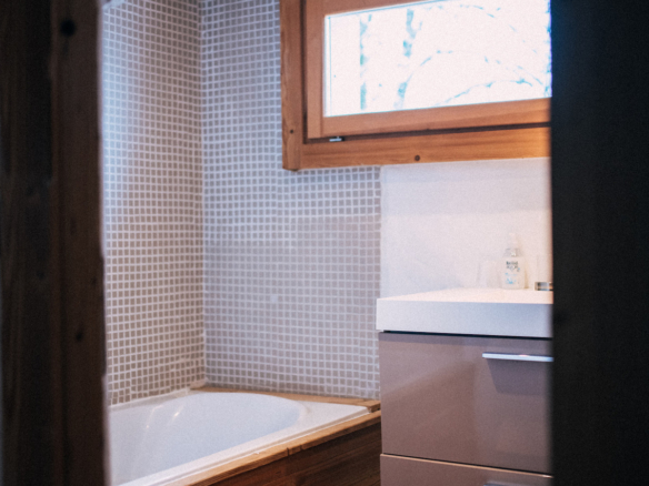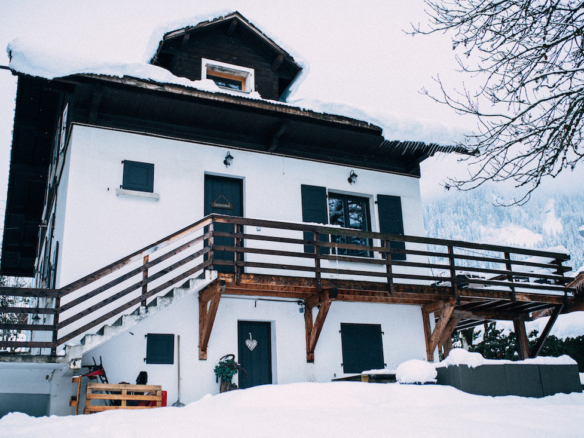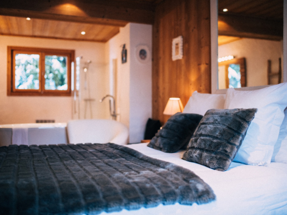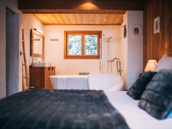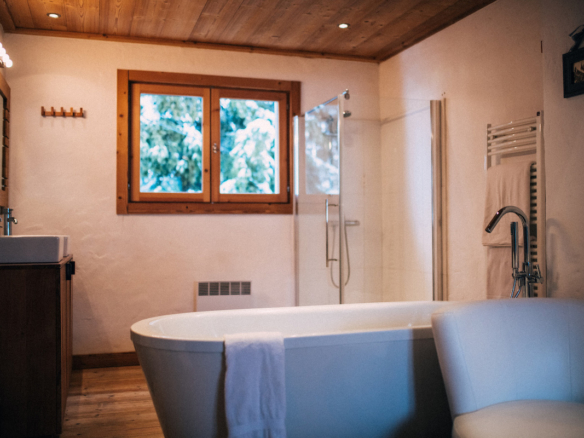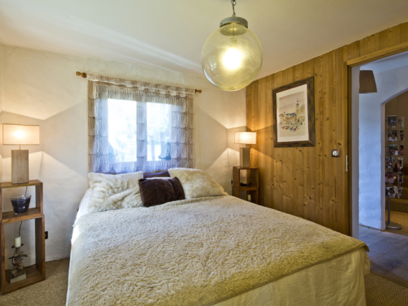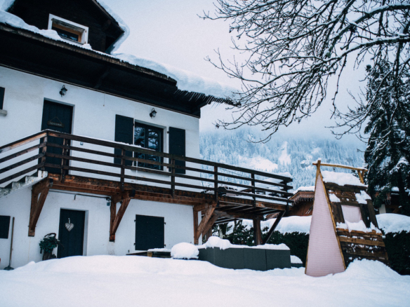 The chalet is built over three floors and accessible through its own 700m2 peaceful garden and terrace. Two entrances are possible, one is on the garden level via a hallway / closet where skiers will be able to leave their skis, surfs and other ski equipments. The other entrance is via outside steps leading to a balcony on the first and main floor. The interiors of the chalet are composed of a 50 square meters main floor with a cosy living room, a dining area and an open kitchen. The lower level or garden level is divided in two bedrooms on each side of a hallway, a large master bedroom with its ensuite shower room and a kids bedroom with 2 wooden bunk beds which also has its own individual shower room. The top floor is composed of a second master bedroom with an ensuite bathroom including a bath and shower, and another double bedroom with its own bathroom.
