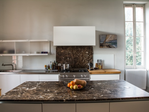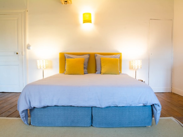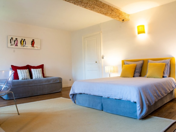 The ground floor is composed of two large living rooms, one with a lovely fireplace. On the same level, there is an elegant dining room that sits up to 15 people; it further connects to the generous contemporary eat-in kitchen. On the east side of the same floor, a small office room leads to a spacious master bedroom with its en-suite shower room, both overlooking the gardens.