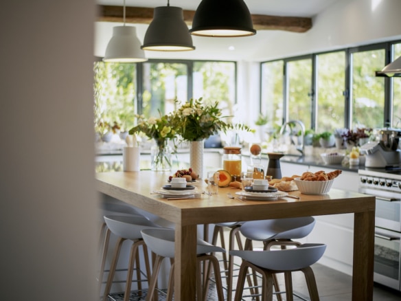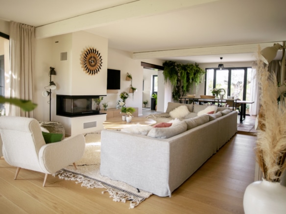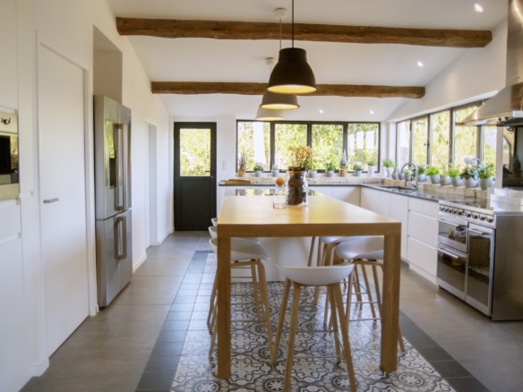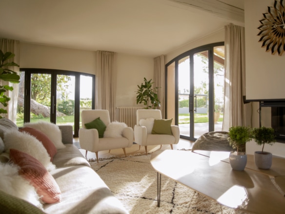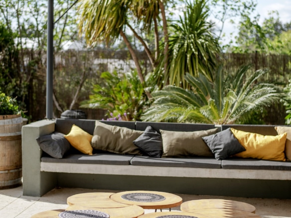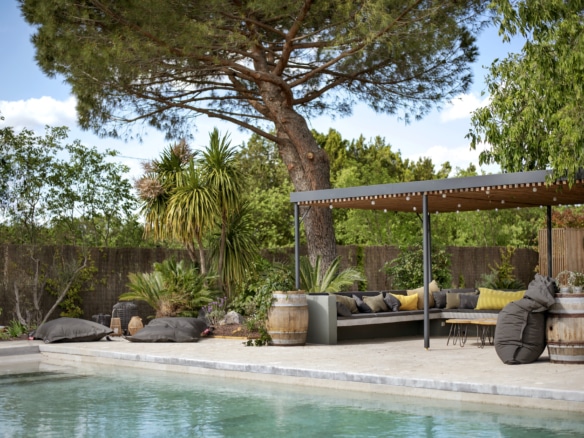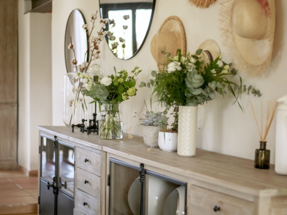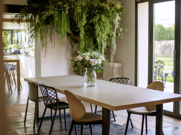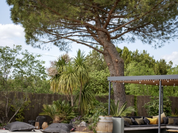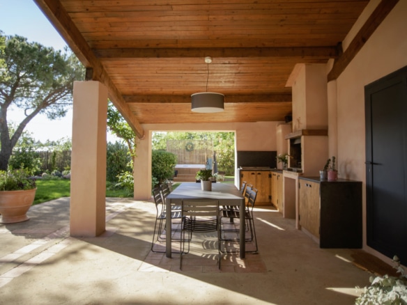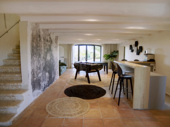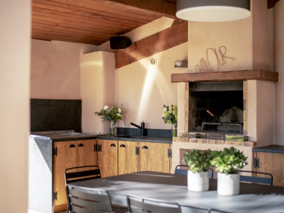 The large poolside terrace has modern corner sofas which can sit guests under a sea of warm light, completely immersed in the serene natural setting. Thanks to a second large outdoor dining area with a summer kitchen, family and friends can dine by the poolside on those sultry summer evenings. A professional grade plancha grill and barbecue, a fridge and an outdoor Bluetooth sound system are also available.