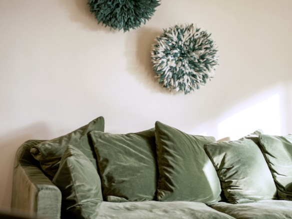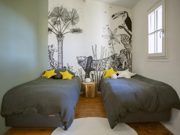 The first floor contains an additional 4 bedrooms: the master suite has a king-sized bed, a dressing room, and an en-suite bathroom with two showers; two further double bedrooms welcome you with beautiful personal touches and elegant plants; and the final bedroom has twin beds (the Jungle Room). The upstairs area also offers a wide selection of games for children, as well as an office area with a printer.