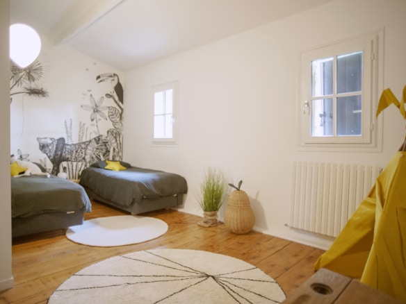 The bedrooms are distributed on both floors of the villa; they are all equippped with air-conditioning and all but one, with TVs. The playfully decorated children’s dormitory (up to 7 children) on the ground floor has its own shower room, as does the other double bedroom on the ground floor, fitted with a queen-sized double bed.
