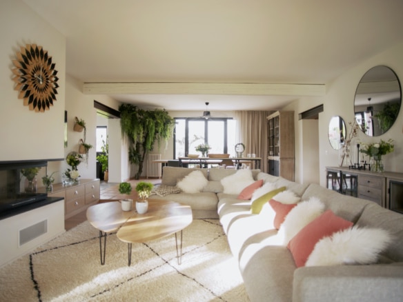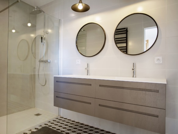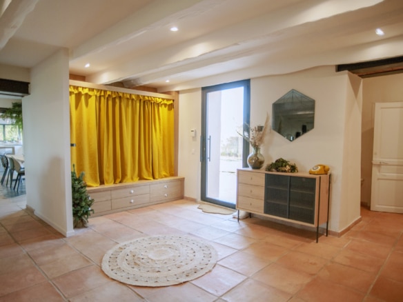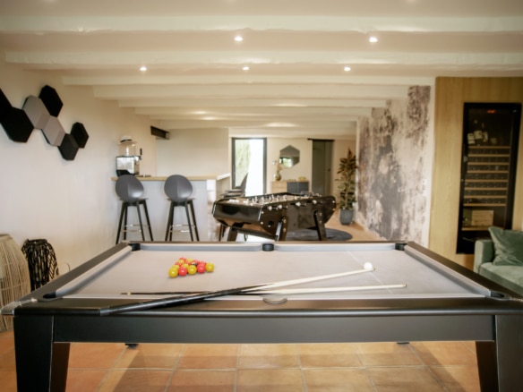 From the entrance hall, the visitor will immediately see the games room, a hub of entertainment: Bang and Olufsen sound quality as you enjoy a game of billiards or foosball, and afterwards you can enjoy a cocktail at the bar. To the right, a light and airy living room welcomes guests with natural tones and Scandinavian designs, from the plush sofa and to the wood tables, or the array of traditional Provençal decoration updated for a modern look. This space gives directly onto the dining room, accentuated by a stunning weeping tree. Further, you will find the eat-in kitchen, fitted with state-of-the-art appliences: 4 different ovens, a side-by-side fridge and freezer, dishwasher, induction hobs, Moulinex XXL companion etc. The laundry room is next to the kitchen, with both a washing machine and tumble dryer as well as ironing board and iron.