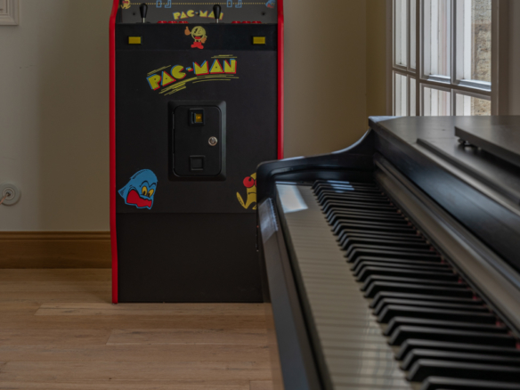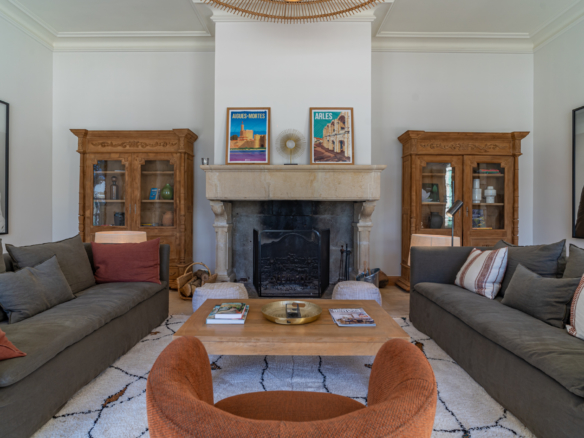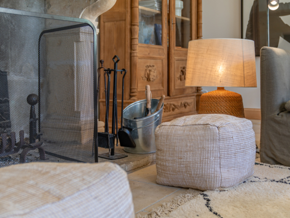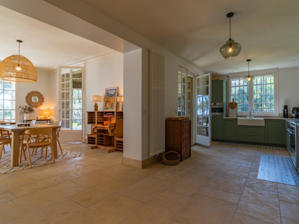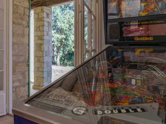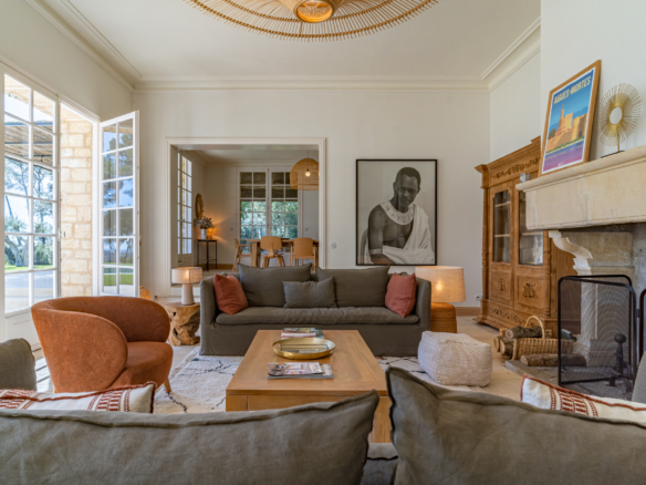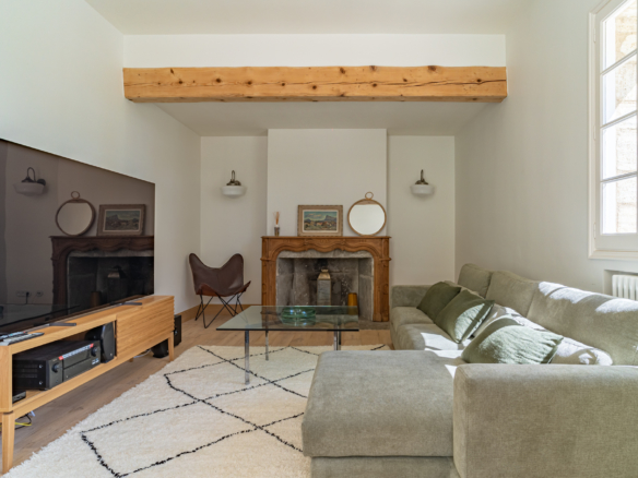 L’intérieur de la villa témoigne à la fois de l’élégance et du confort moderne. Le rez-de-jardin est doté d’un salon orienté au sud et baigné de soleil, avec une grande cheminée et des canapés accueillants, offrant une atmosphère chaleureuse et invitante pour les rassemblements et la détente. Adjacent au salon, vous découvrirez une salle à manger familiale, une vaste cuisine moderne très bien équipée, ainsi qu’une salle de télévision et de jeux dédiée.