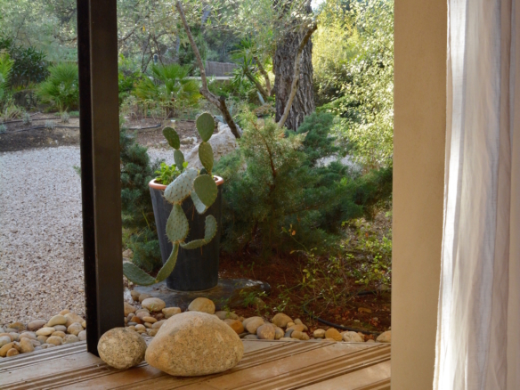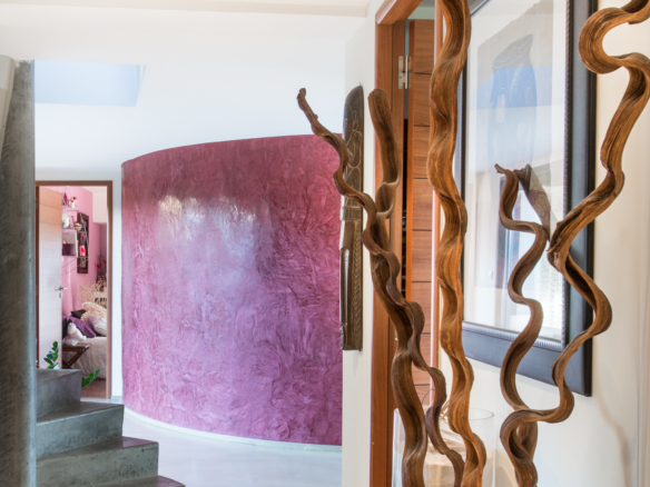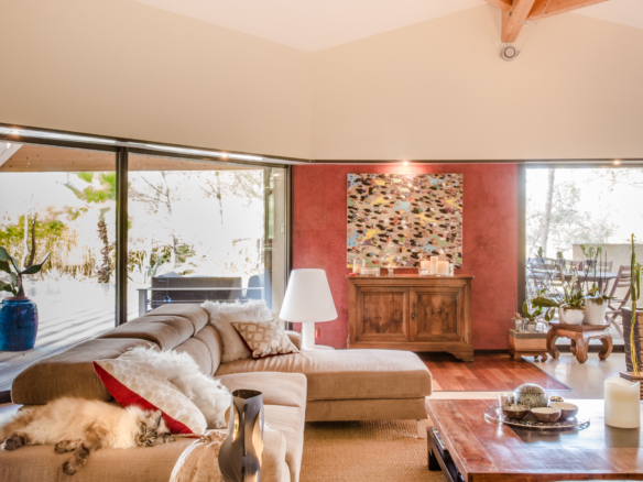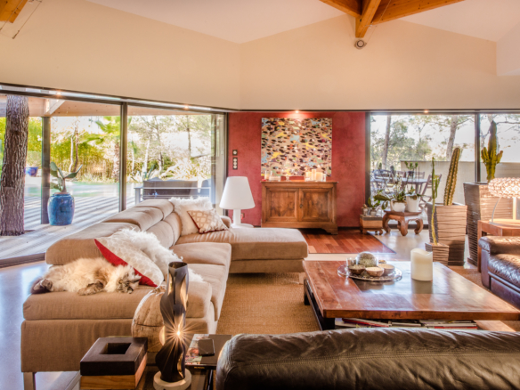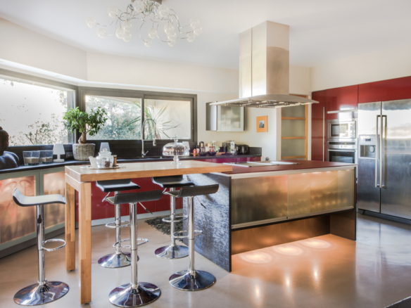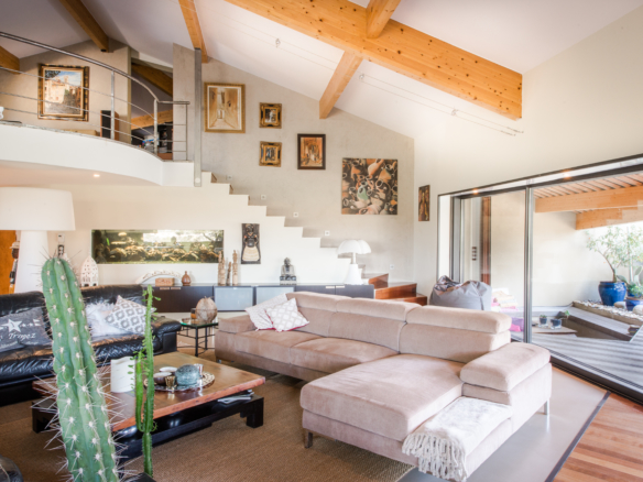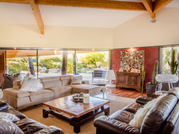 Nature is also part of the inside architecture of the house as it embraces several enclosed gardens with large picture windows and glass doors that flood the house with light. Extending over 300 square meters over two floors, the house welcomes guests through a main entrance that leads through a winding glass corridor flanked by indoor gardens on either side, to a very spacious double-height living room, which overlooks the garden and pool. Wide sliding glass doors open to create one unique harmonious space between the inside and outside on both sides. The imposing open kitchen with a central island is fitted with the best equipment to suit the most demanding chefs. Contemporary artwork and design furniture come together under the impressive visible wood beams to create a balanced and elegant ensenmble. The formal dining area is in a separate room, at the back of the living room in a cosier space and opens onto a private indoor garden.
