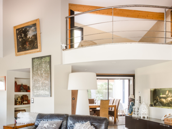 Another separate TV room with comfortable sofas (and railings) overlooks the living room.