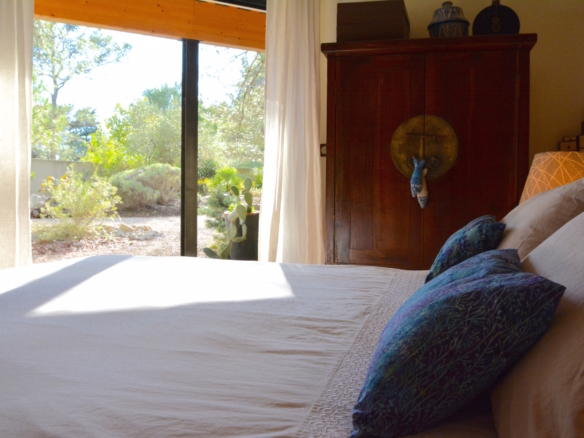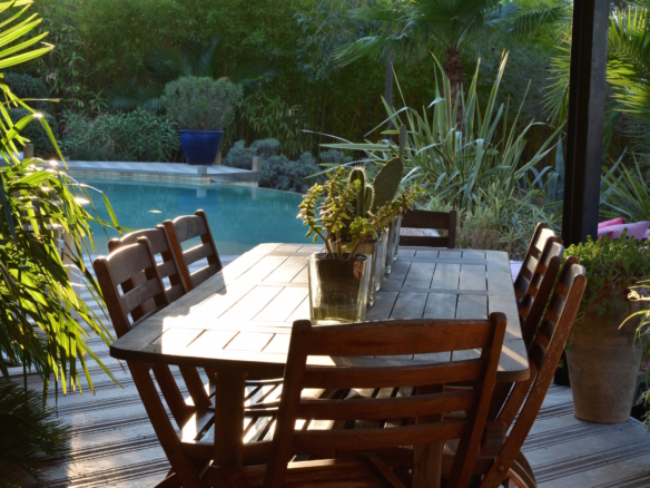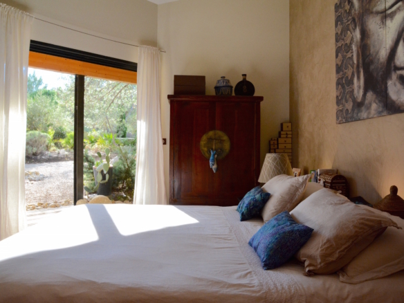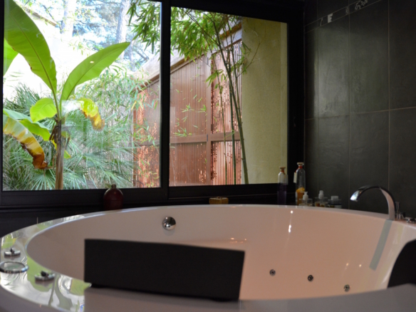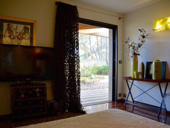 A corridor leads to the bedrooms area. The master bedroom is fitted with a 180×200 size bed (super king) and large glass door that open onto a private terrace, that leads to the garden. This room has an en-suite bathroom with a chromotherapy bathtub and walk-in shower which looks into another indoor garden. Also in this area, guests will enjoy a separate tiled hammam with shower. The villa offers other 3 double bedrooms with 140×200-size beds, each directly leading to a private terrace through glass doors, and from there to the garden beyond. 2 of these rooms have an en-suite shower room. Finally, there is one family bathroom with both a bathtub and shower, which gives to an indoor garden.