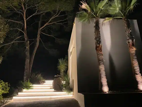 Step outside from the ground floor common areas onto a decked terrace that surrounds the stunning infinity-edge swimming pool. The terrace is thoughtfully designed to cater to all your outdoor living needs, with a covered area for alfresco dining, a comfortable sitting area, and sun loungers for basking in the Mediterranean sun. The surrounding 2000-square-meter garden is a lush oasis of local Mediterranean and exotic plant species, including majestic palm trees, providing a tranquil and private setting for your stay.
