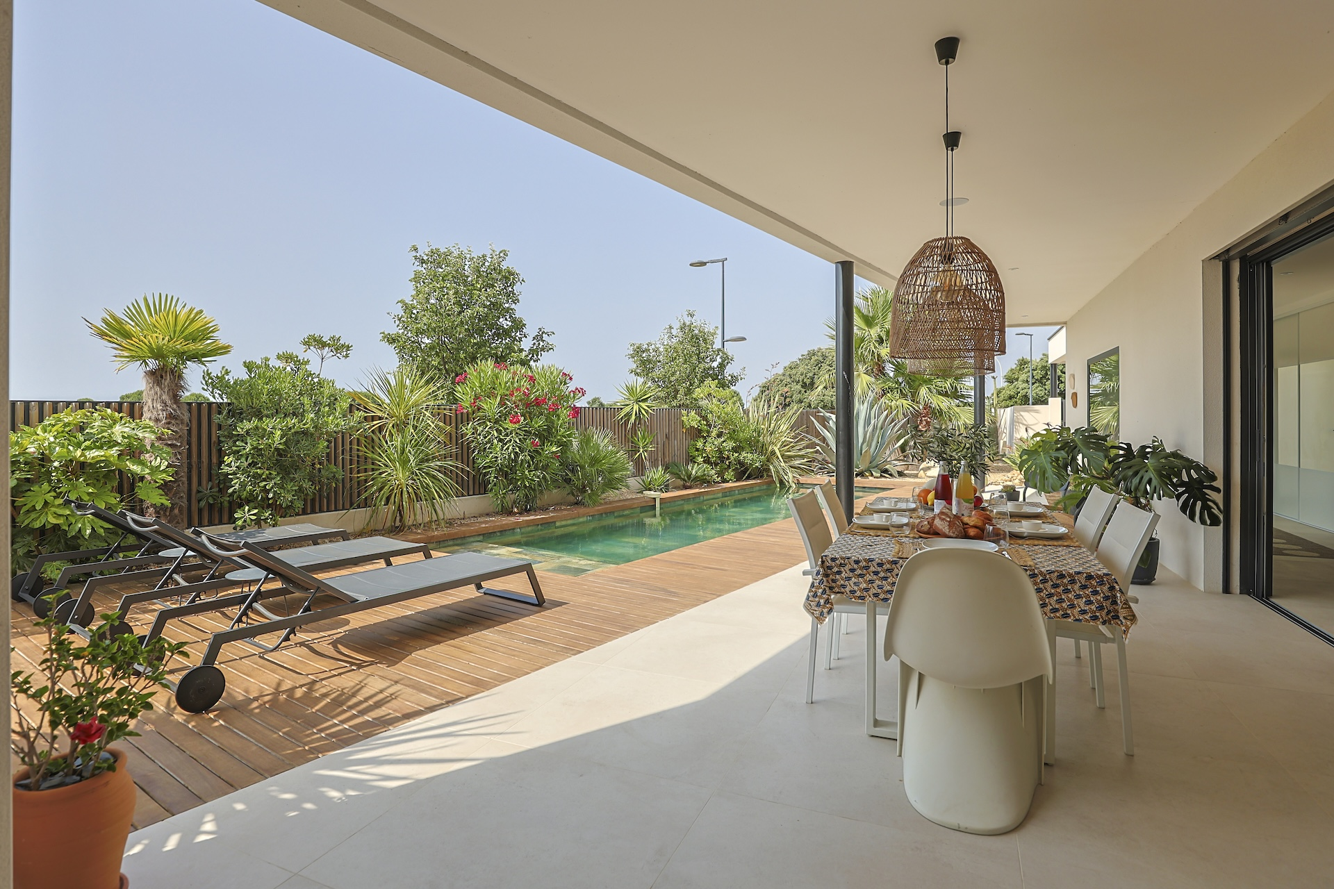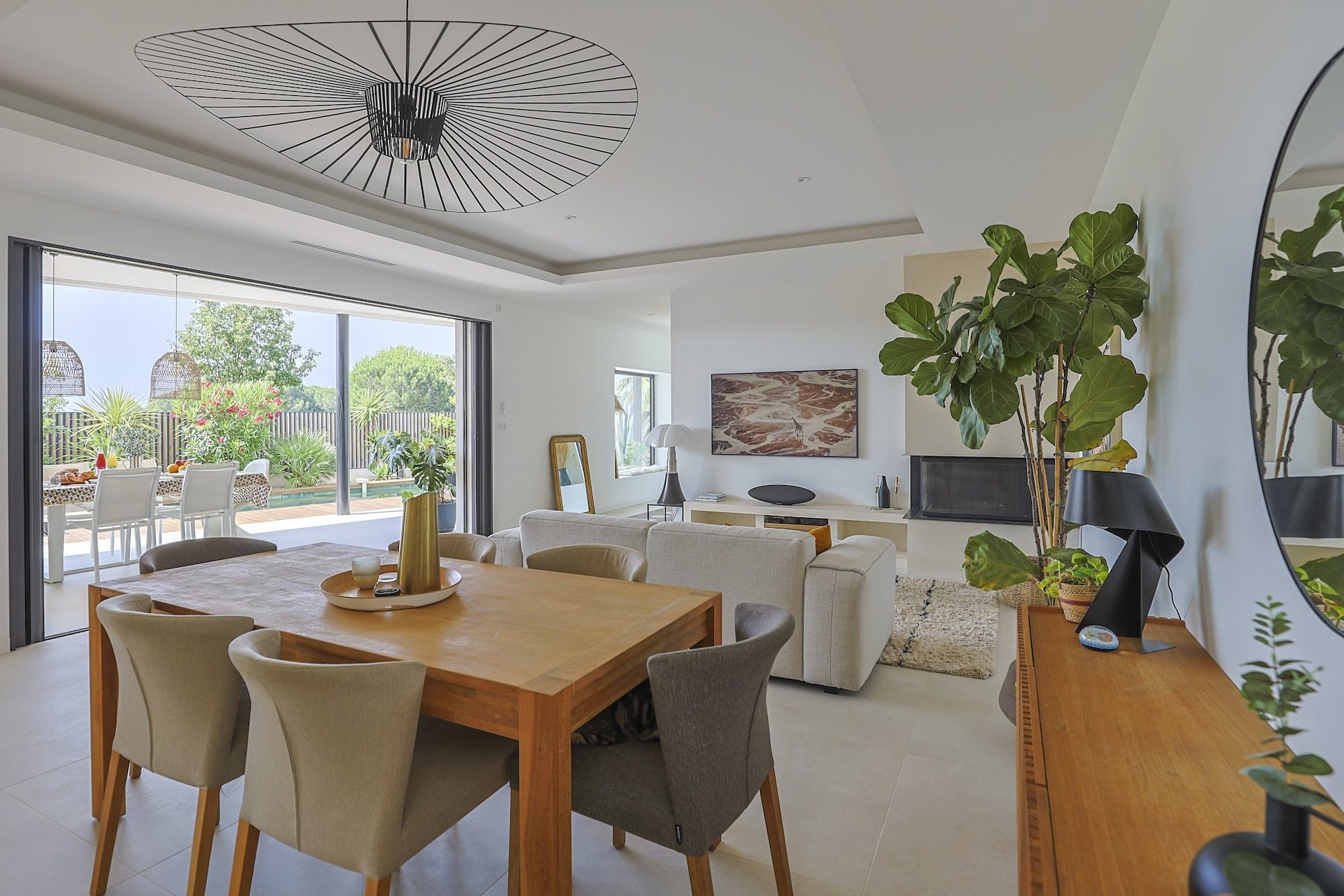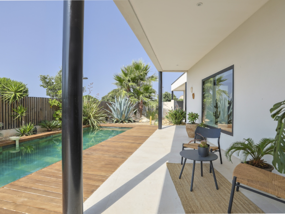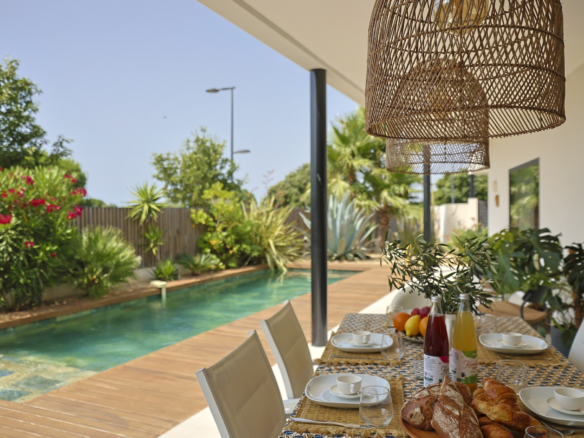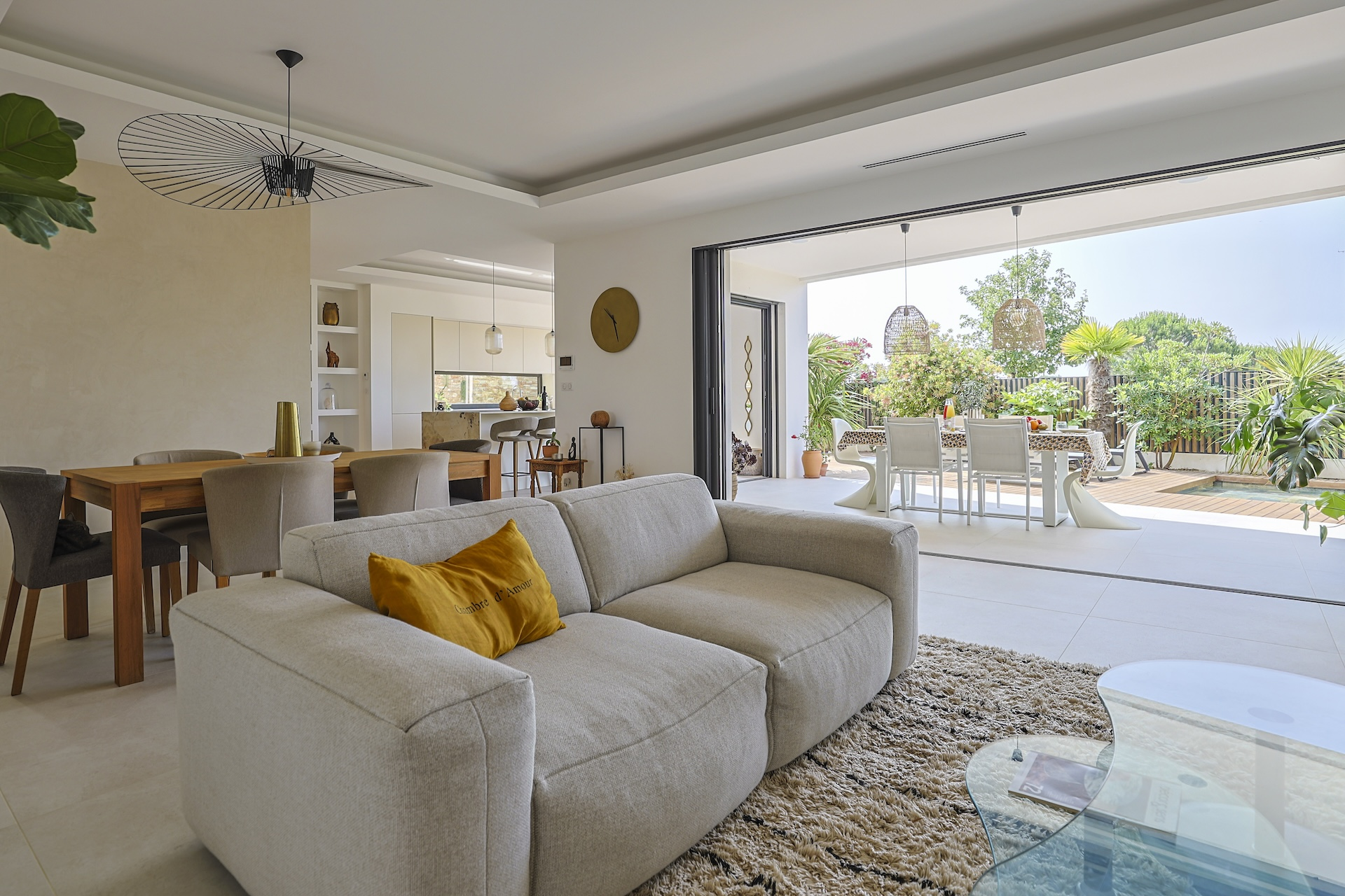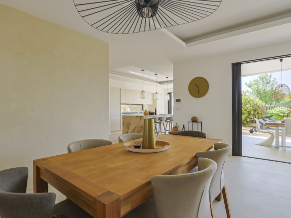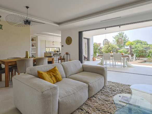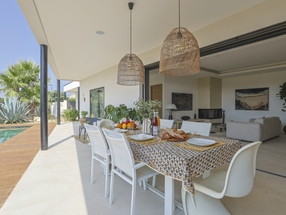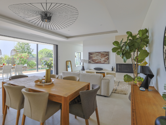 The fully equipped modern kitchen with central marble island is opening onto large bay windows overlooking the terrace and swimming pool. Between the living room and the kitchen is a rectangular dining table that can accommodate up to 8 people. Behind the kitchen is a hidden door accessing a technical room with laundry facilities. A beautiful covered terrace is directly looking at the pool and equipped with a dining table for 8 people and a Weber barbecue. This shaded area lets the air circulate for moments full of freshness.