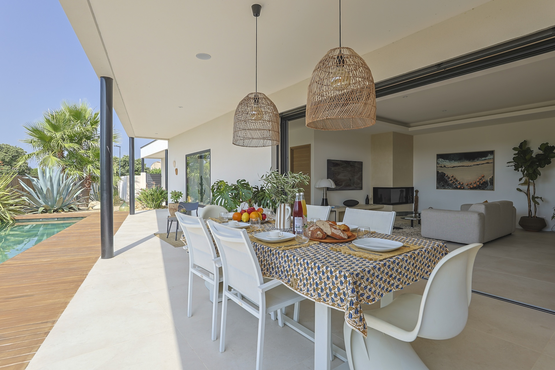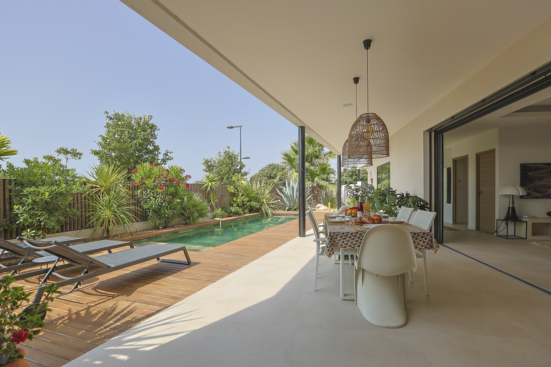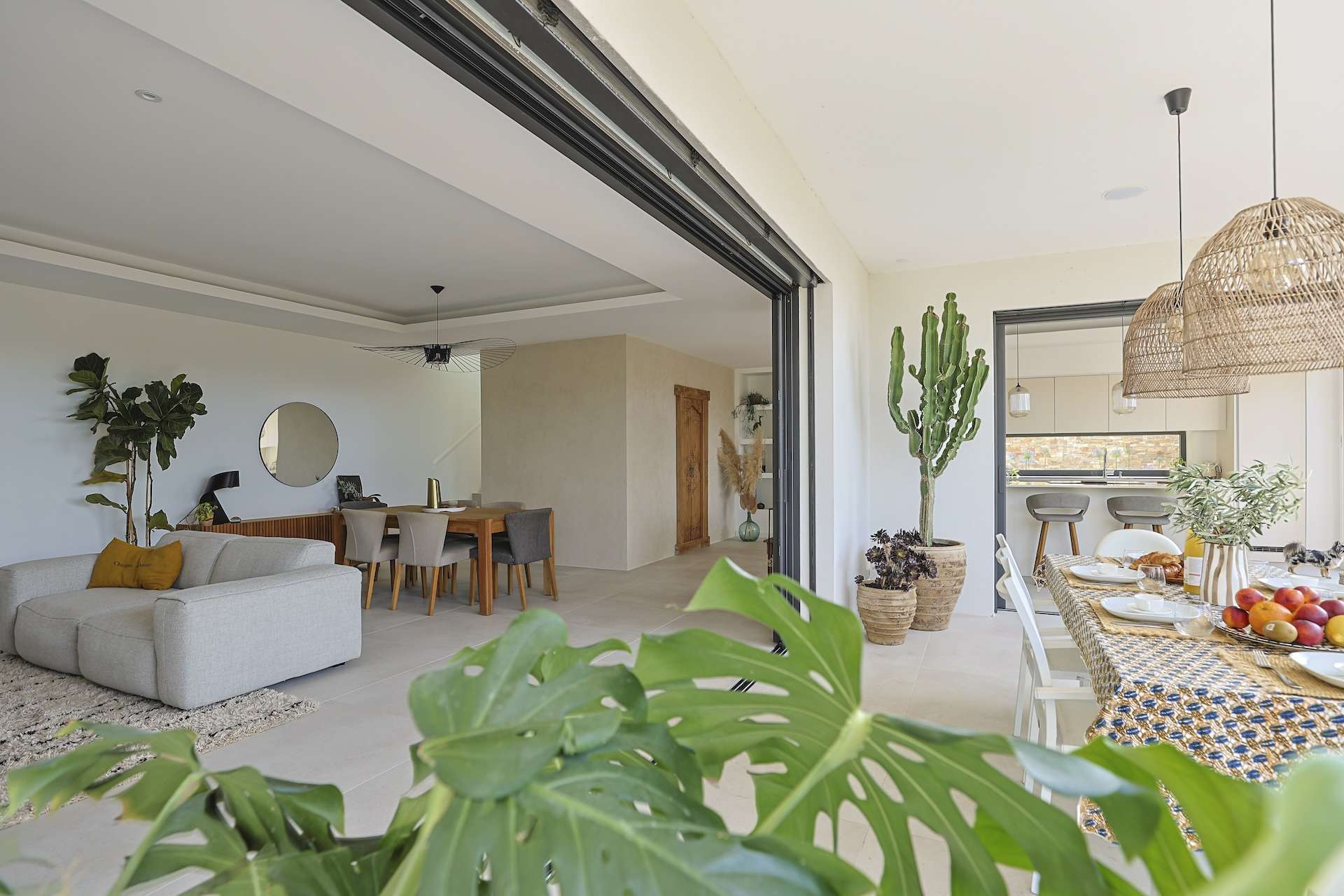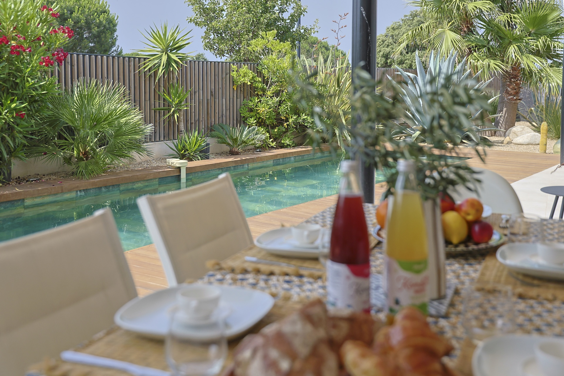 The fully equipped modern kitchen with central marble island is opening onto large bay windows overlooking the terrace and swimming pool. Between the living room and the kitchen is a rectangular dining table that can accommodate up to 8 people. Behind the kitchen is a hidden door accessing a technical room with laundry facilities. A beautiful covered terrace is directly looking at the pool and equipped with a dining table for 8 people and a Weber barbecue. This shaded area lets the air circulate for moments full of freshness.