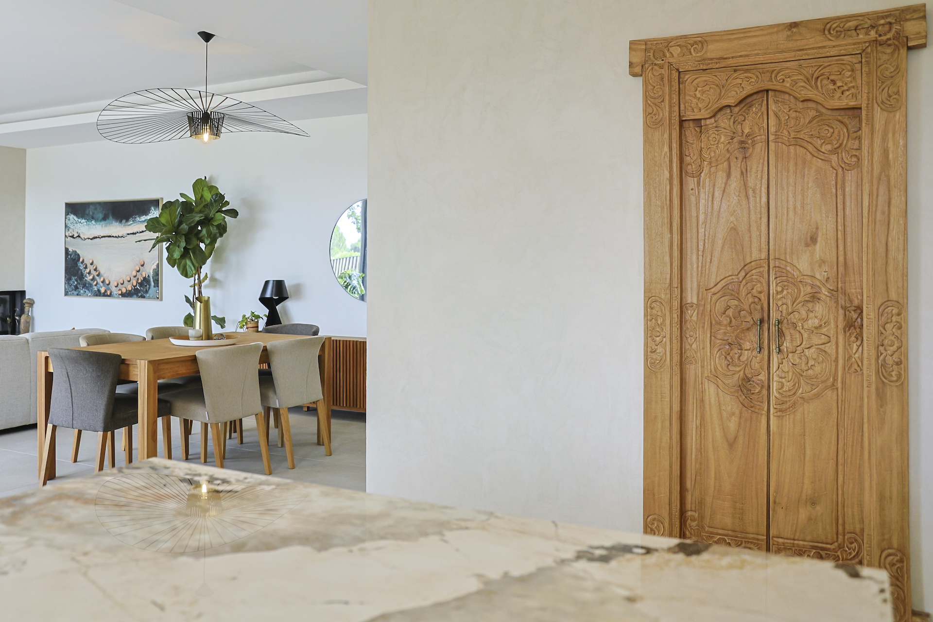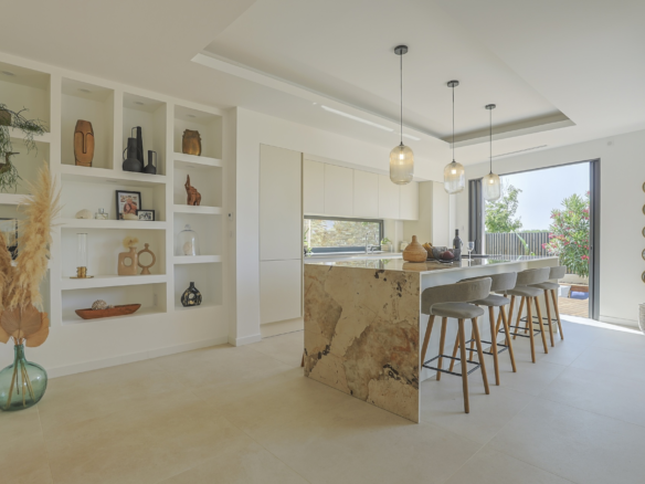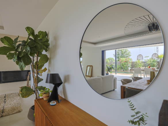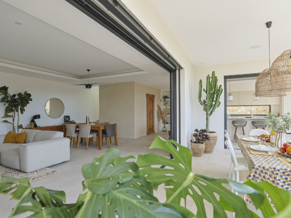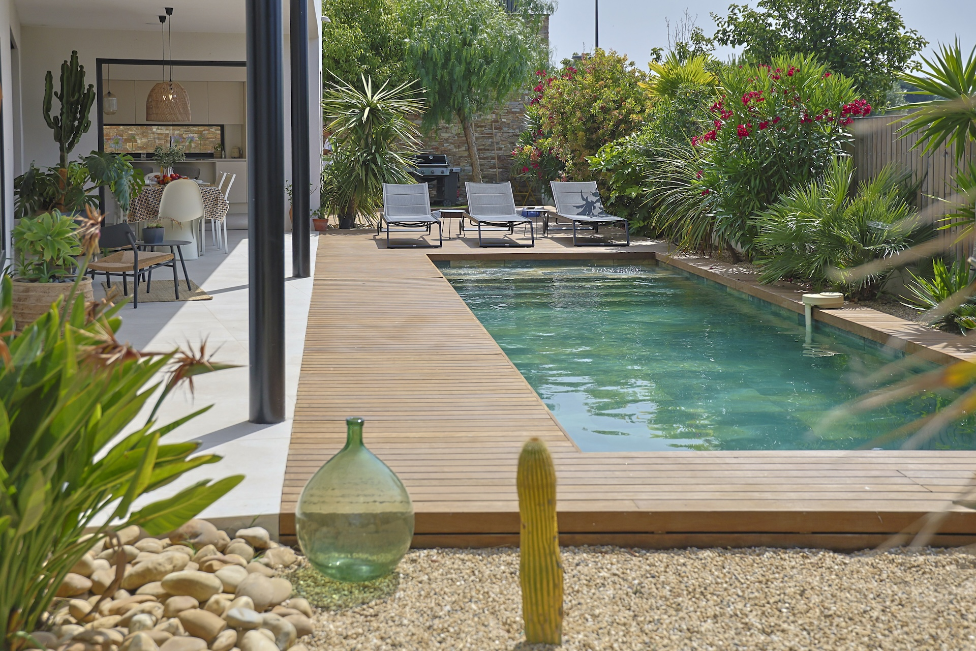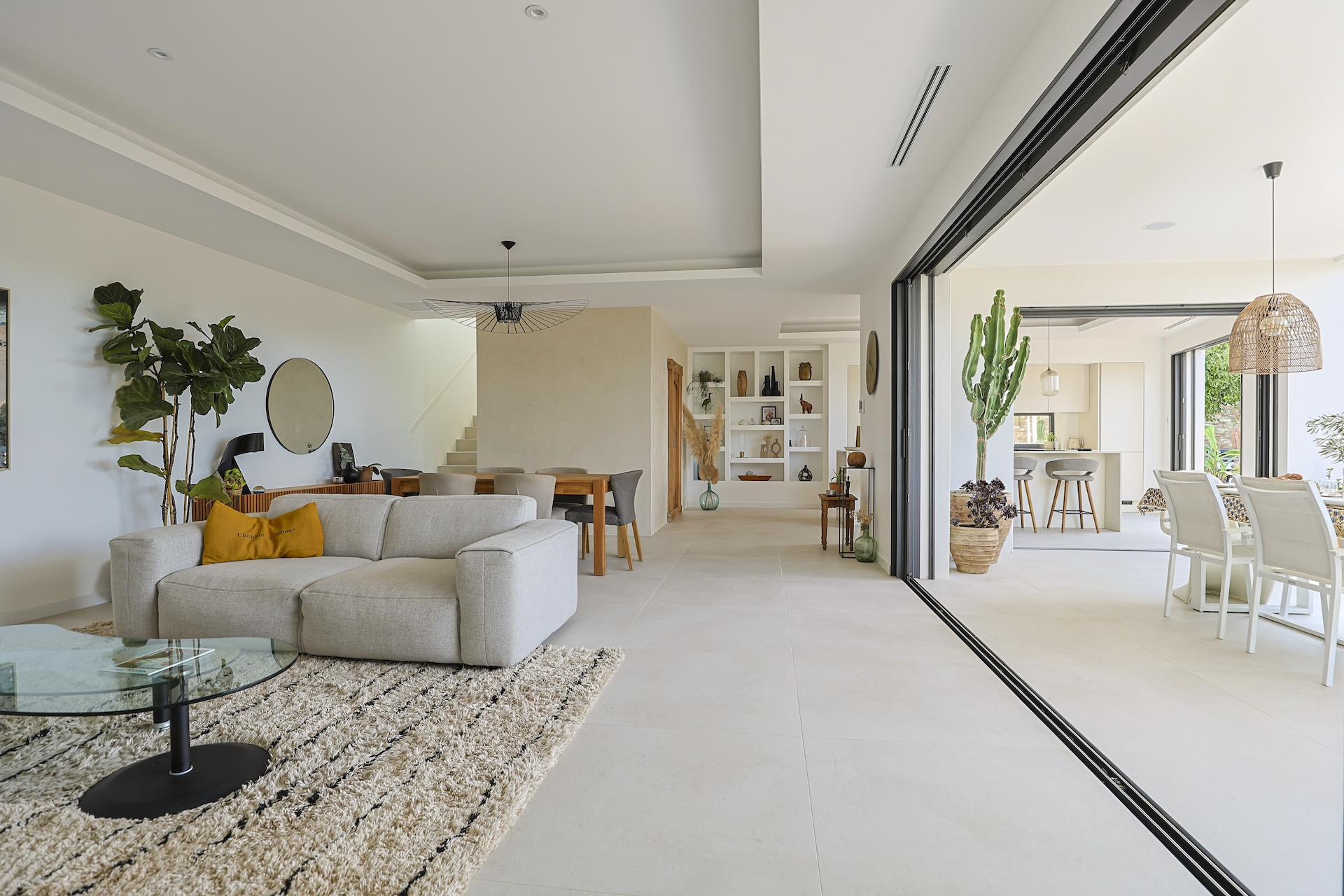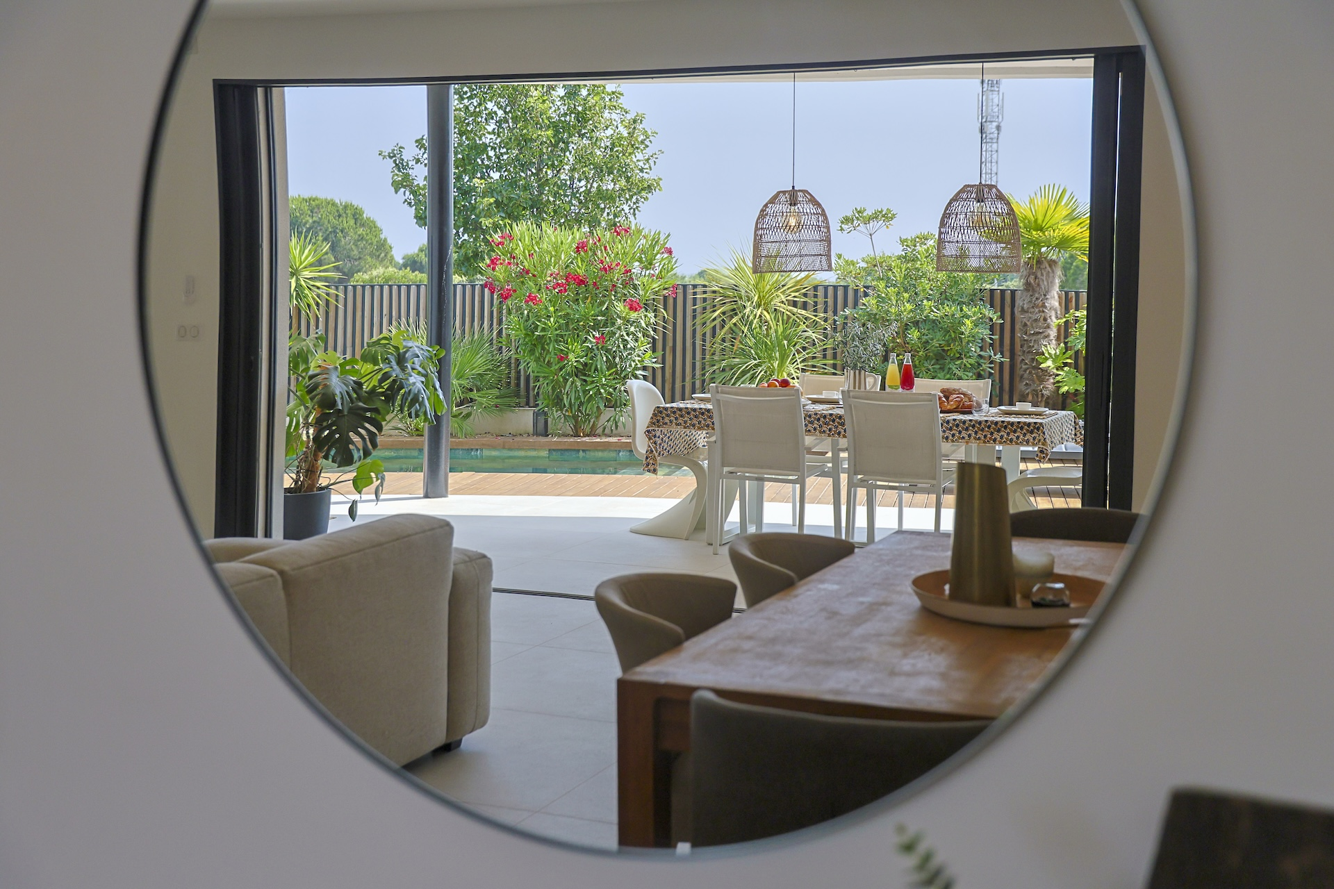 The fully equipped modern kitchen with central marble island is opening onto large bay windows overlooking the terrace and swimming pool. Between the living room and the kitchen is a rectangular dining table that can accommodate up to 8 people. Behind the kitchen is a hidden door accessing a technical room with laundry facilities. A beautiful covered terrace is directly looking at the pool and equipped with a dining table for 8 people and a Weber barbecue. This shaded area lets the air circulate for moments full of freshness.