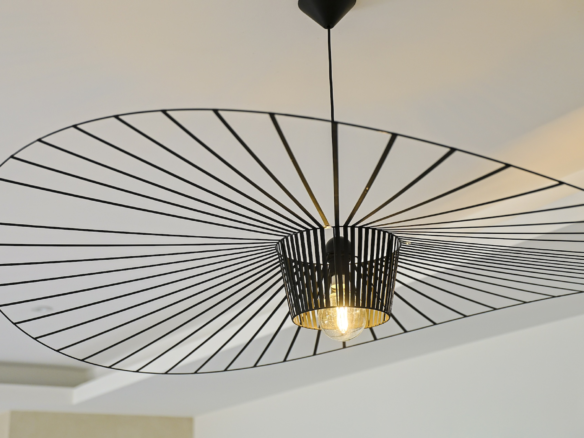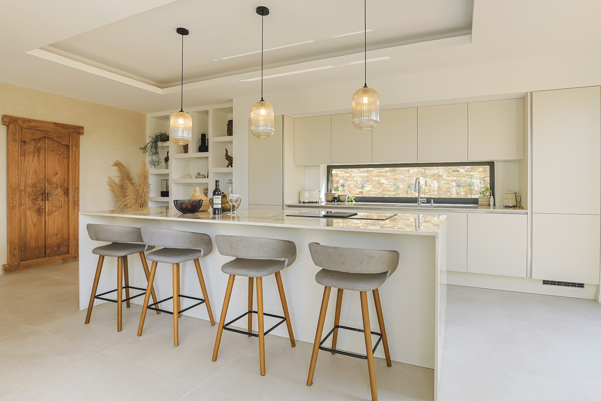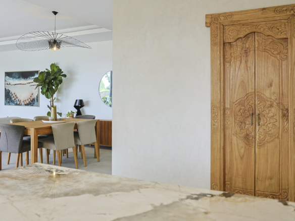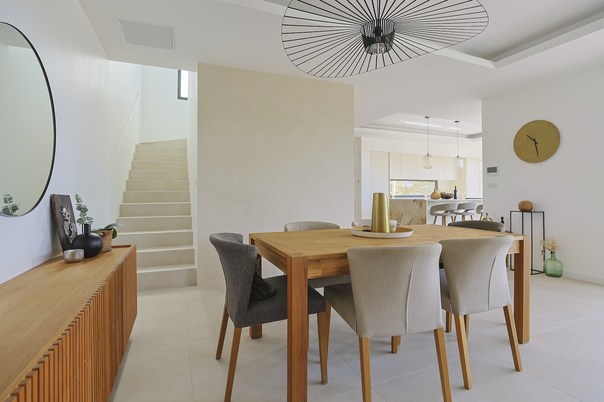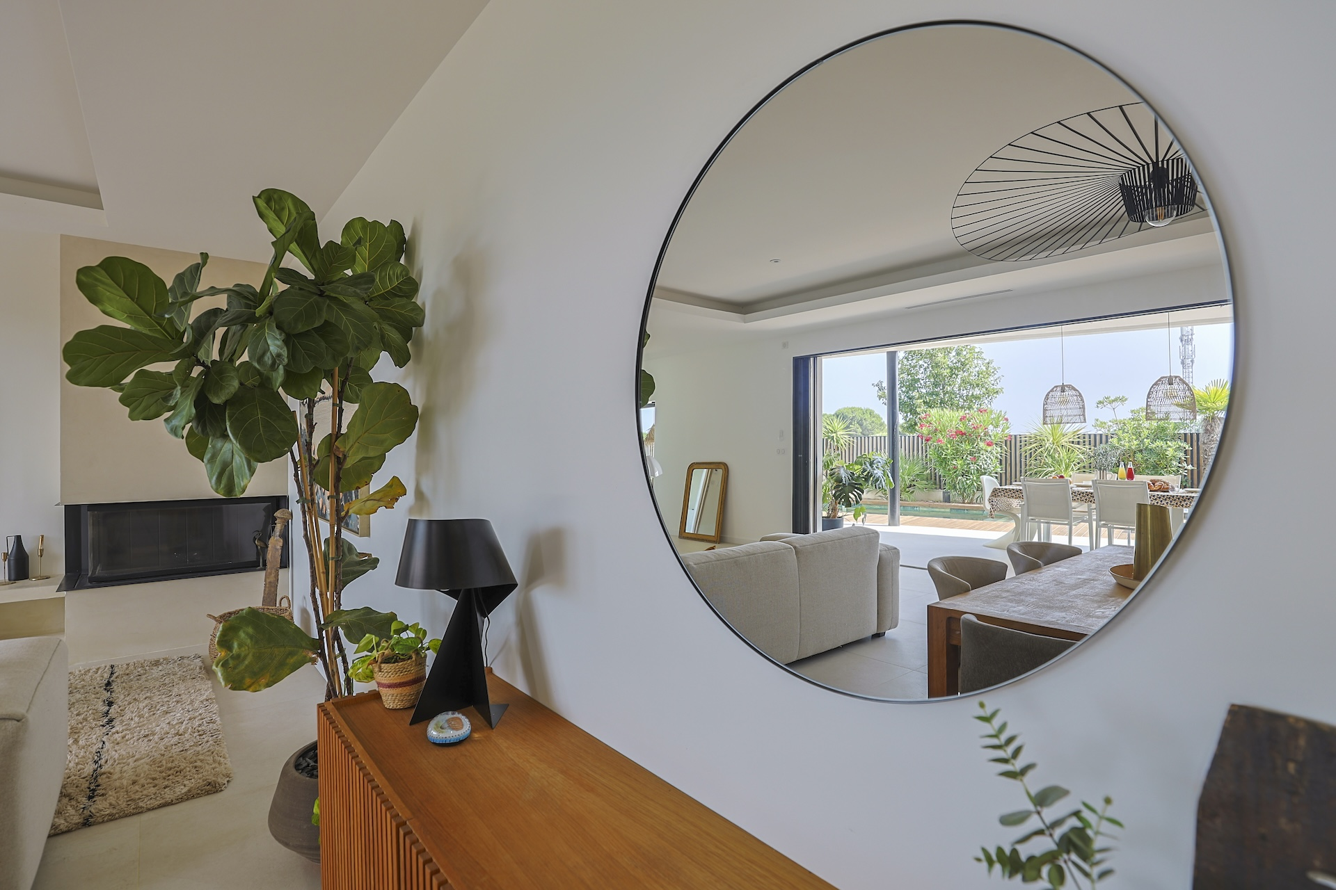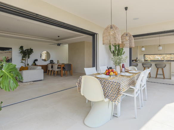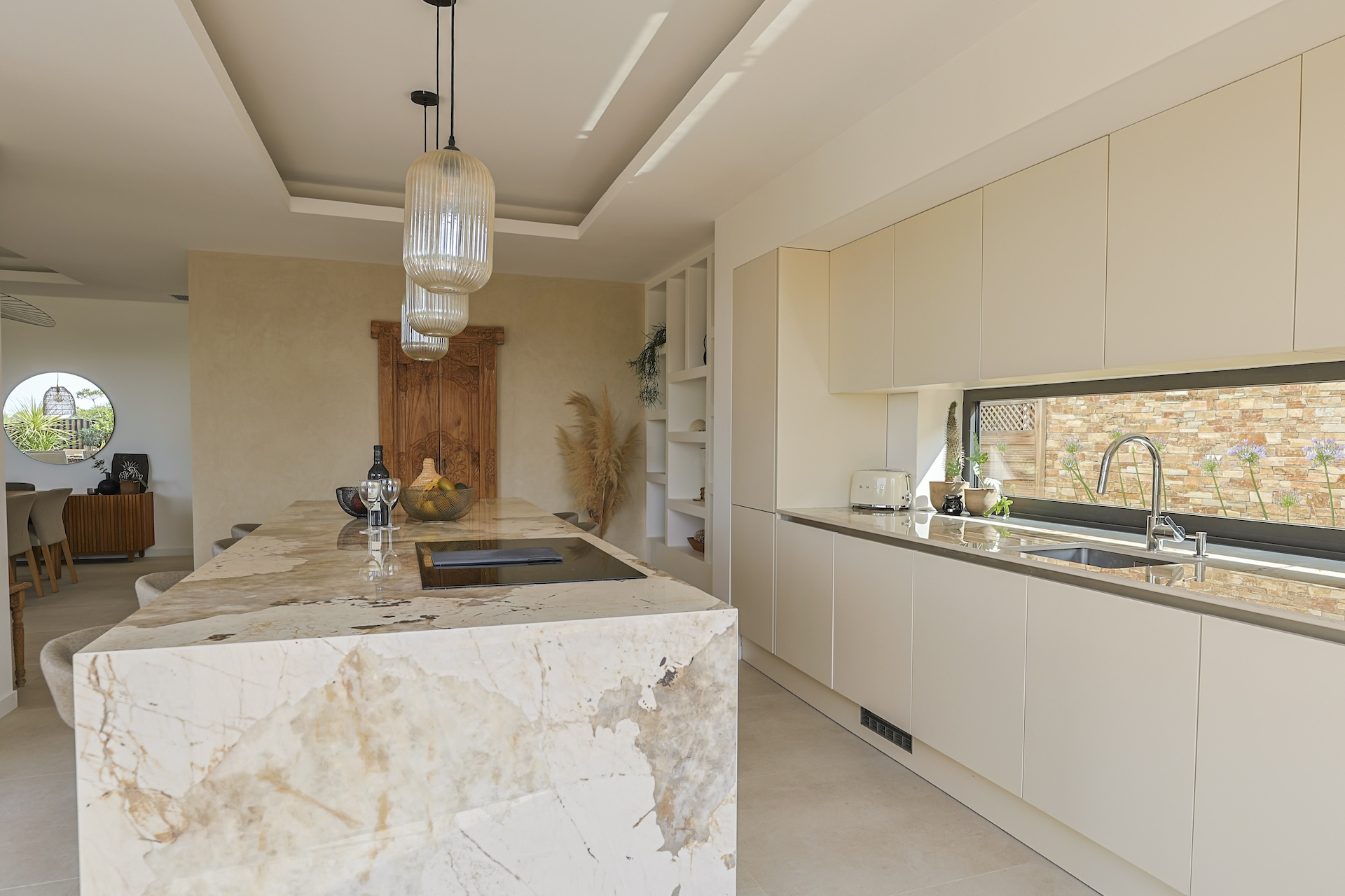 The fully equipped modern kitchen with central marble island is opening onto large bay windows overlooking the terrace and swimming pool. Between the living room and the kitchen is a rectangular dining table that can accommodate up to 8 people. Behind the kitchen is a hidden door accessing a technical room with laundry facilities. A beautiful covered terrace is directly looking at the pool and equipped with a dining table for 8 people and a Weber barbecue. This shaded area lets the air circulate for moments full of freshness.