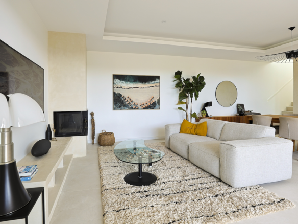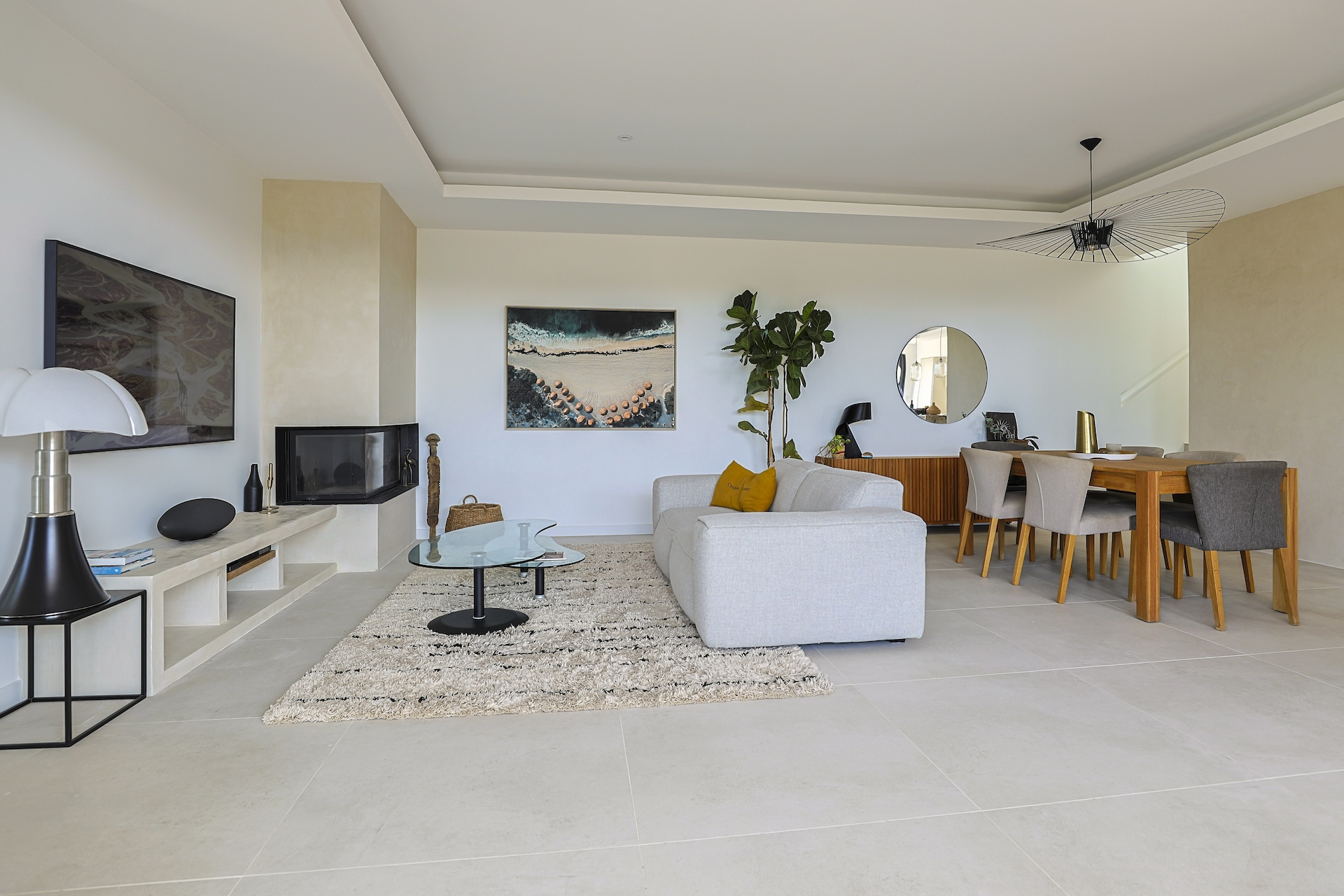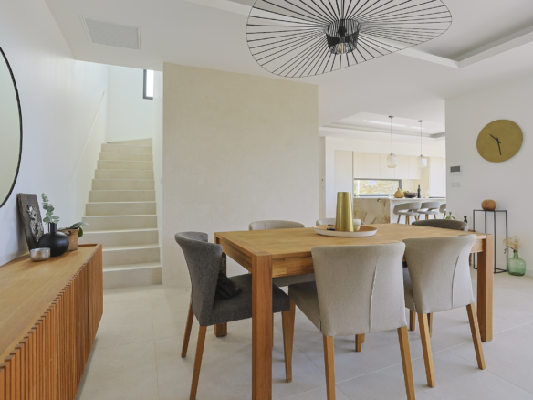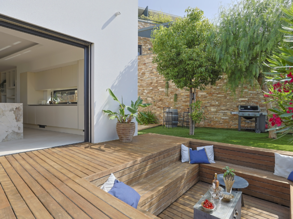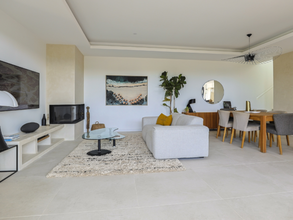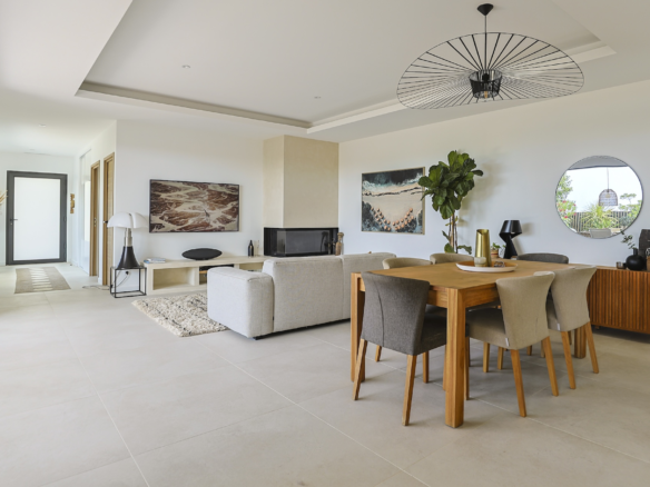 The ground floor is composed of a central spacious living room which opens through large bay windows onto a south facing teck wood terrace. Stylish electrical blinds can be used to cover these main bay windows during the hot summer days to keep the house cool. The main seating room is equipped with large sofa facing a beautiful fireplace and a large flat screen TV.