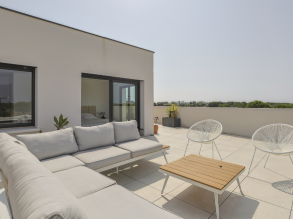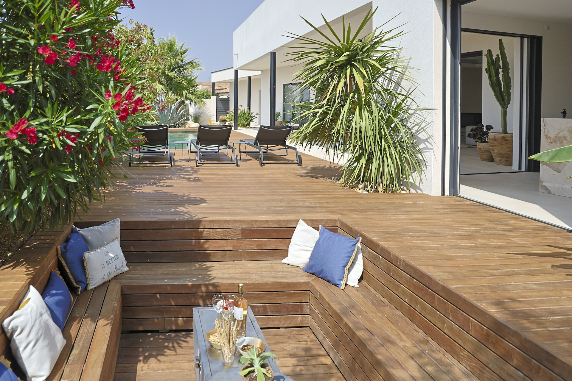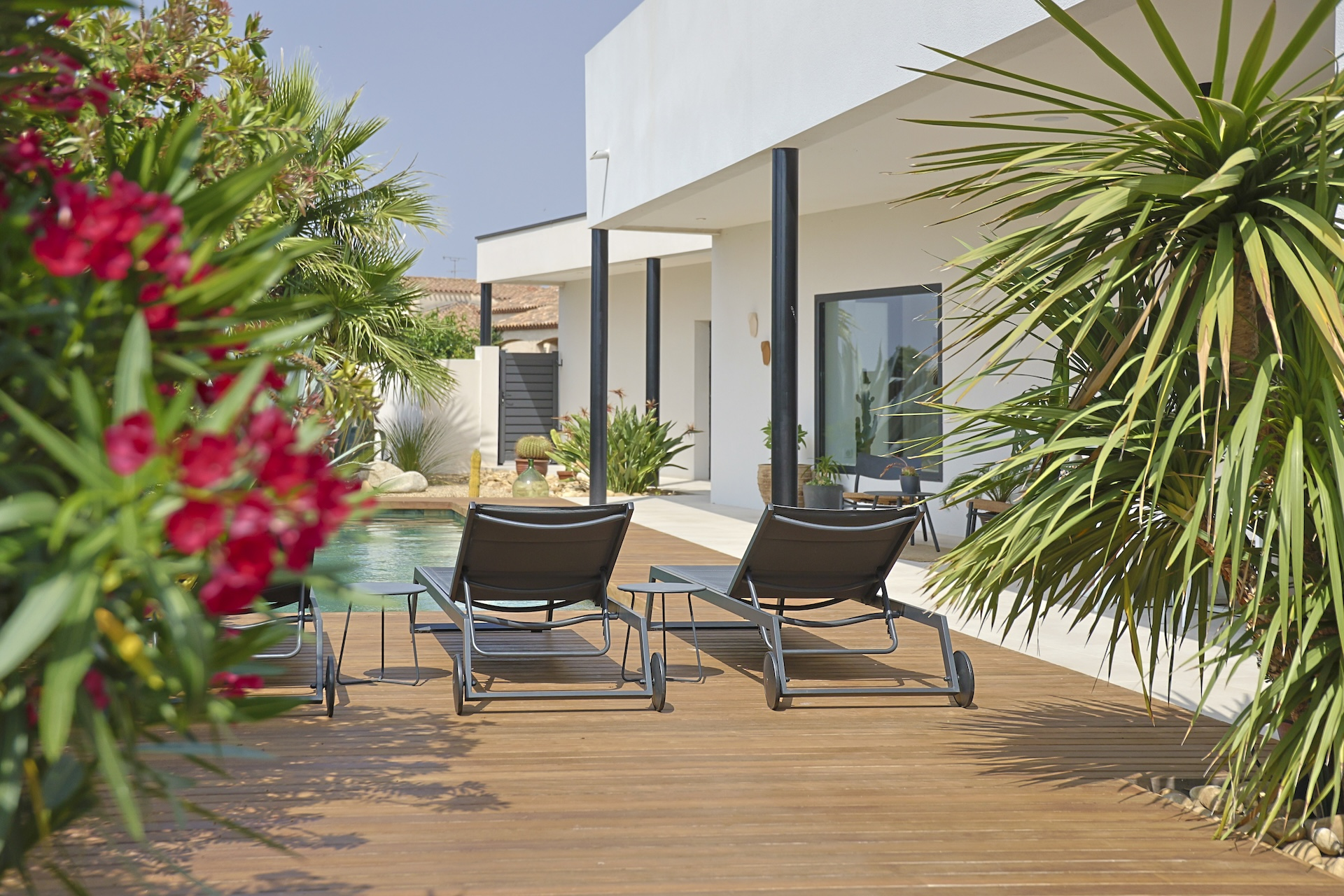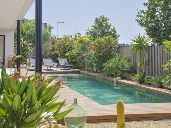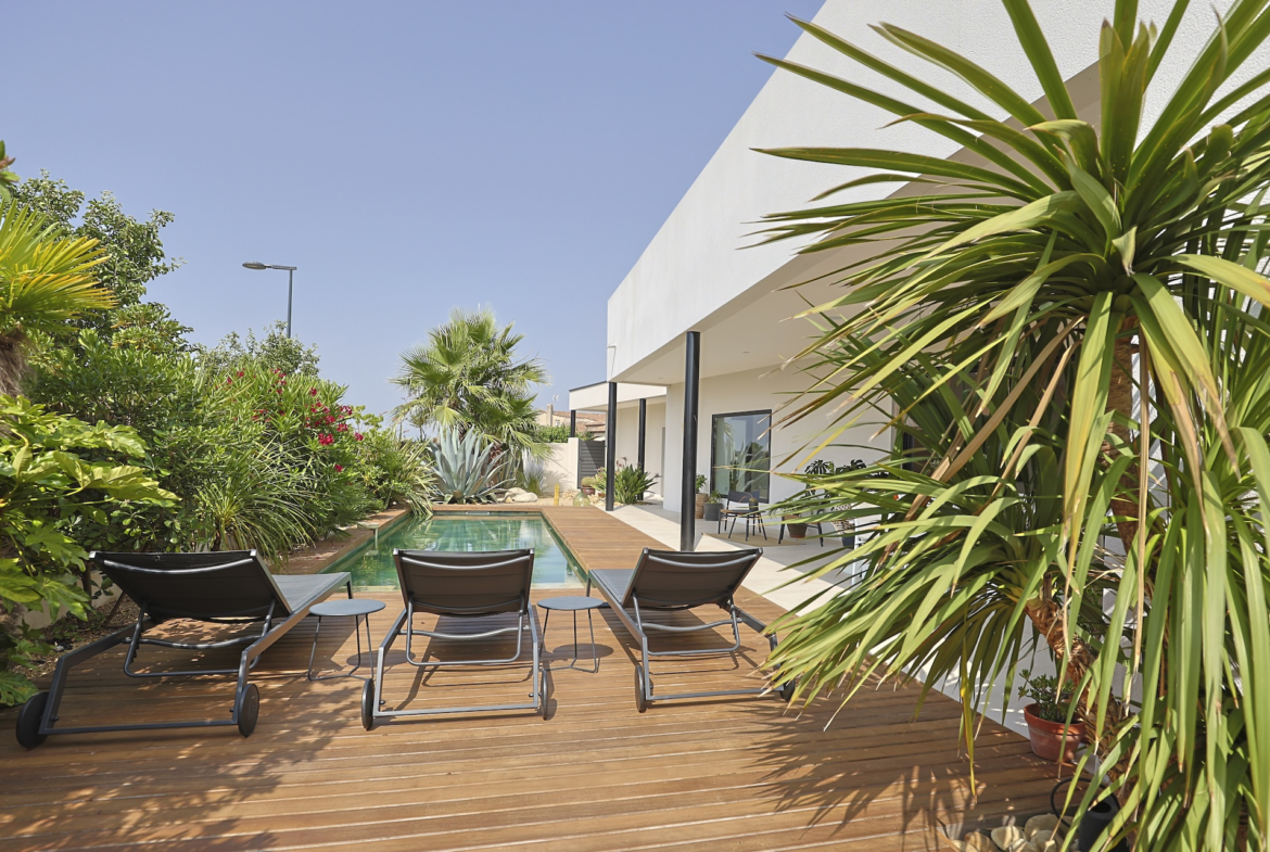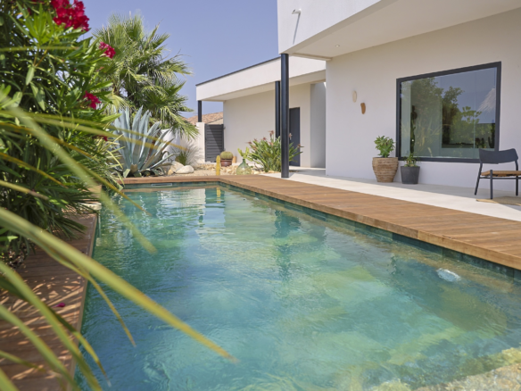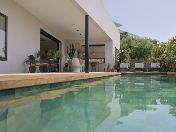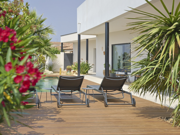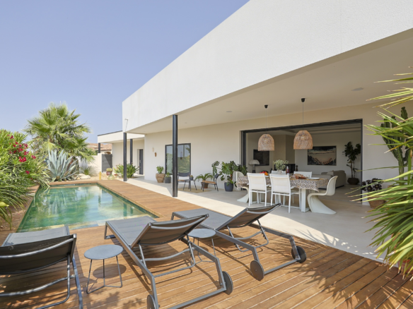 Villa Azura is a contemporary villa located in a quiet residential area of the small village of Pérols, just a few steps away from the beaches. This villa, fully equipped with air-conditionning, has just been built by its owners to the highest standards and decorated with stylised interiors.