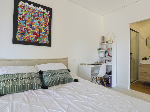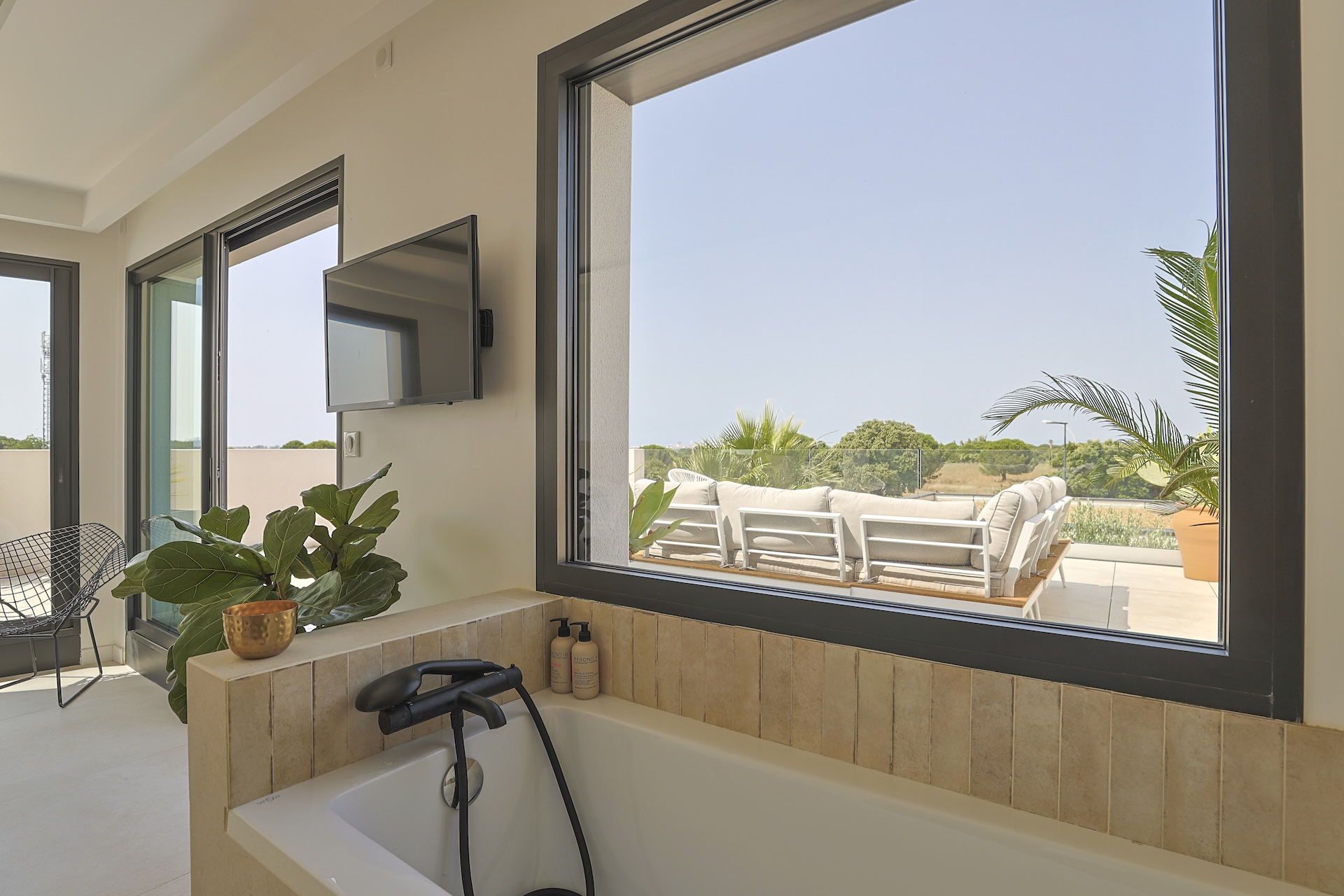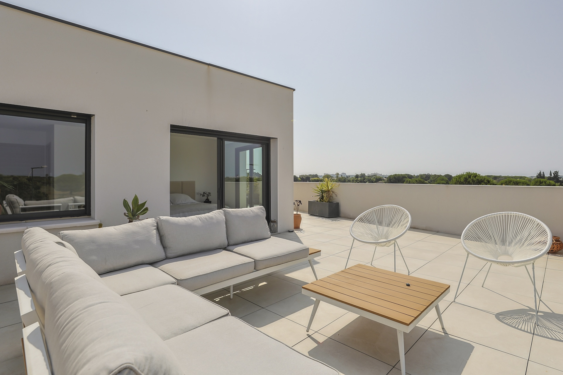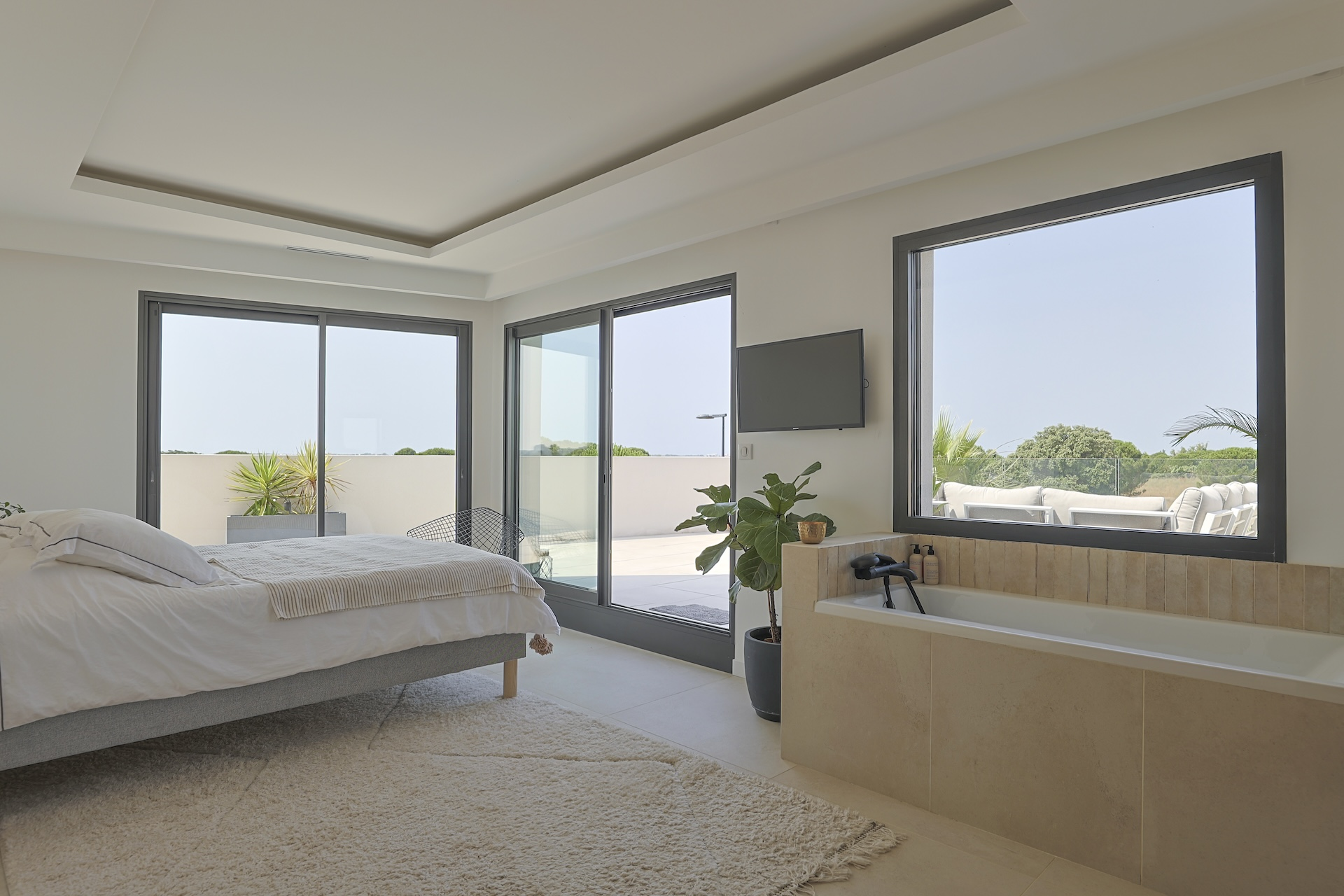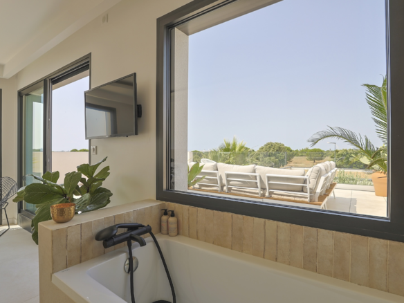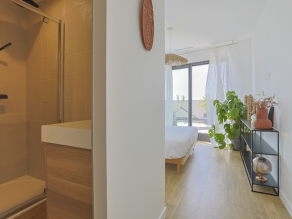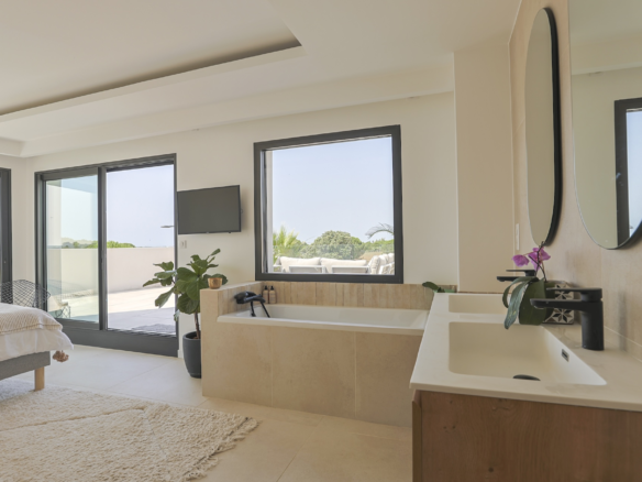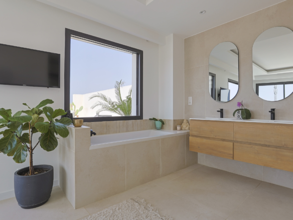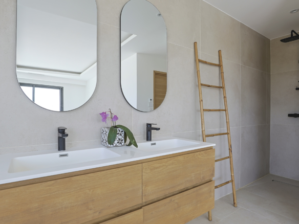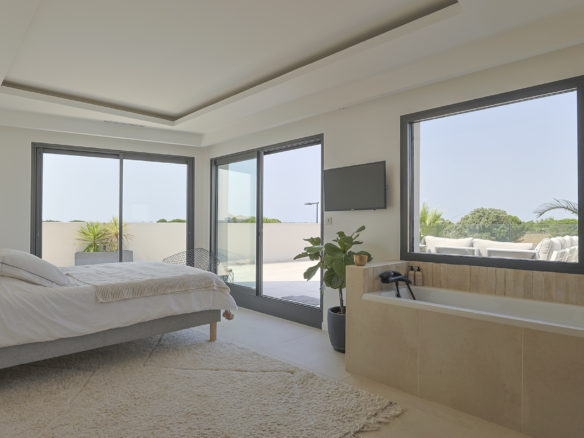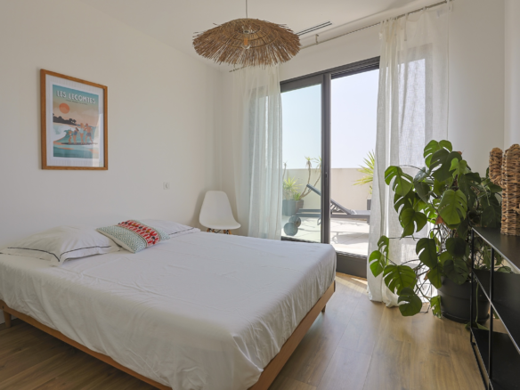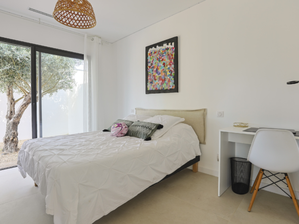 Accessible via an open staircase, the first floor of the house is composed of 3 bedrooms, two identical double bedrooms with 140x200cm beds, one shower room and one master bedroom suite with a 160×200 m2 bed and an open contemporary bathroom with bath and shower. The master bedroom is facing a panoramic roof terrace with a seating area.