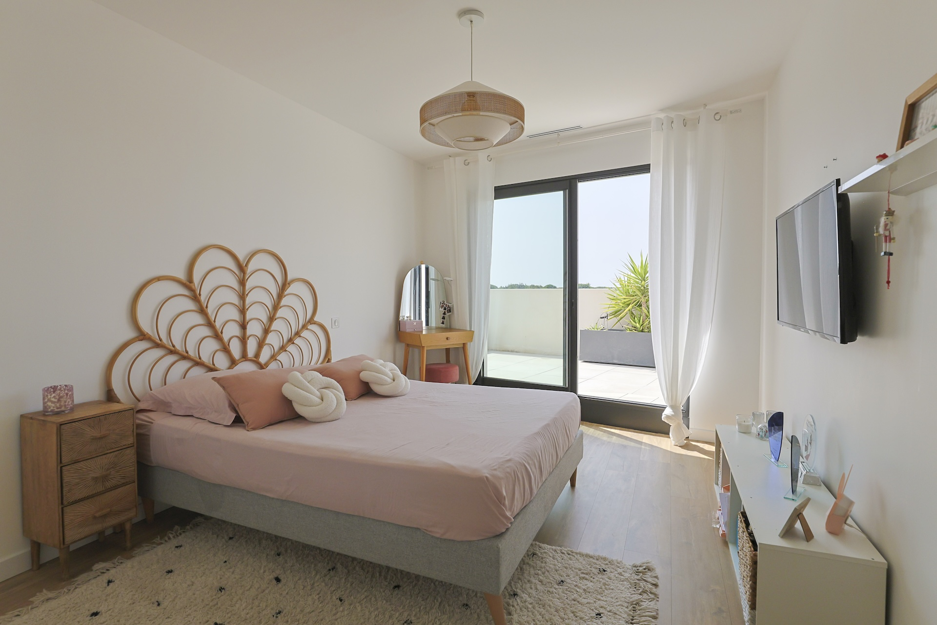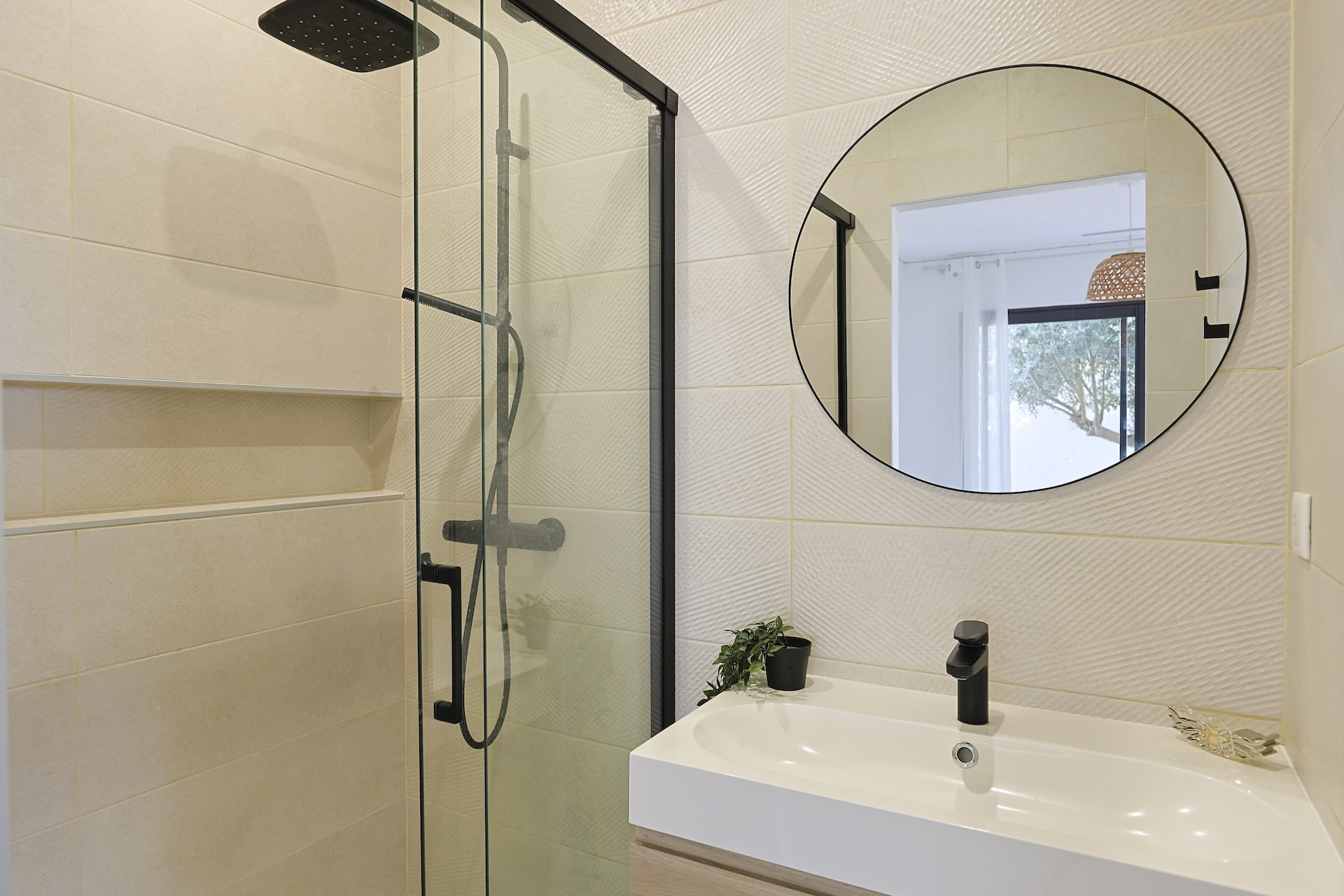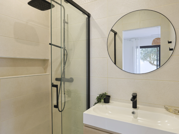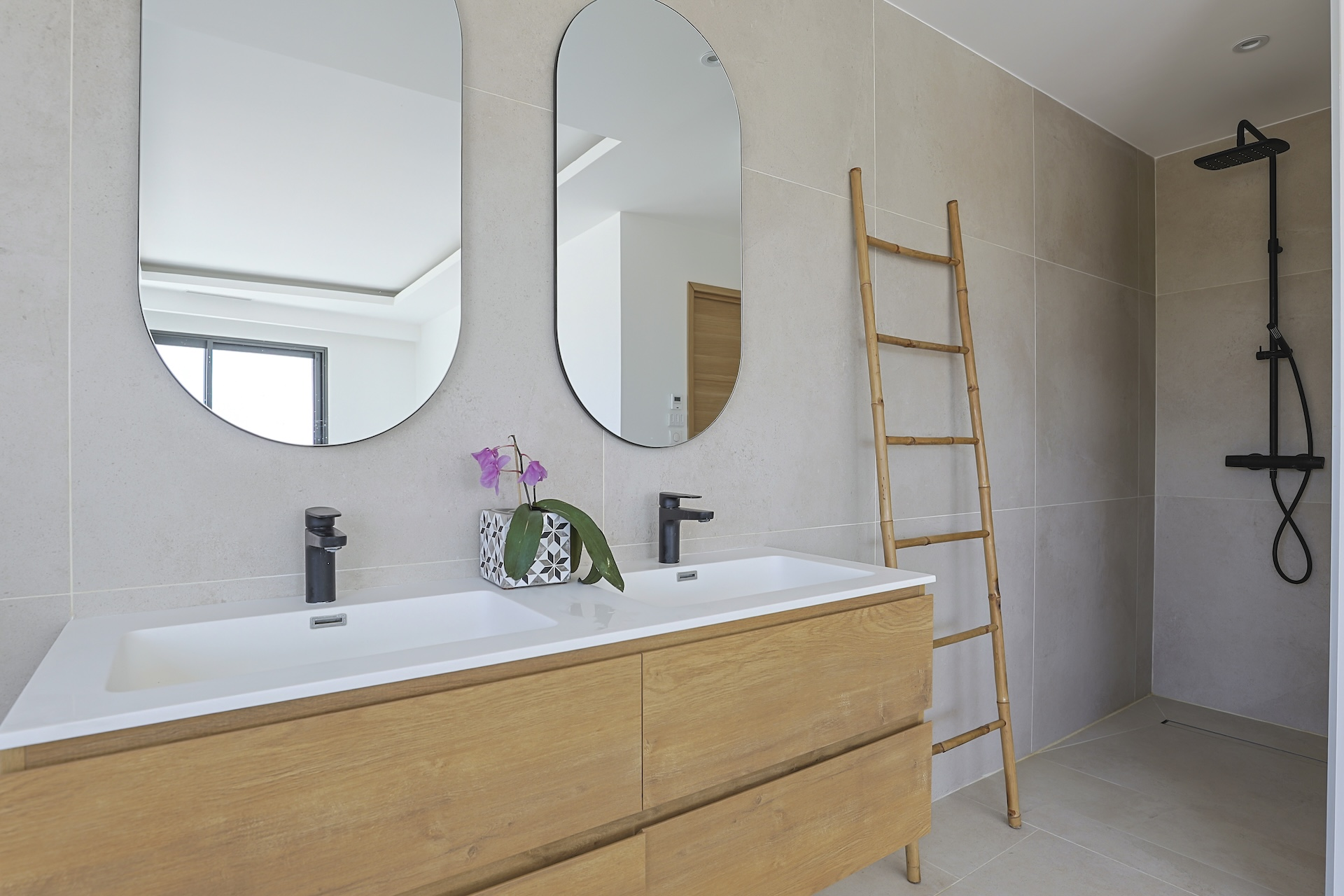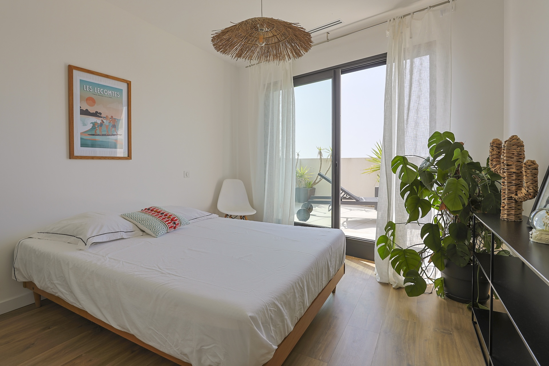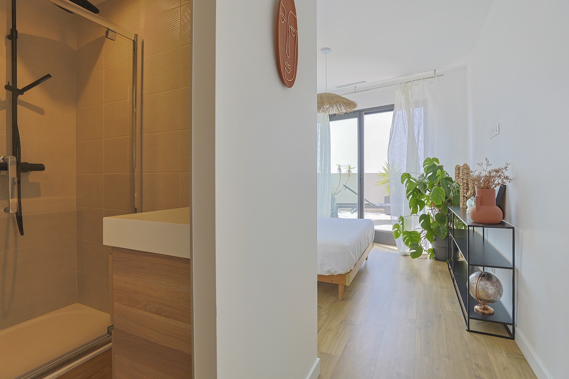 Accessible via an open staircase, the first floor of the house is composed of 3 bedrooms, two identical double bedrooms with 140x200cm beds, one shower room and one master bedroom suite with a 160×200 m2 bed and an open contemporary bathroom with bath and shower. The master bedroom is facing a panoramic roof terrace with a seating area.