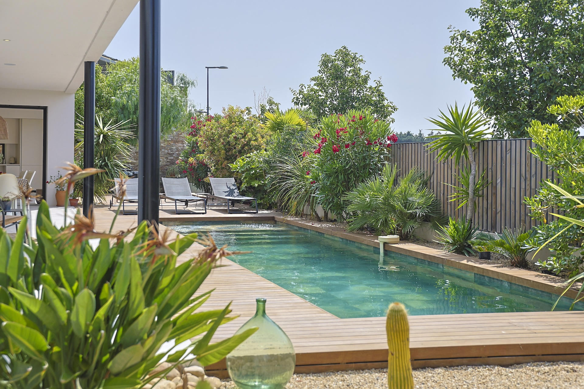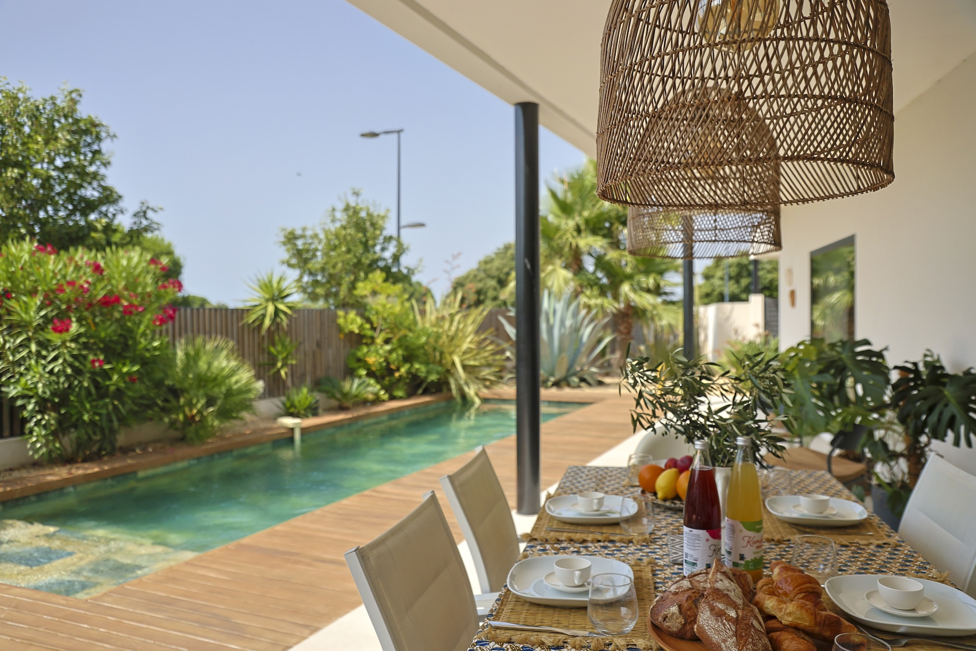 The 450m2 garden of this villa has been beautifully planted with exotic trees such as palm trees, banana trees, and eucalyptus and aloe vera which bring a subtle shade at different times of the day. It is organised around the magnificent swimming pool (10×2.5×1.35meters) and a teck wood terrace surrounding the pool.