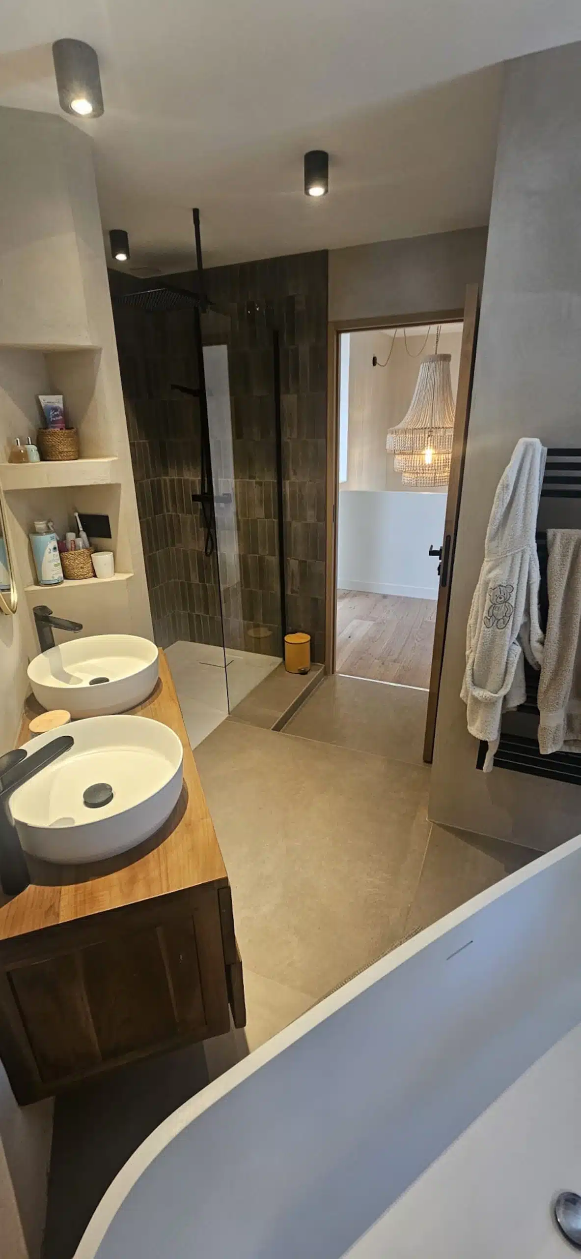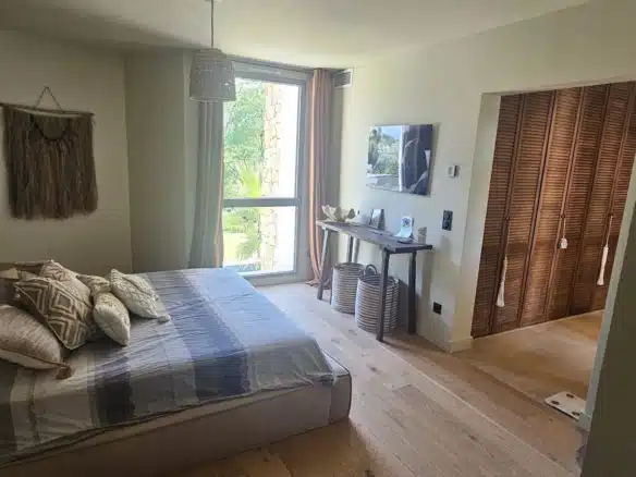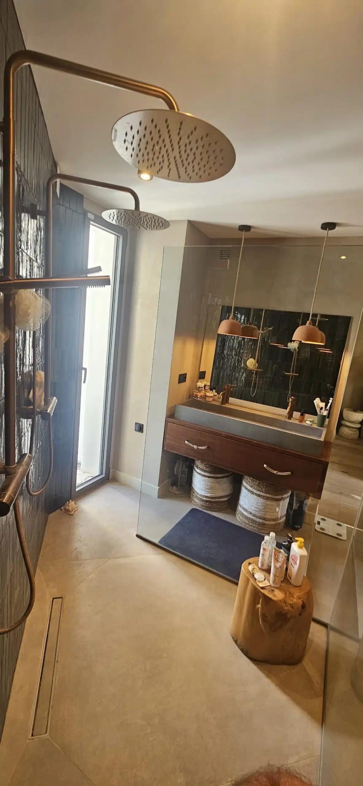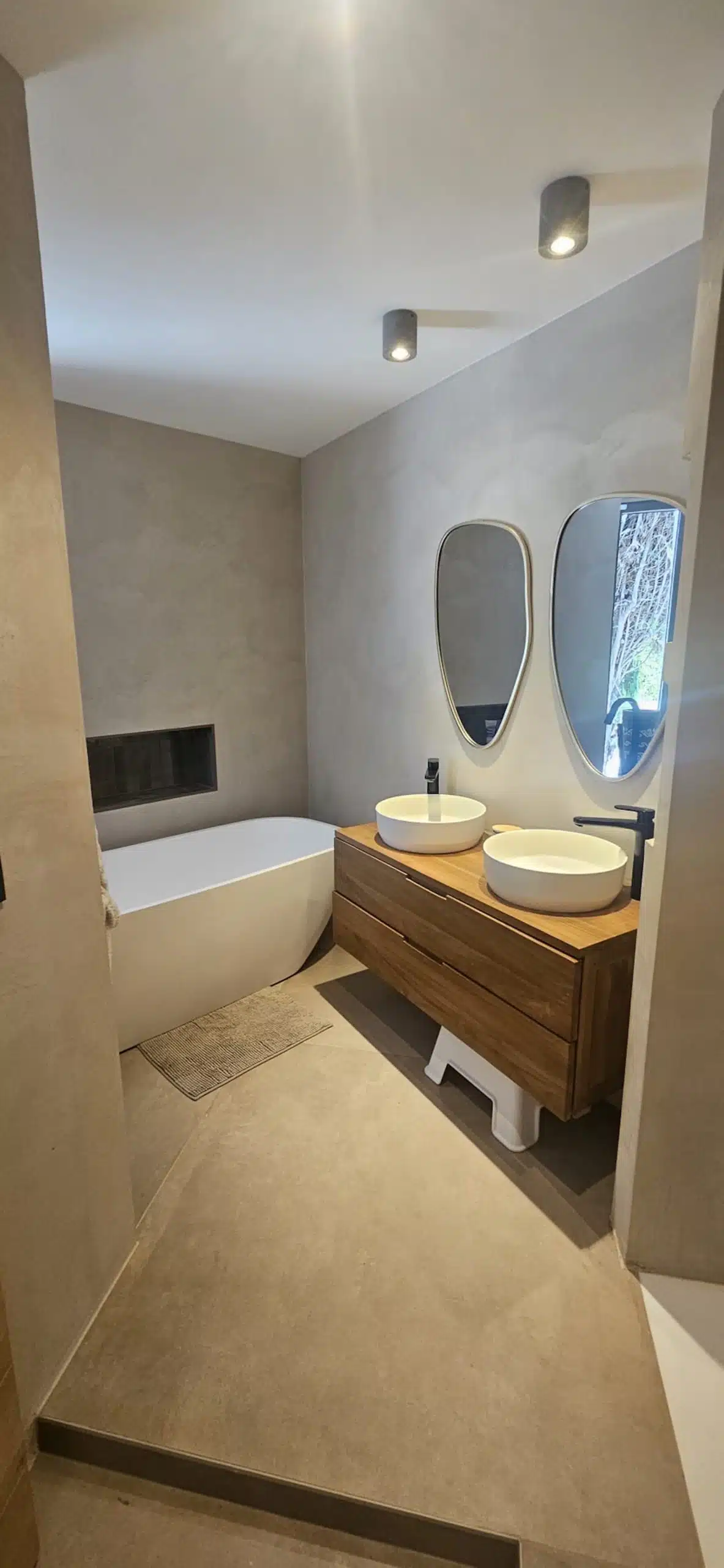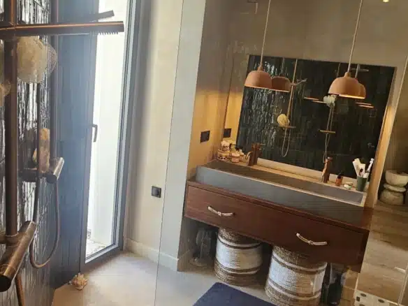 Five bedrooms, each styled with simplicity and comfort in mind, provide accommodation for up to ten guests. Three bedrooms feature king-size beds with quality linens, while two offer twin beds, making them versatile for friends or family. Four modern bathrooms combine practicality with a spa-like feel, using a mix of natural finishes and contemporary fixtures.