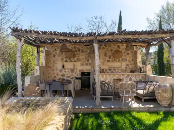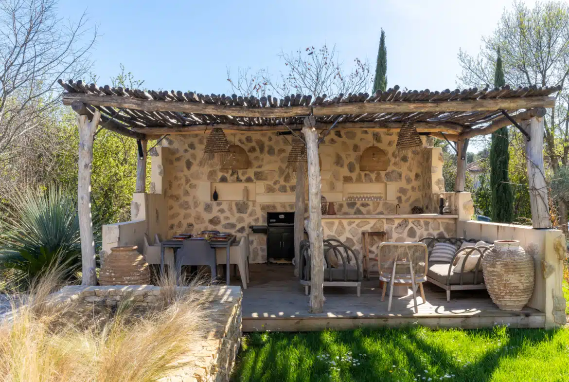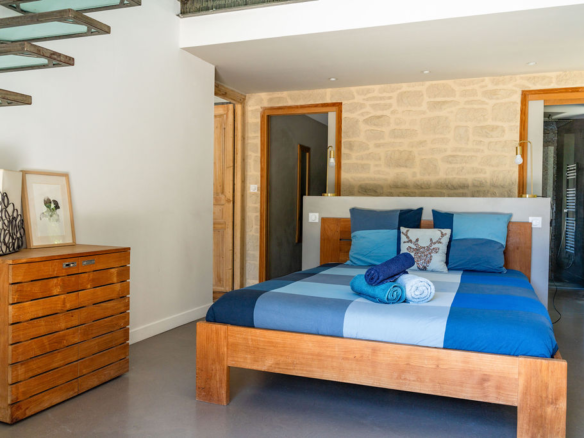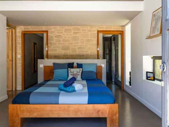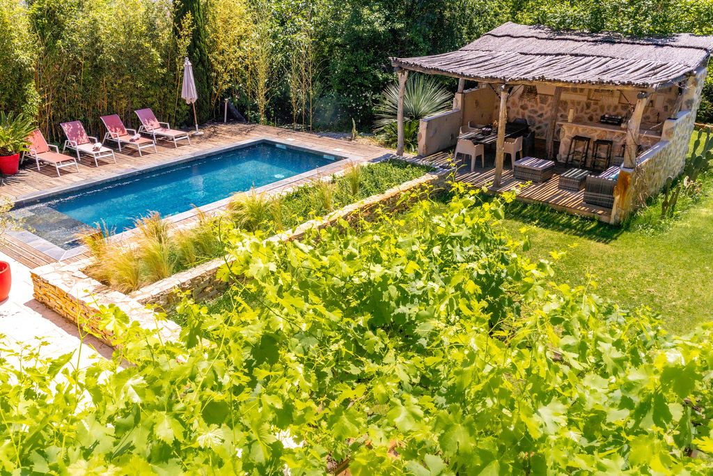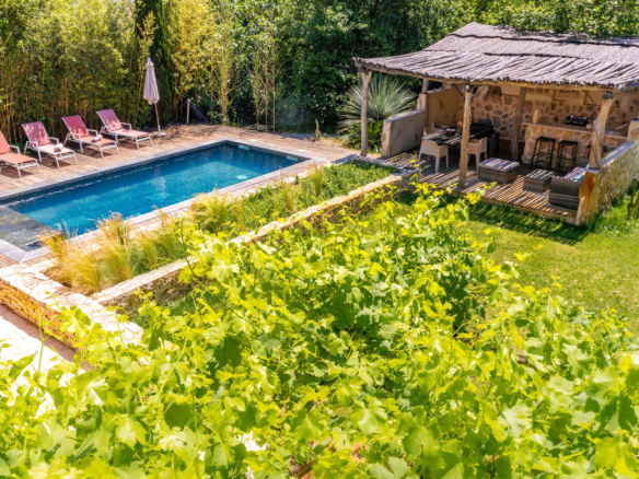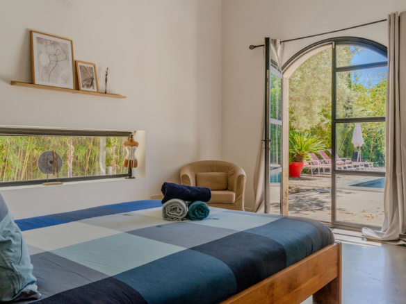 Upstairs, three beautifully appointed double bedrooms await. One features a private shower room, while the other two share a spacious bathroom. Each bedroom enjoys serene views of the pool and garden, offering a tranquil retreat for restful nights. The villa also includes a wine cellar in the basement, a treat for connoisseurs, and a small bike garage on the side of the house, perfect for those looking to explore the surrounding area.