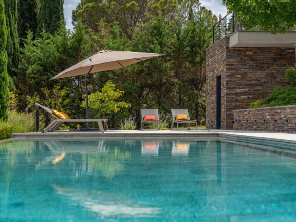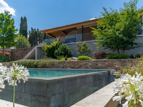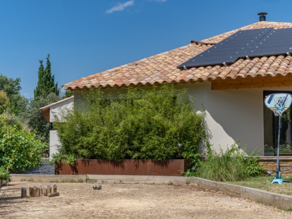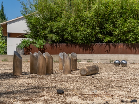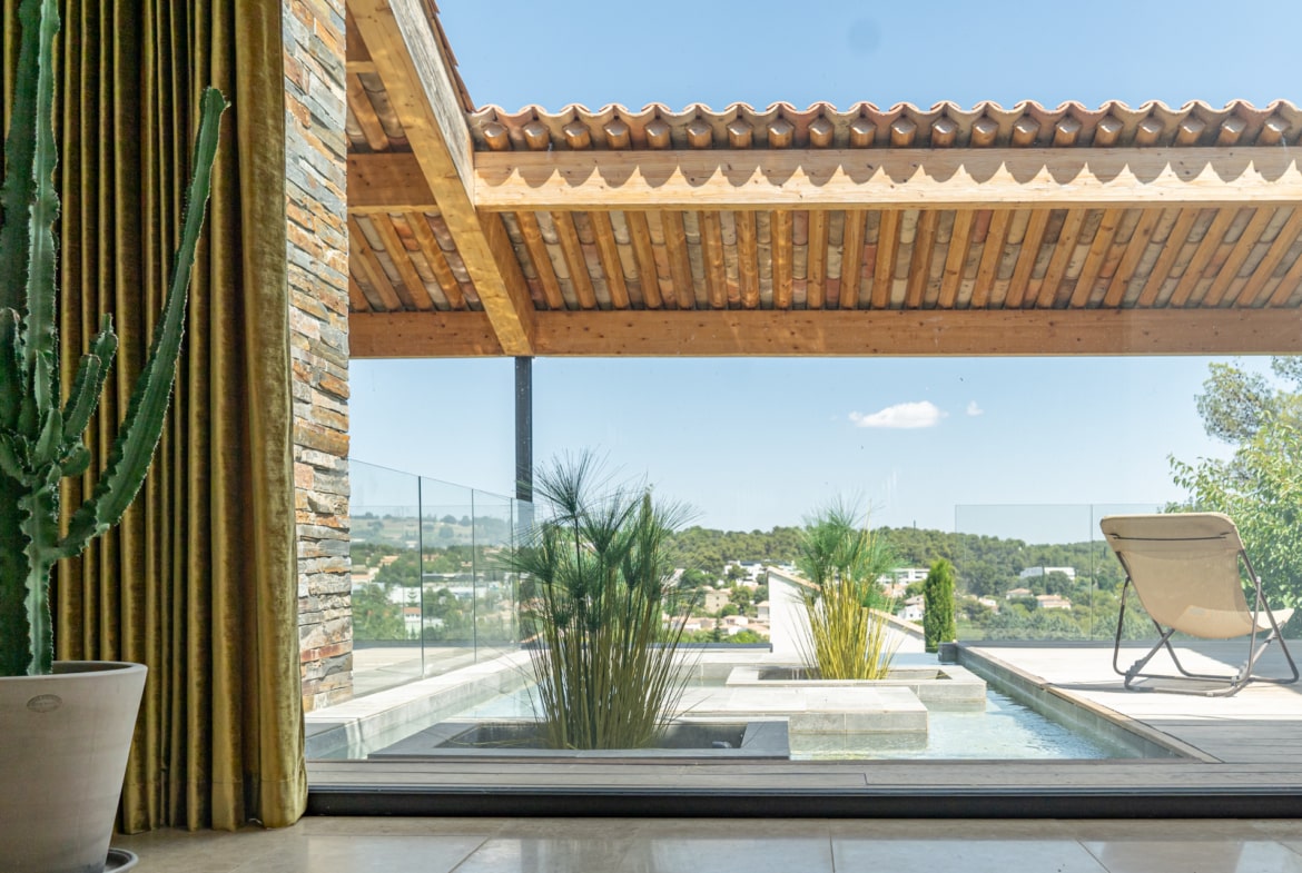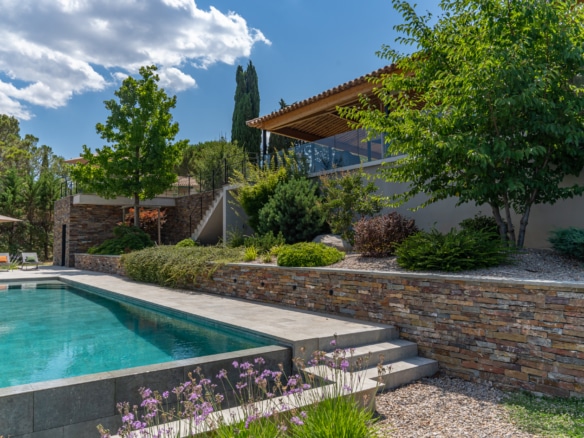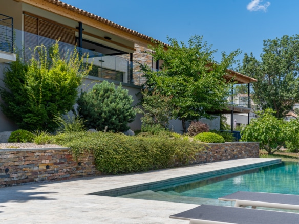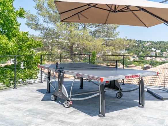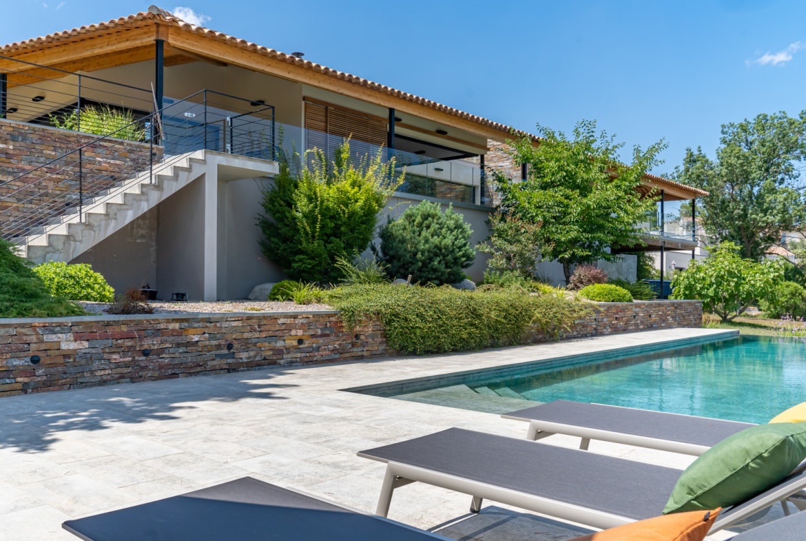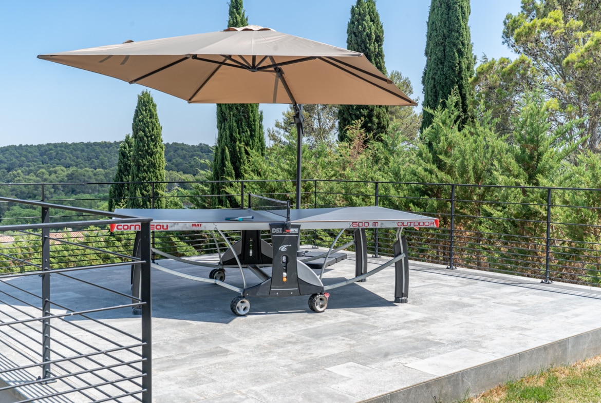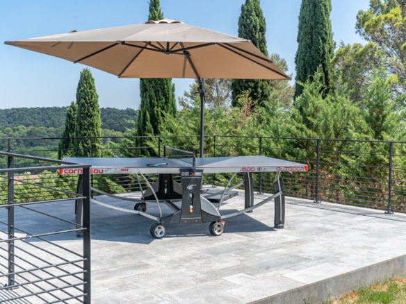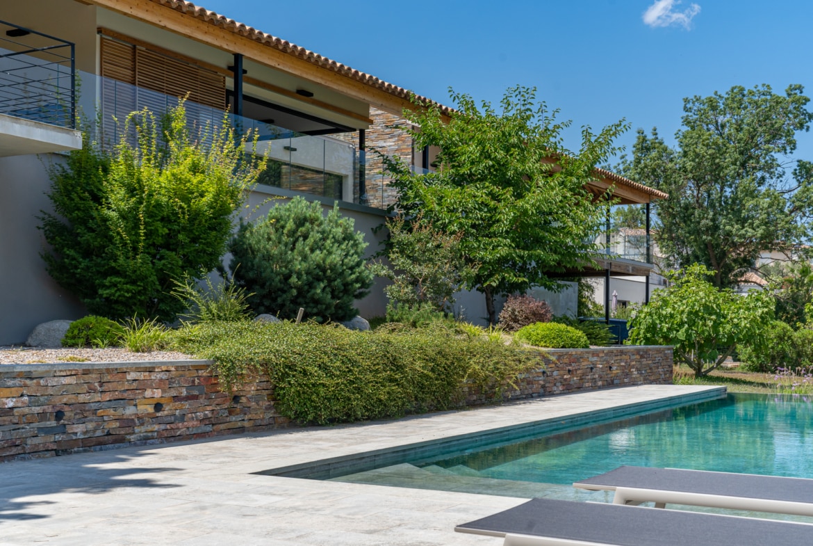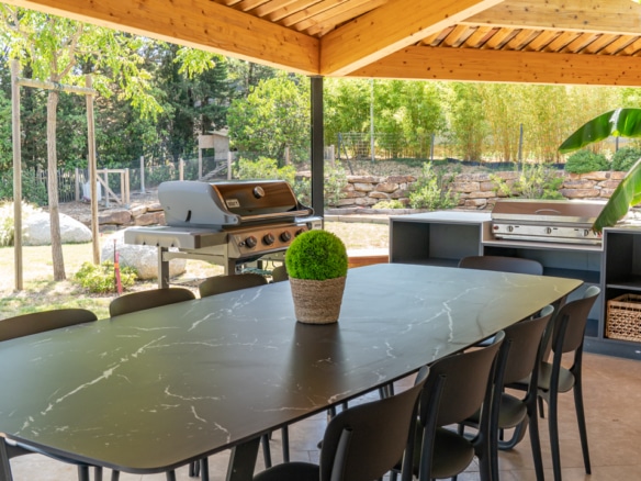 On the lower level, the 14-metre infinity swimming pool is surrounded by flower beds and a terrace, where 6 sunbeds are available for guests. This area is complemented by a refined waterfall fountain from the ground floor which falls to the lower garden, creating a calming and soothing environment. Two gates protect the swimming area for children’s safety. Going up a set of stairs, the main house garden impresses with a magnificent view of the hills and the Golf de Coulondres course, and offers an expansive lawn, a pétanque pitch and a ping-pong table. The terrace is equipped with a gas barbecue and a plancha to enjoy summer meals al fresco, an outdoor sitting area overlooking the swimming pool and hills, and a dining table for 10 can be extended with 2 other tables that are on the other side of the huge sliding glass doors.