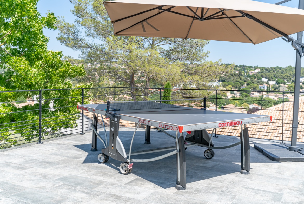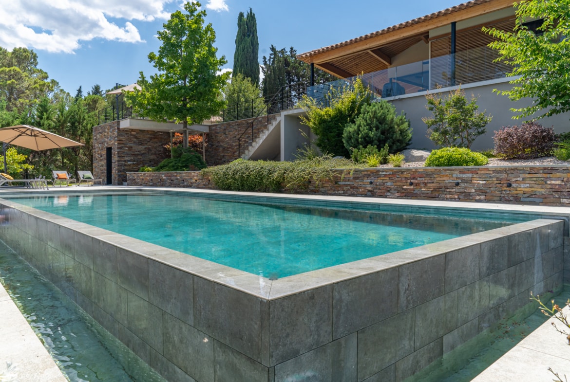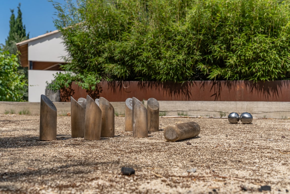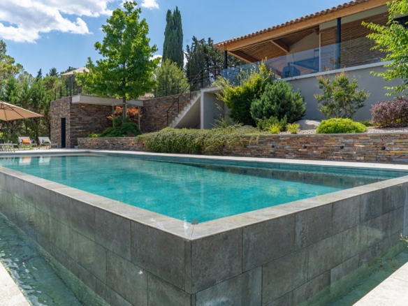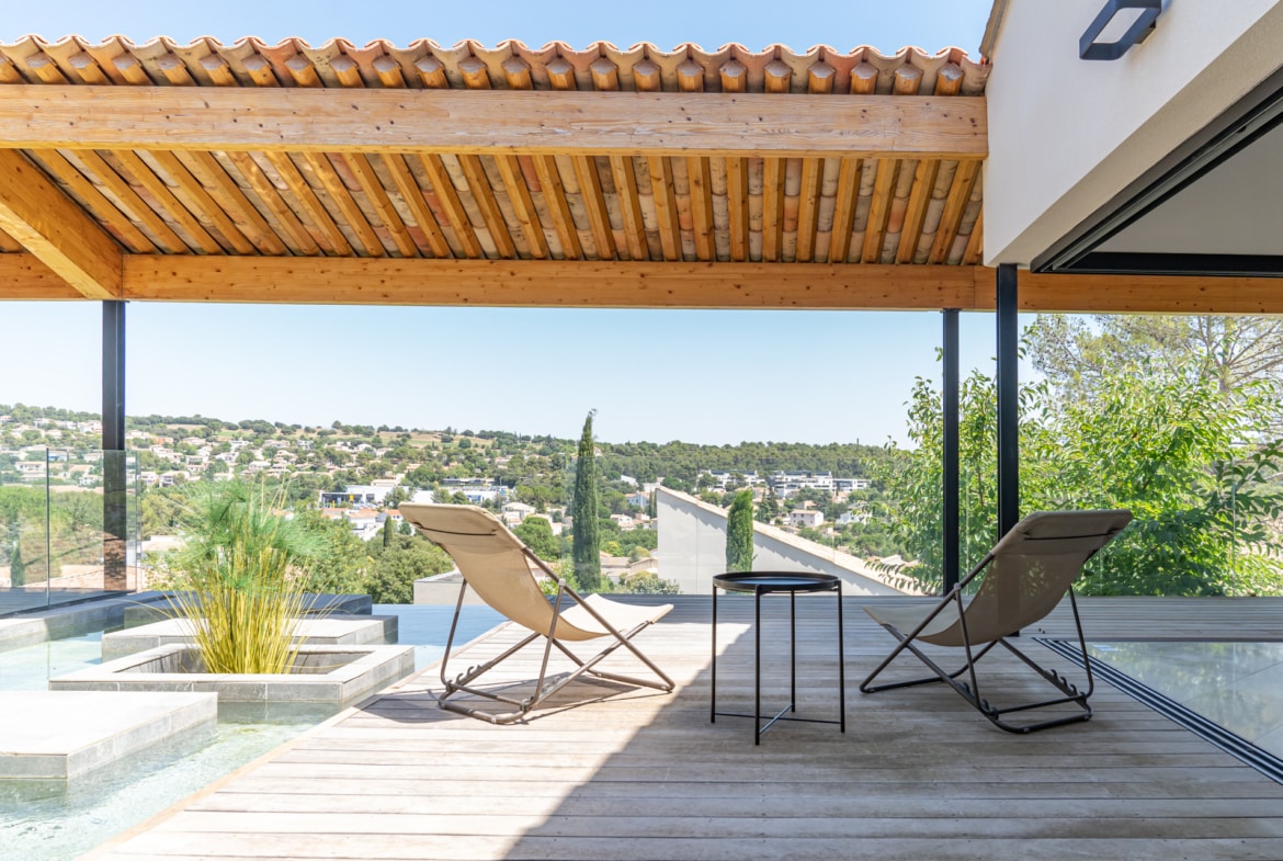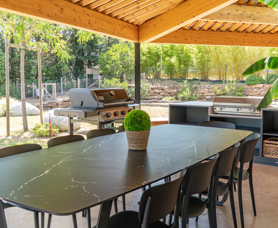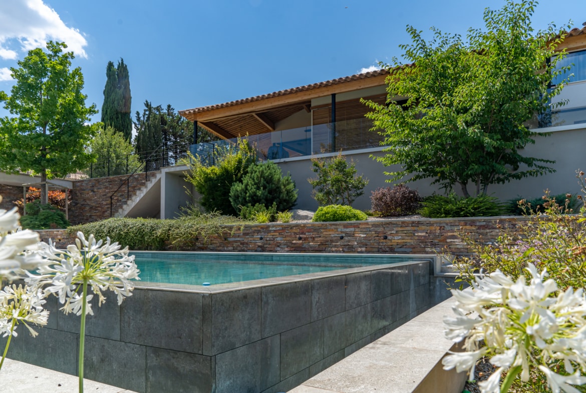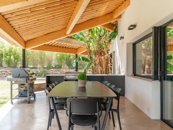 On the lower level, the 14-metre infinity swimming pool is surrounded by flower beds and a terrace, where 6 sunbeds are available for guests. This area is complemented by a refined waterfall fountain from the ground floor which falls to the lower garden, creating a calming and soothing environment. Two gates protect the swimming area for children’s safety. Going up a set of stairs, the main house garden impresses with a magnificent view of the hills and the Golf de Coulondres course, and offers an expansive lawn, a pétanque pitch and a ping-pong table. The terrace is equipped with a gas barbecue and a plancha to enjoy summer meals al fresco, an outdoor sitting area overlooking the swimming pool and hills, and a dining table for 10 can be extended with 2 other tables that are on the other side of the huge sliding glass doors.