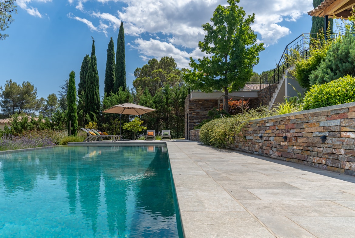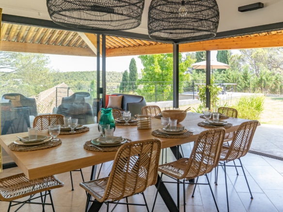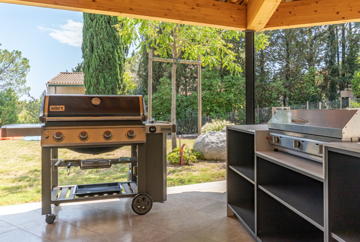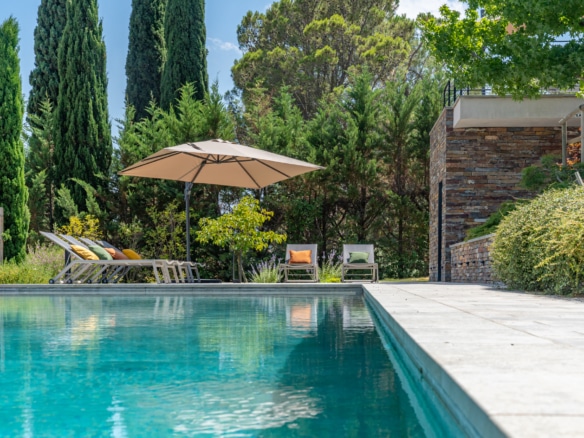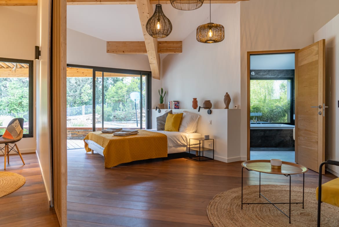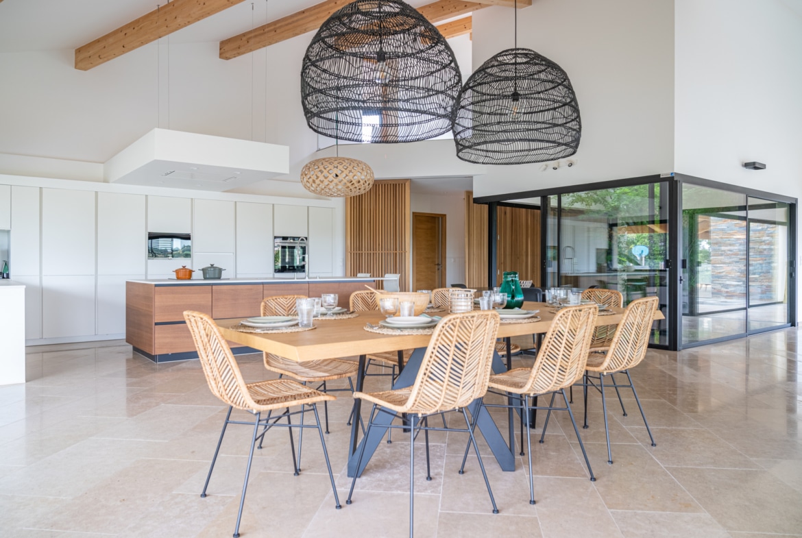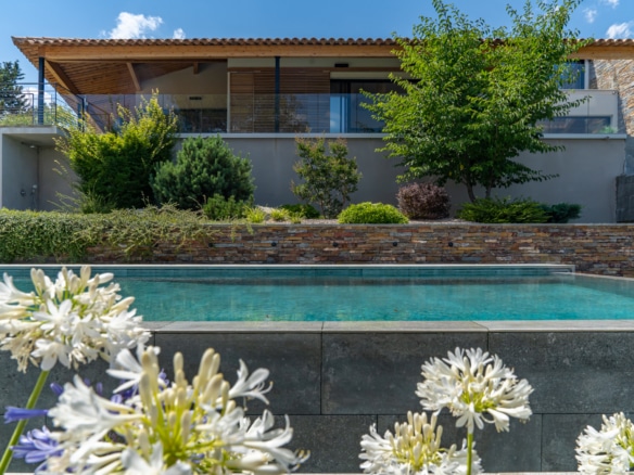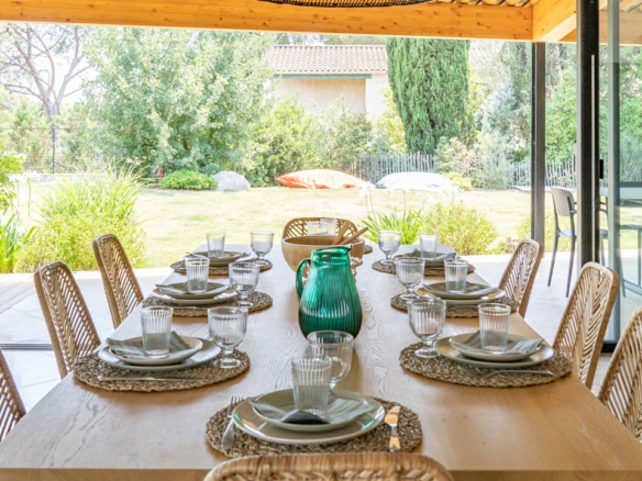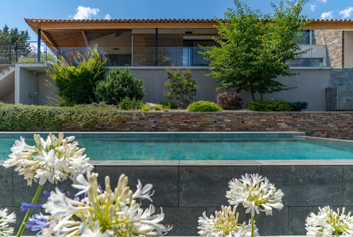On the lower level, the 14-metre infinity swimming pool is surrounded by flower beds and a terrace, where 6 sunbeds are available for guests. This area is complemented by a refined waterfall fountain from the ground floor which falls to the lower garden, creating a calming and soothing environment. Two gates protect the swimming area for children’s safety. Going up a set of stairs, the main house garden impresses with a magnificent view of the hills and the Golf de Coulondres course, and offers an expansive lawn, a pétanque pitch and a ping-pong table. The terrace is equipped with a gas barbecue and a plancha to enjoy summer meals al fresco, an outdoor sitting area overlooking the swimming pool and hills, and a dining table for 10 can be extended with 2 other tables that are on the other side of the huge sliding glass doors.