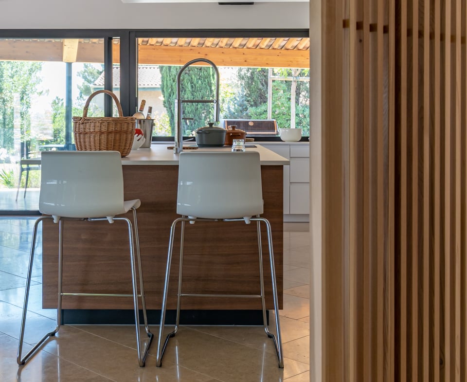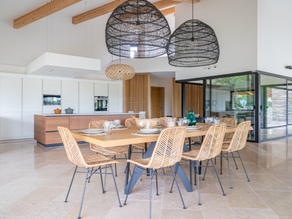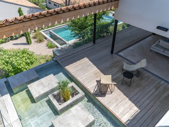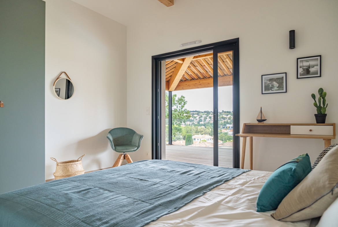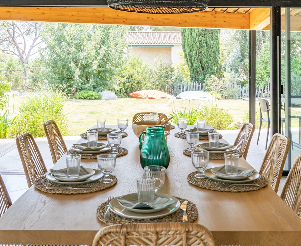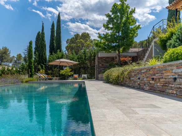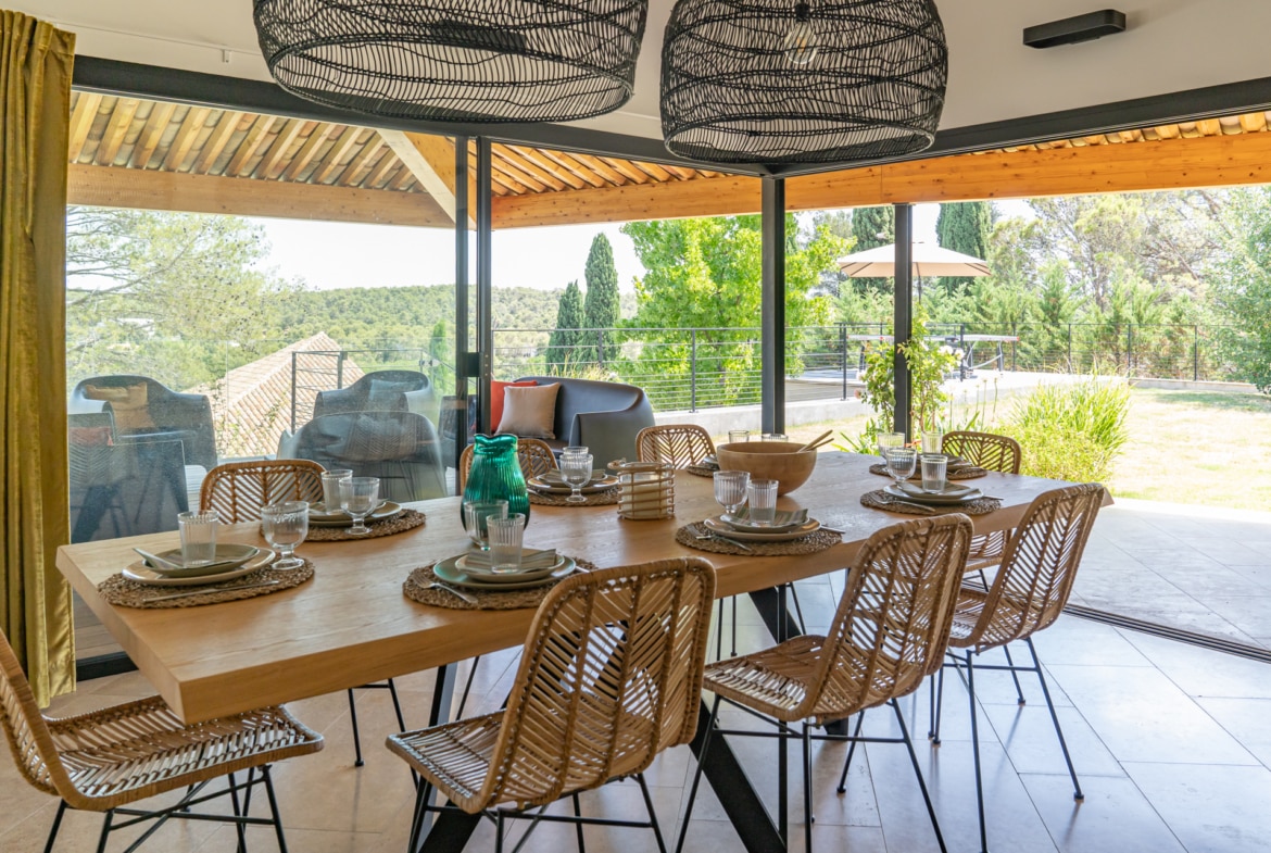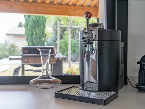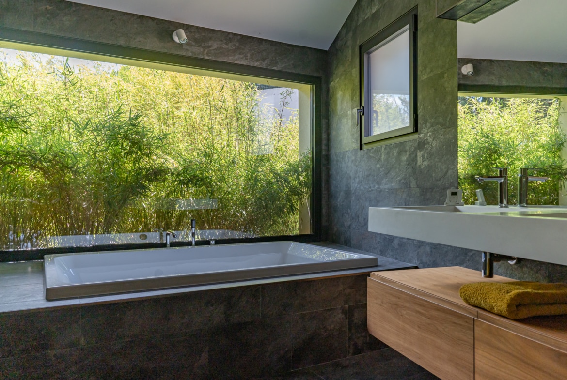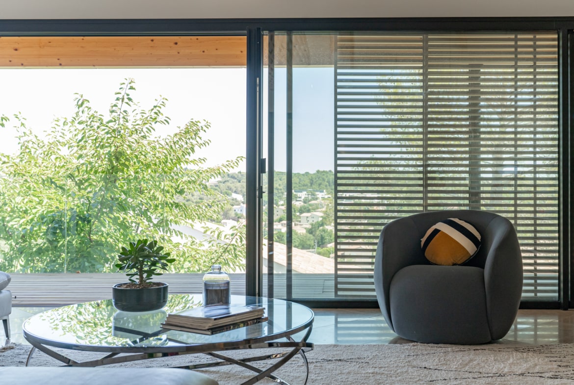 On the lower level, the 14-metre infinity swimming pool is surrounded by flower beds and a terrace, where 6 sunbeds are available for guests. This area is complemented by a refined waterfall fountain from the ground floor which falls to the lower garden, creating a calming and soothing environment. Two gates protect the swimming area for children’s safety. Going up a set of stairs, the main house garden impresses with a magnificent view of the hills and the Golf de Coulondres course, and offers an expansive lawn, a pétanque pitch and a ping-pong table. The terrace is equipped with a gas barbecue and a plancha to enjoy summer meals al fresco, an outdoor sitting area overlooking the swimming pool and hills, and a dining table for 10 can be extended with 2 other tables that are on the other side of the huge sliding glass doors.