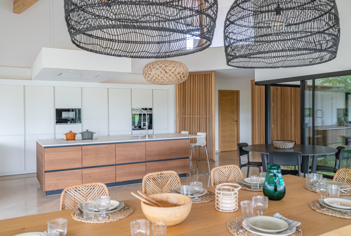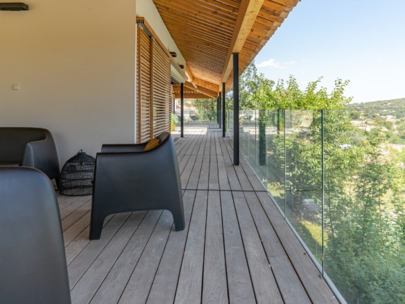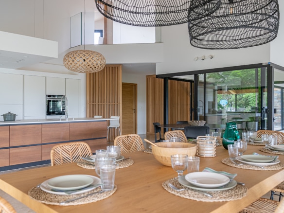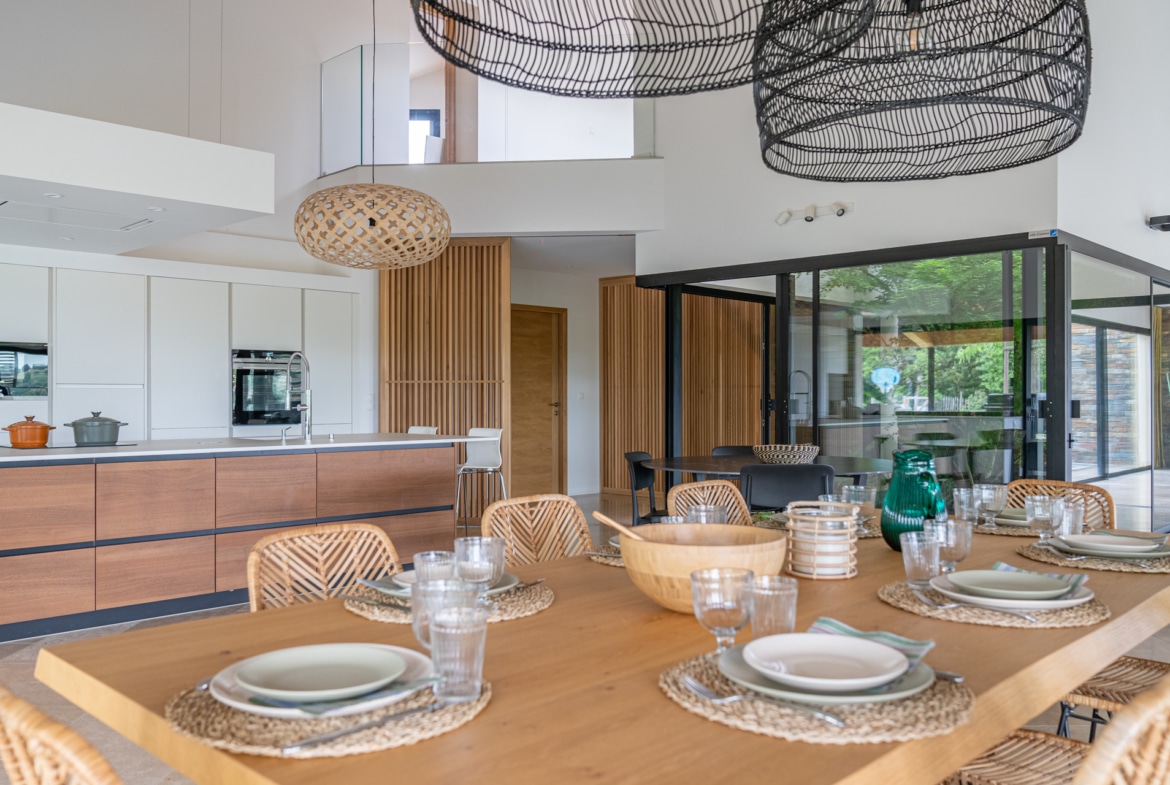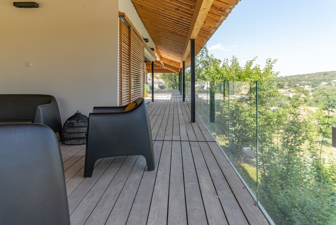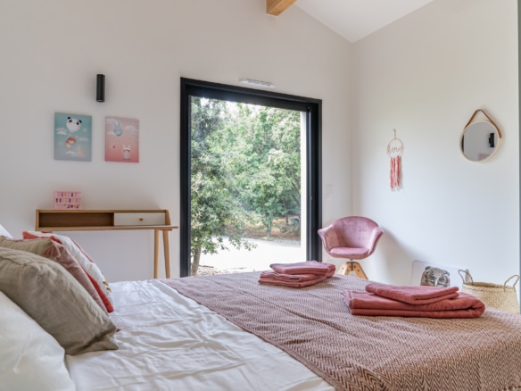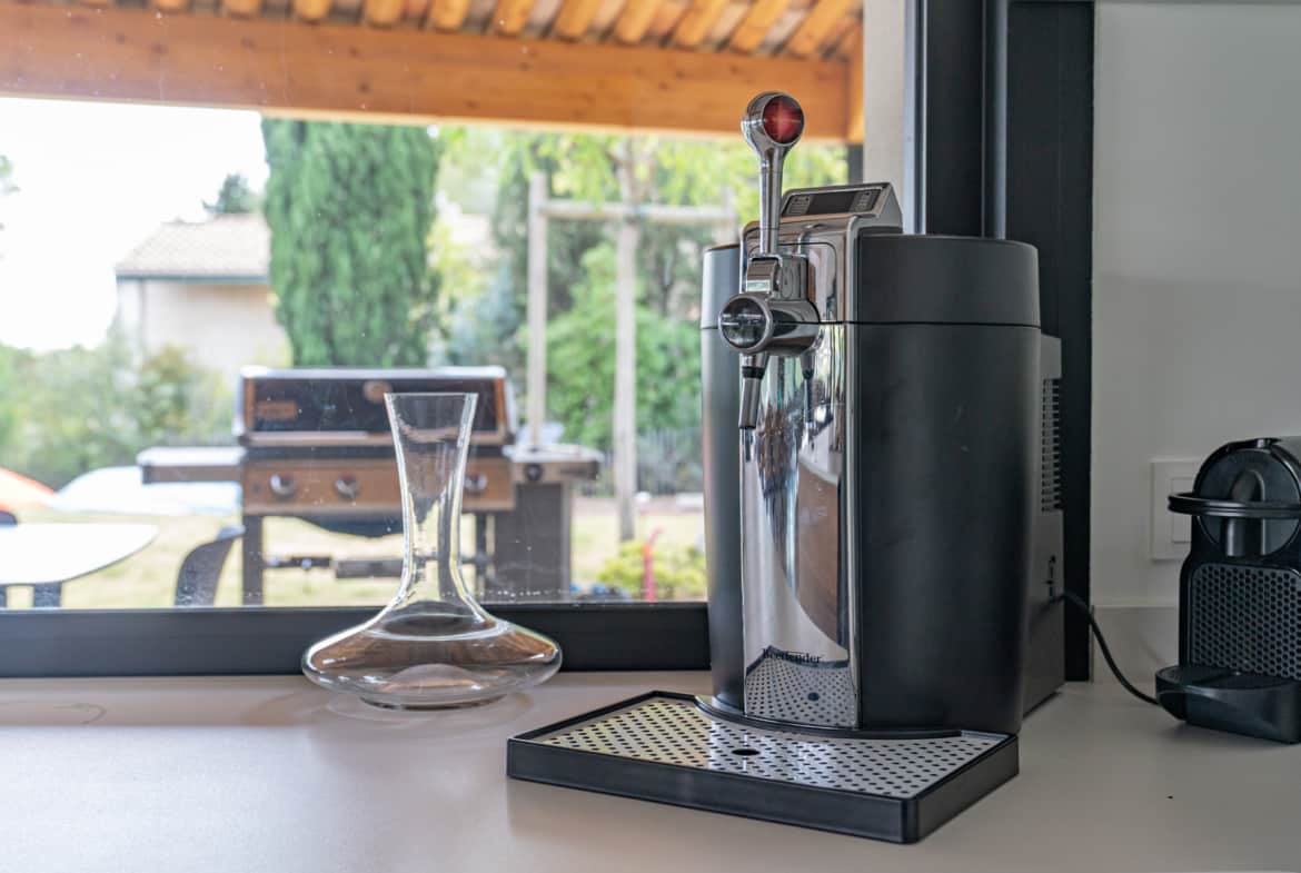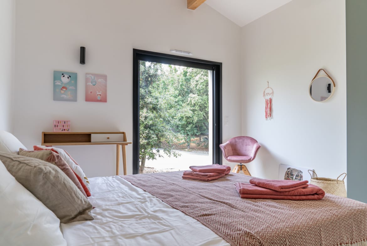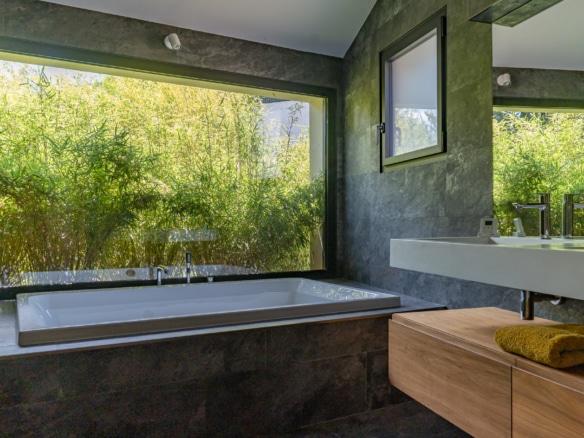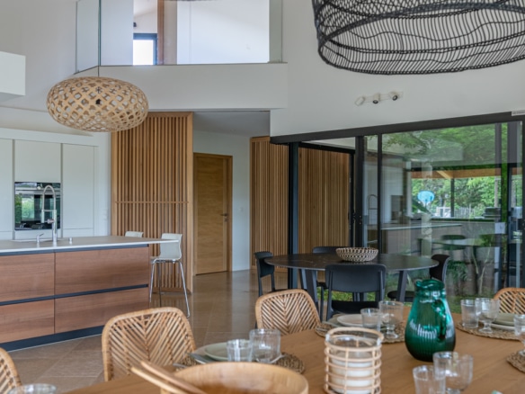 On the lower level, the 14-metre infinity swimming pool is surrounded by flower beds and a terrace, where 6 sunbeds are available for guests. This area is complemented by a refined waterfall fountain from the ground floor which falls to the lower garden, creating a calming and soothing environment. Two gates protect the swimming area for children’s safety. Going up a set of stairs, the main house garden impresses with a magnificent view of the hills and the Golf de Coulondres course, and offers an expansive lawn, a pétanque pitch and a ping-pong table. The terrace is equipped with a gas barbecue and a plancha to enjoy summer meals al fresco, an outdoor sitting area overlooking the swimming pool and hills, and a dining table for 10 can be extended with 2 other tables that are on the other side of the huge sliding glass doors.
