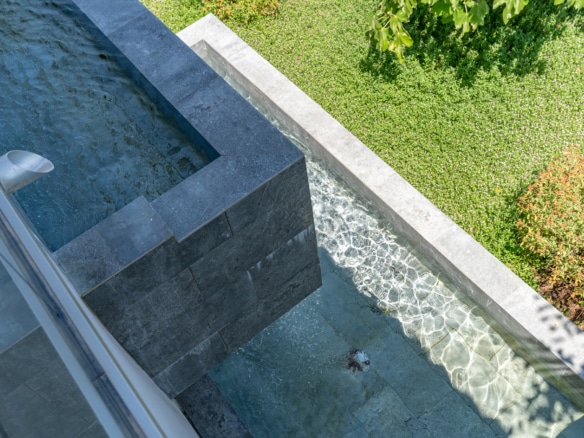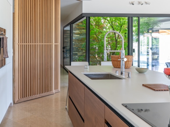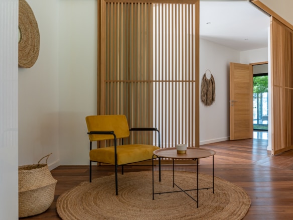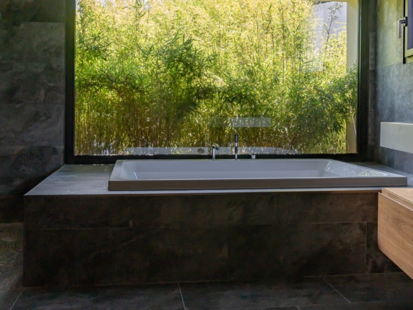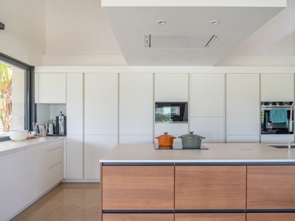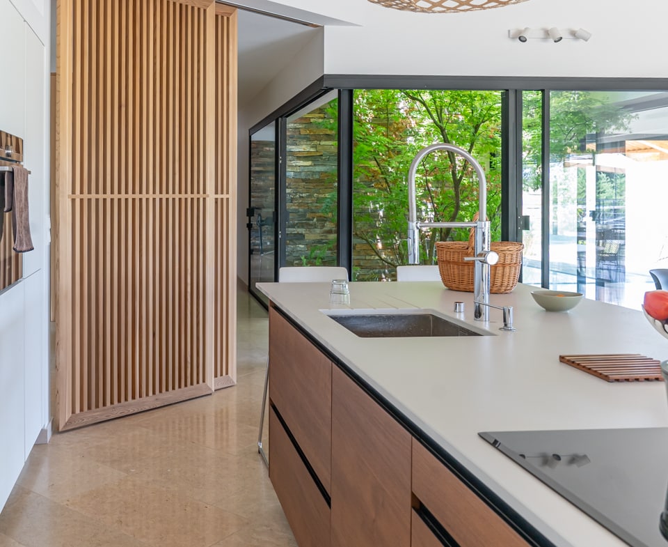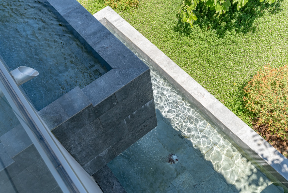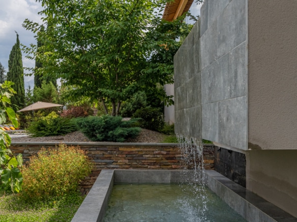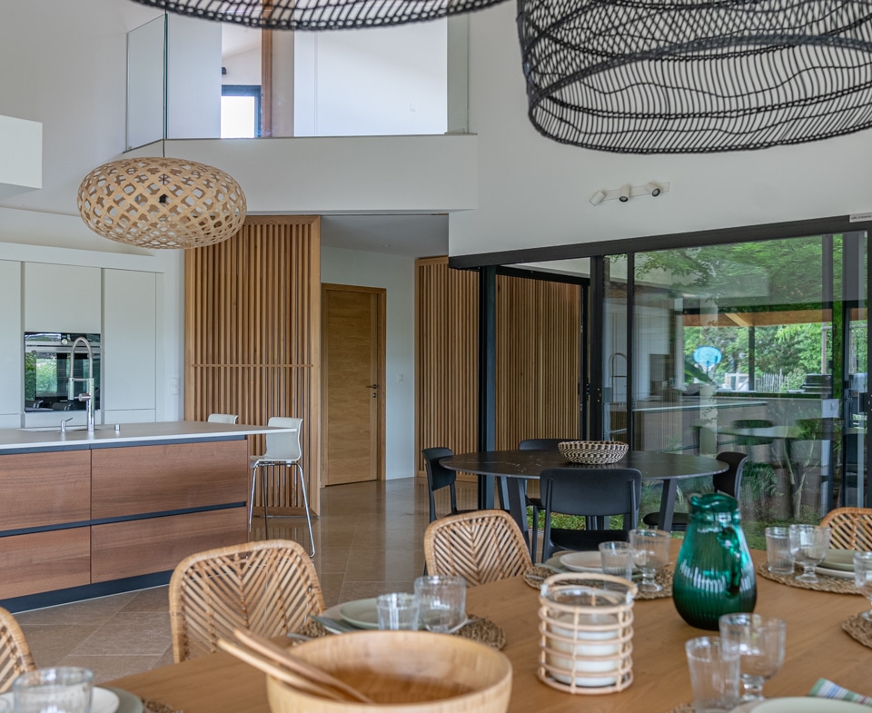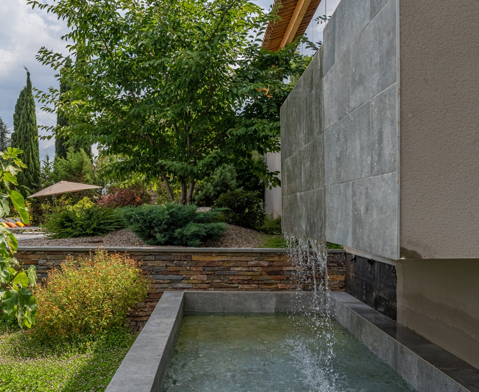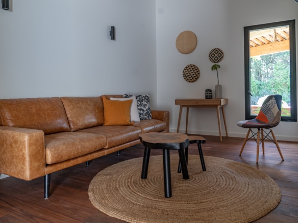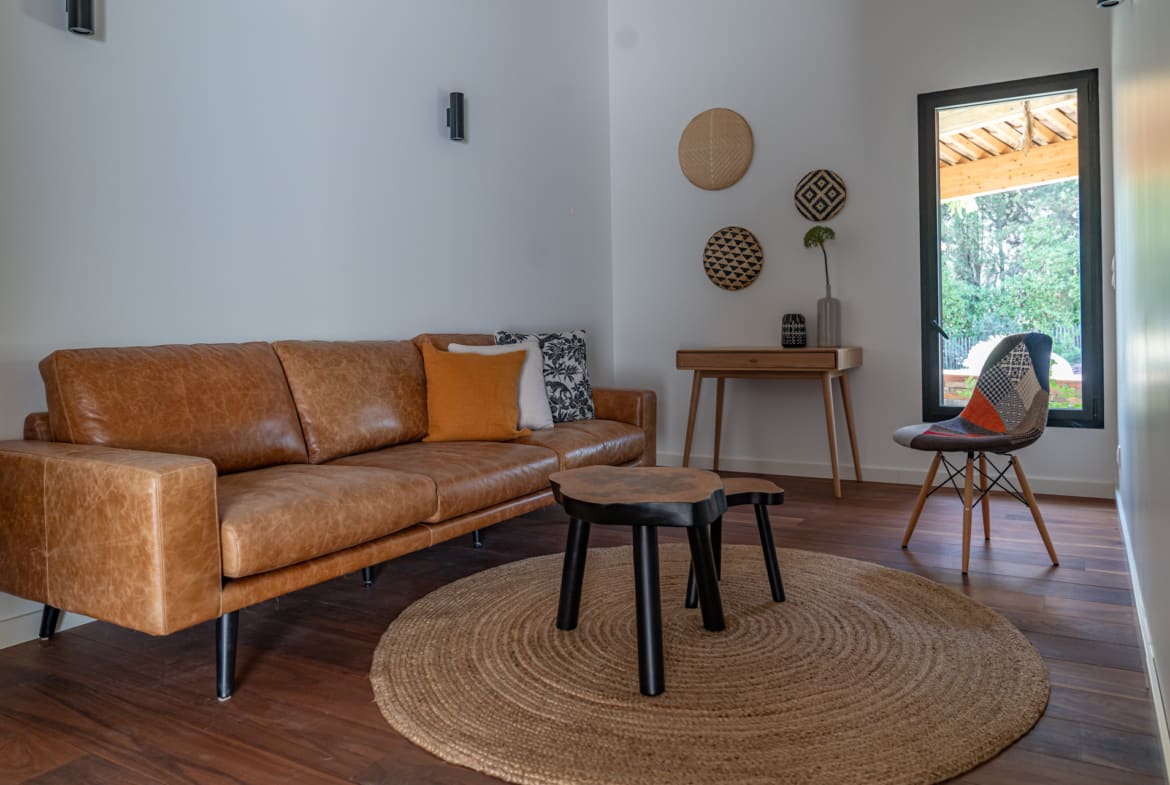 On the lower level, the 14-metre infinity swimming pool is surrounded by flower beds and a terrace, where 6 sunbeds are available for guests. This area is complemented by a refined waterfall fountain from the ground floor which falls to the lower garden, creating a calming and soothing environment. Two gates protect the swimming area for children’s safety. Going up a set of stairs, the main house garden impresses with a magnificent view of the hills and the Golf de Coulondres course, and offers an expansive lawn, a pétanque pitch and a ping-pong table. The terrace is equipped with a gas barbecue and a plancha to enjoy summer meals al fresco, an outdoor sitting area overlooking the swimming pool and hills, and a dining table for 10 can be extended with 2 other tables that are on the other side of the huge sliding glass doors.