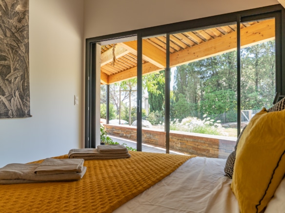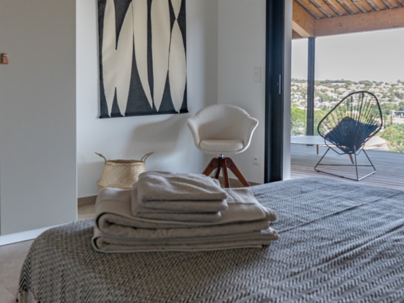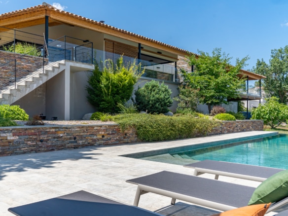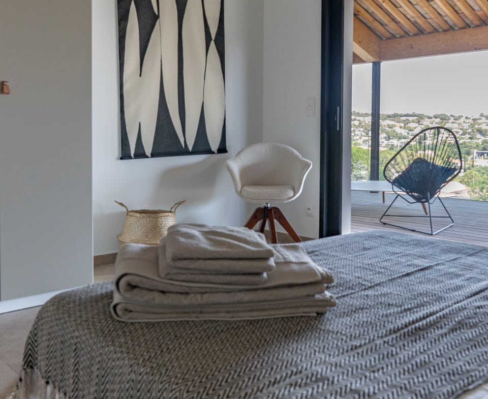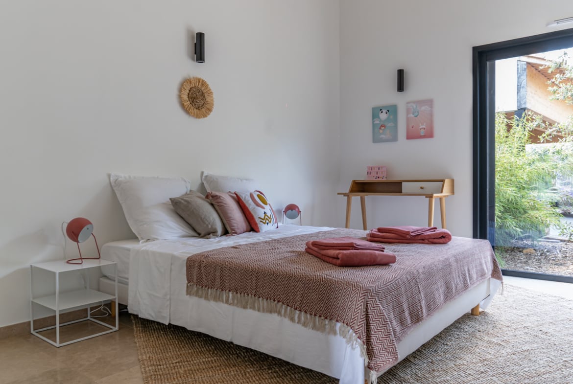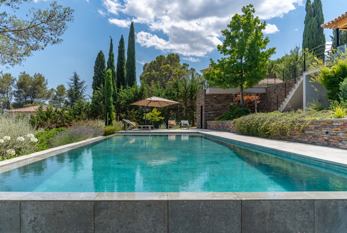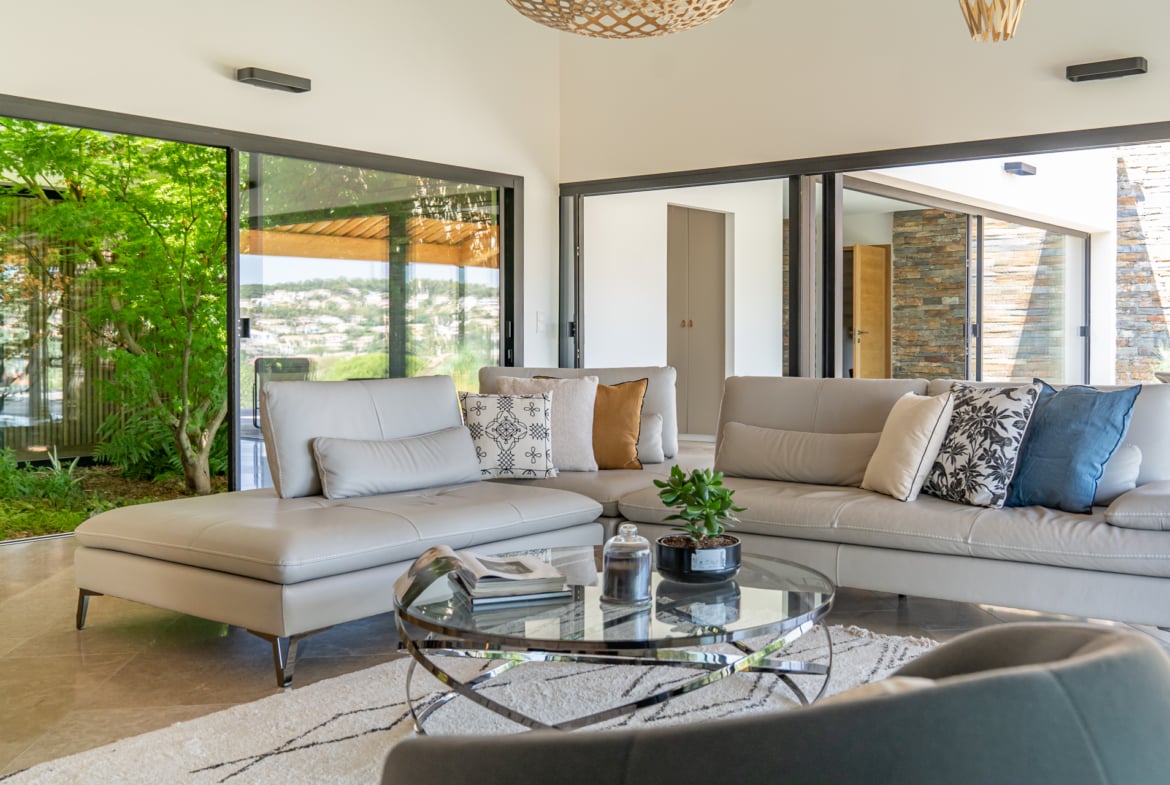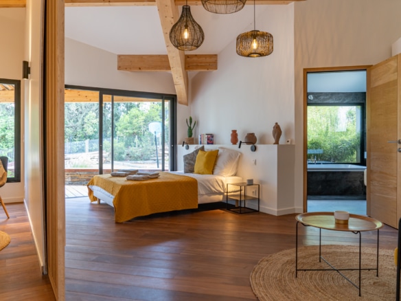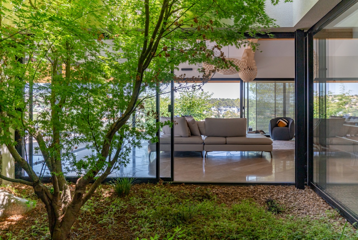 The interior of Villa Bel-Air flawlessly blends serenity and high-end design. From the outdoor living area, there is direct access to the indoor dining area for 12. The open-floor concept allows for fluid access to the fully equipped, spacious kitchen with contemporary designs and a central island, and to the living room with a leather sofa, wall-mounted flat-screen TV and a high-quality audio equipment. At the centre of this open space is a spectacular glasshouse with an interior garden which goes up 2 levels. From the living area, travellers will be mesmerised by the sounds of the water from the fountain trickling down to the lower garden and the breathtaking views of the village on the hills. On the East side of the house a separate corridor leads to the first bedroom section which comprises 3 double bedrooms (160x200cm). Two of the rooms have direct access to a private terrace fitted with chairs and endowed with views of the swimming pool and its surroundings. These rooms share a spacious family bathroom equipped with a shower, a bathtub, and a separate toilet. The master bedroom is on the west side of the ground floor; it is composed of two rooms, one sitting room with a chic leather sofa and an office area, and a sleeping room with a double bed (160x200cm) with direct access to a private terrace and garden views. The private bathroom is equipped with an open shower and a large bathtub. The toilet is independent.