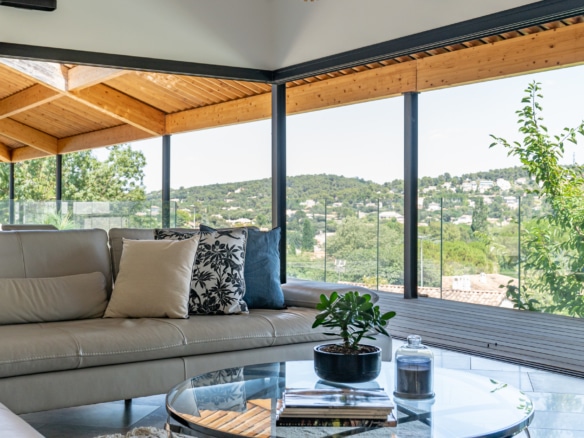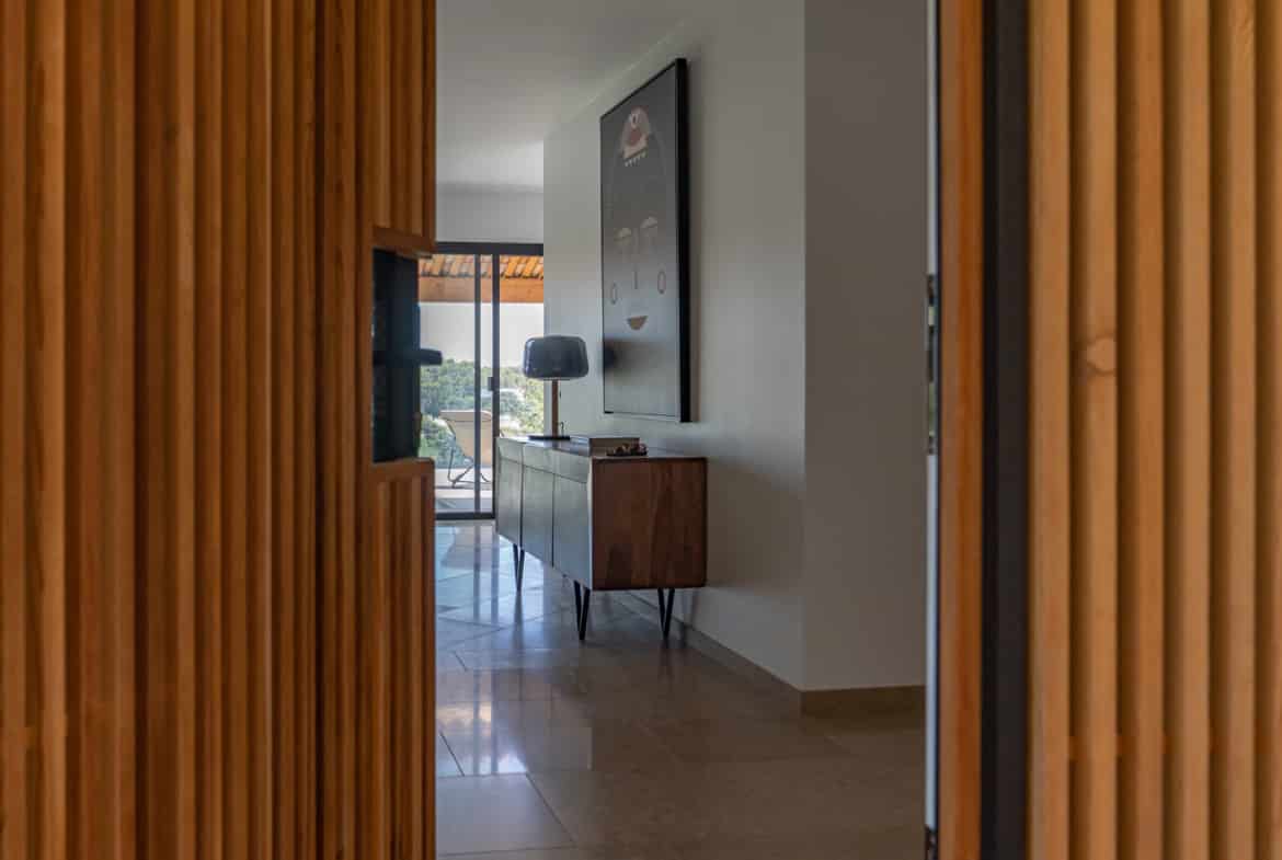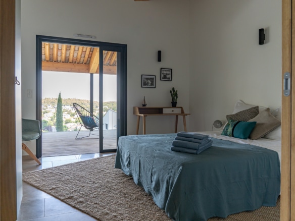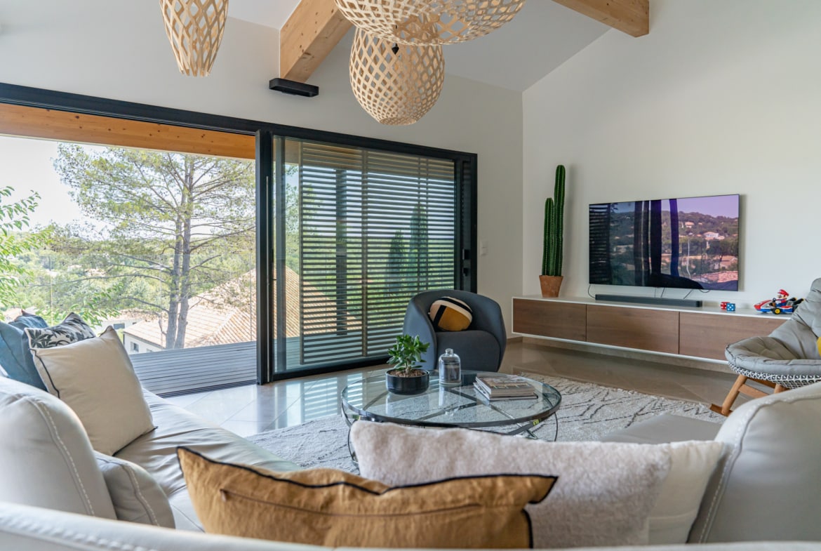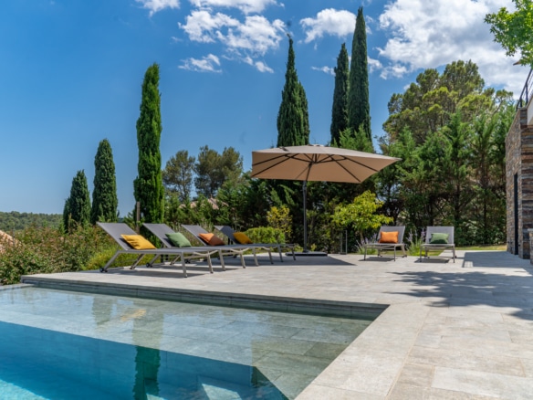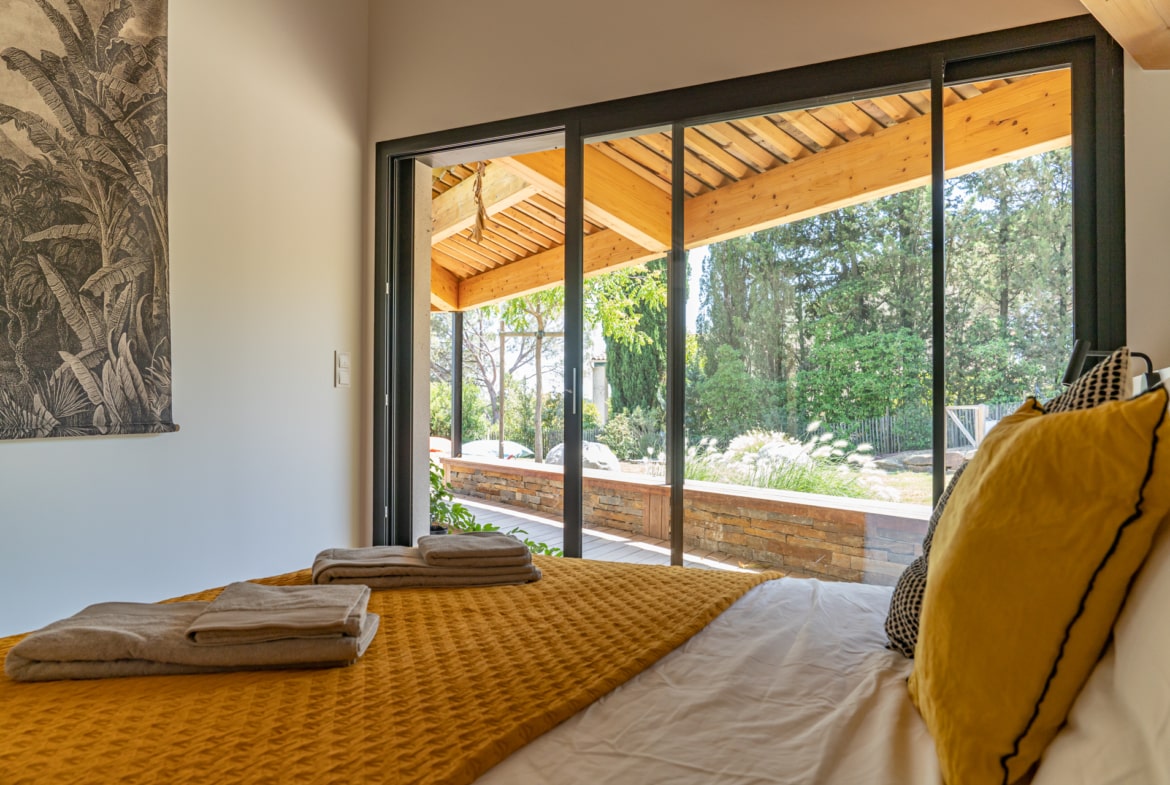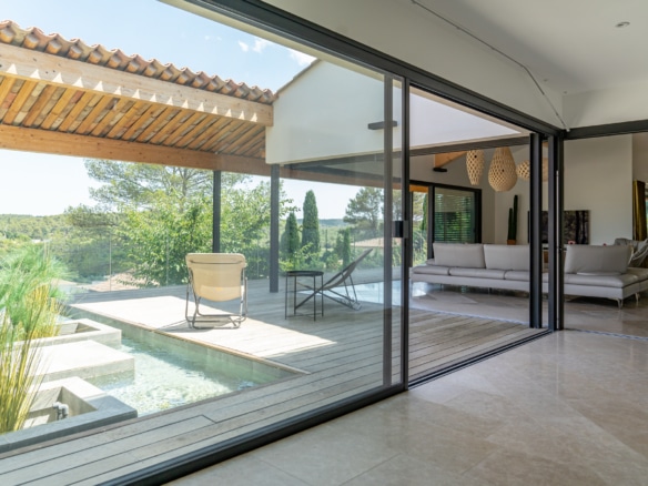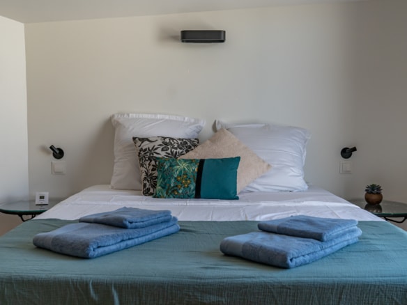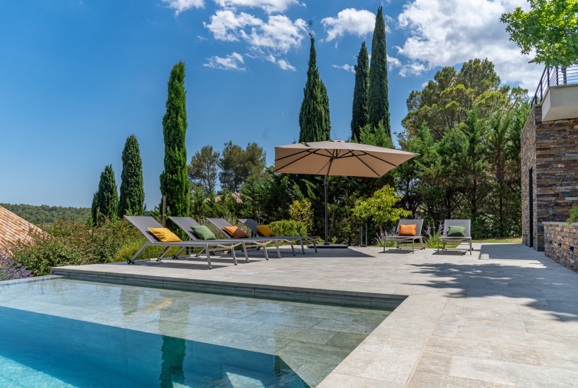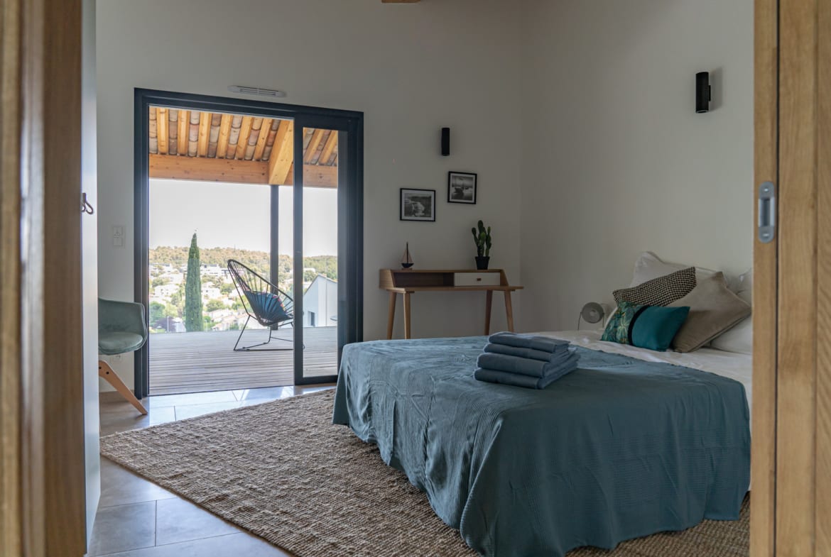 The interior of Villa Bel-Air flawlessly blends serenity and high-end design. From the outdoor living area, there is direct access to the indoor dining area for 12. The open-floor concept allows for fluid access to the fully equipped, spacious kitchen with contemporary designs and a central island, and to the living room with a leather sofa, wall-mounted flat-screen TV and a high-quality audio equipment. At the centre of this open space is a spectacular glasshouse with an interior garden which goes up 2 levels. From the living area, travellers will be mesmerised by the sounds of the water from the fountain trickling down to the lower garden and the breathtaking views of the village on the hills. On the East side of the house a separate corridor leads to the first bedroom section which comprises 3 double bedrooms (160x200cm). Two of the rooms have direct access to a private terrace fitted with chairs and endowed with views of the swimming pool and its surroundings. These rooms share a spacious family bathroom equipped with a shower, a bathtub, and a separate toilet. The master bedroom is on the west side of the ground floor; it is composed of two rooms, one sitting room with a chic leather sofa and an office area, and a sleeping room with a double bed (160x200cm) with direct access to a private terrace and garden views. The private bathroom is equipped with an open shower and a large bathtub. The toilet is independent.
