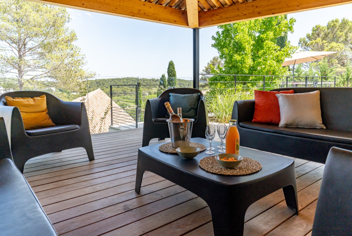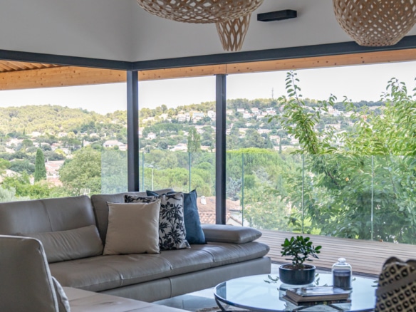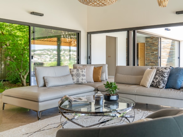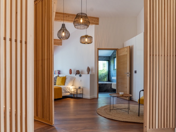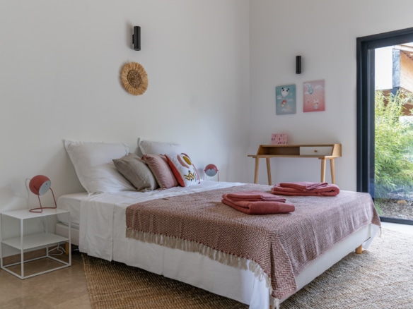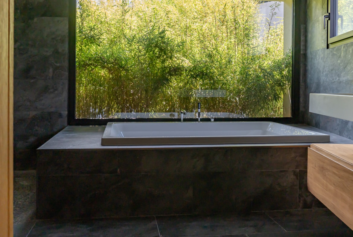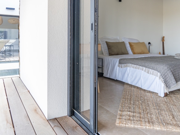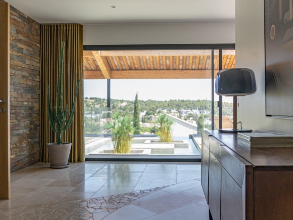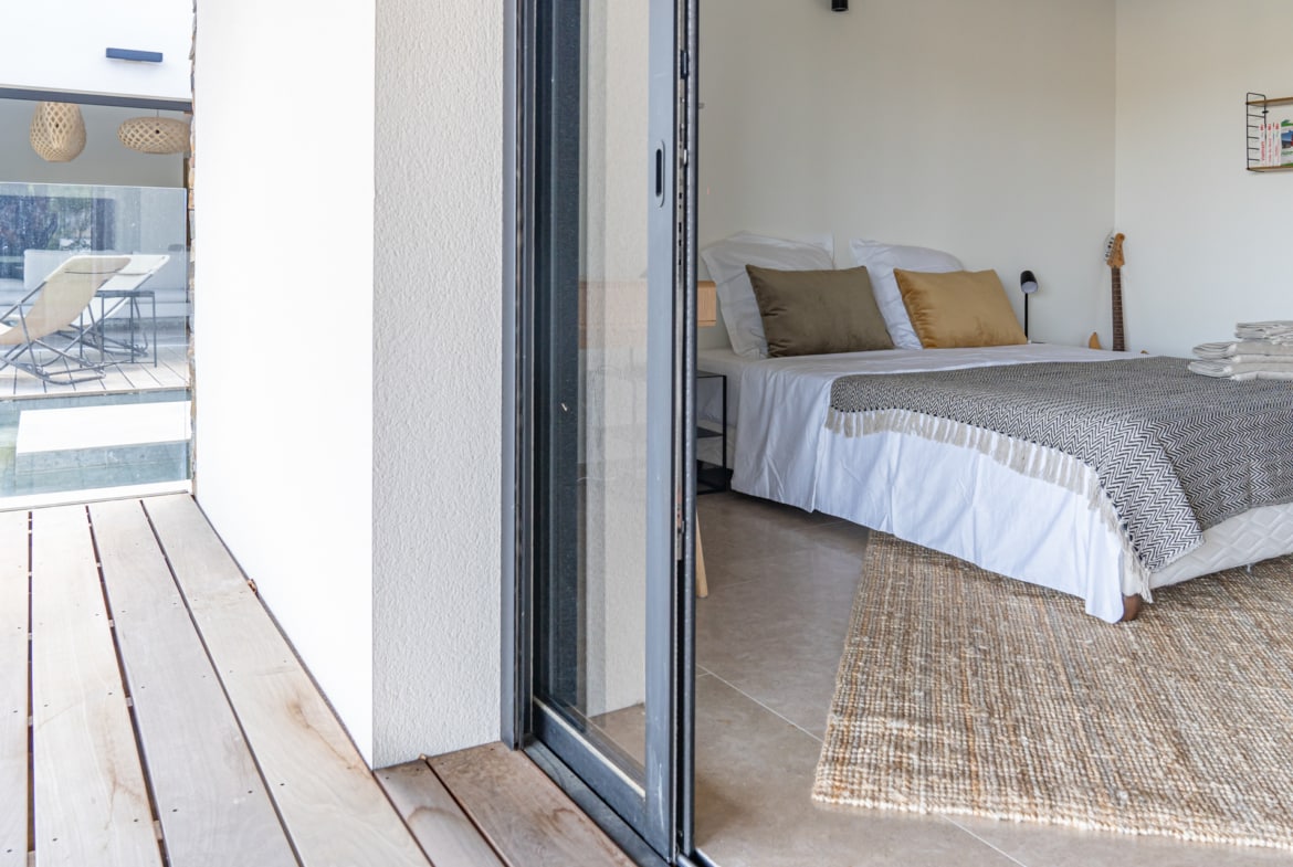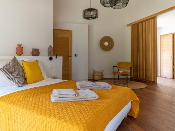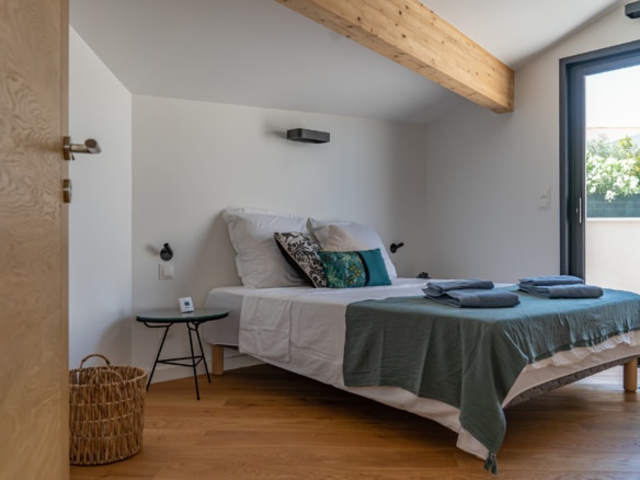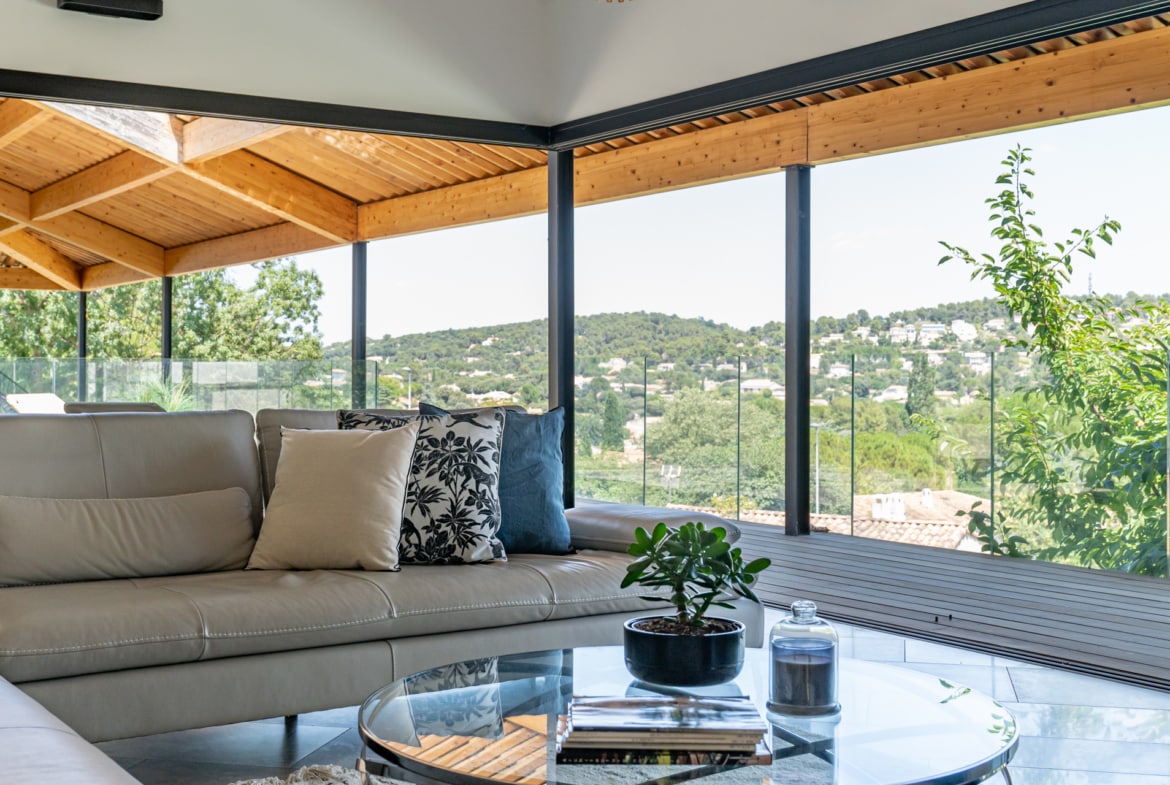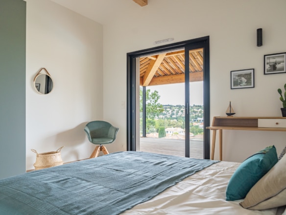 The interior of Villa Bel-Air flawlessly blends serenity and high-end design. From the outdoor living area, there is direct access to the indoor dining area for 12. The open-floor concept allows for fluid access to the fully equipped, spacious kitchen with contemporary designs and a central island, and to the living room with a leather sofa, wall-mounted flat-screen TV and a high-quality audio equipment. At the centre of this open space is a spectacular glasshouse with an interior garden which goes up 2 levels. From the living area, travellers will be mesmerised by the sounds of the water from the fountain trickling down to the lower garden and the breathtaking views of the village on the hills. On the East side of the house a separate corridor leads to the first bedroom section which comprises 3 double bedrooms (160x200cm). Two of the rooms have direct access to a private terrace fitted with chairs and endowed with views of the swimming pool and its surroundings. These rooms share a spacious family bathroom equipped with a shower, a bathtub, and a separate toilet. The master bedroom is on the west side of the ground floor; it is composed of two rooms, one sitting room with a chic leather sofa and an office area, and a sleeping room with a double bed (160x200cm) with direct access to a private terrace and garden views. The private bathroom is equipped with an open shower and a large bathtub. The toilet is independent.