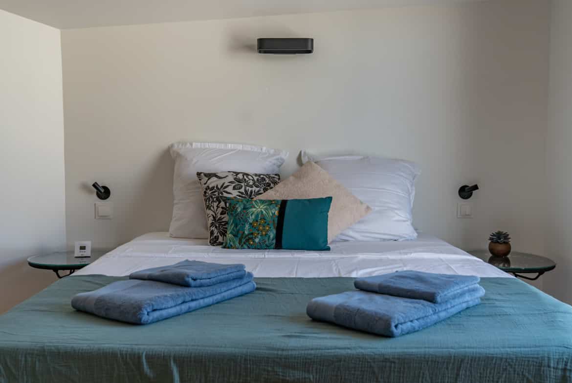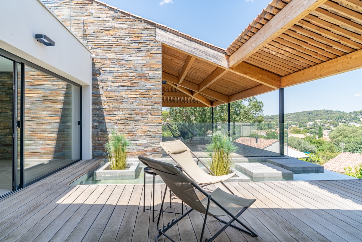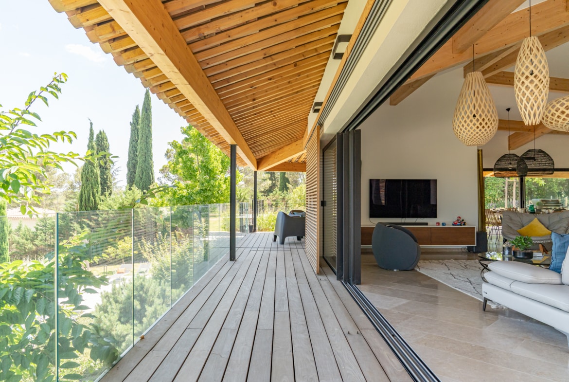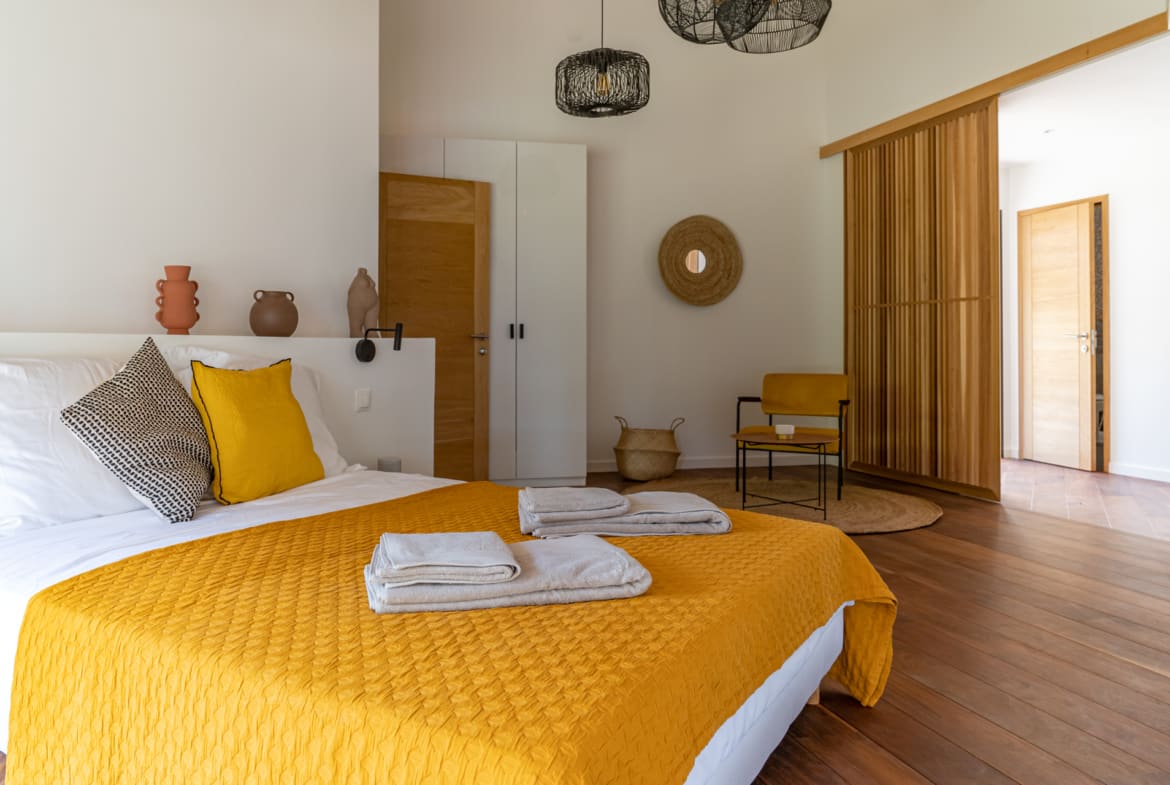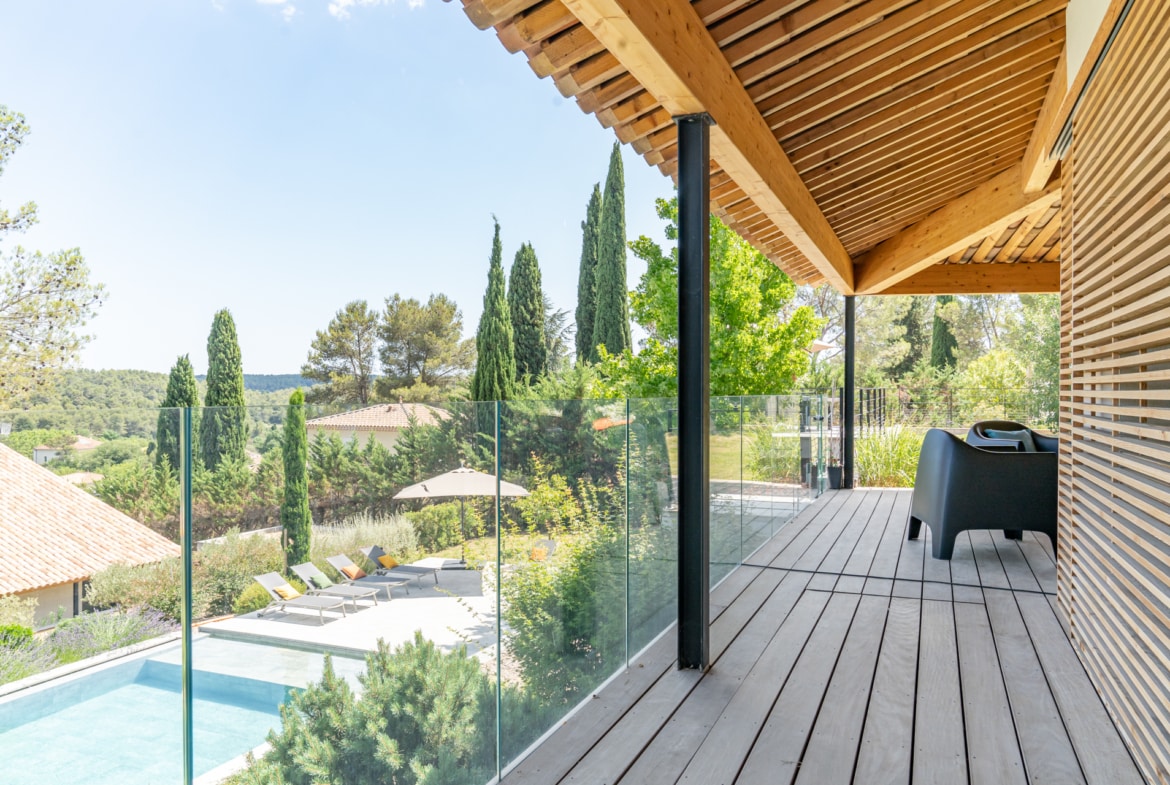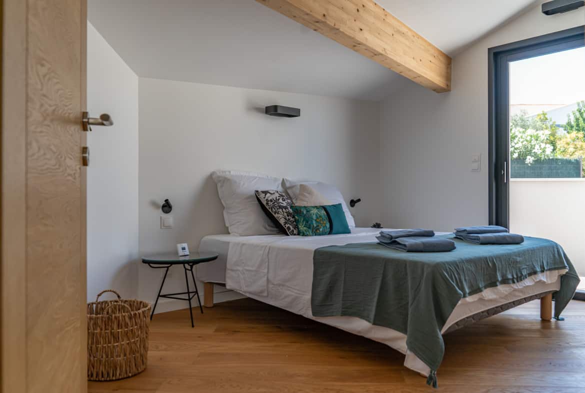 The interior of Villa Bel-Air flawlessly blends serenity and high-end design. From the outdoor living area, there is direct access to the indoor dining area for 12. The open-floor concept allows for fluid access to the fully equipped, spacious kitchen with contemporary designs and a central island, and to the living room with a leather sofa, wall-mounted flat-screen TV and a high-quality audio equipment. At the centre of this open space is a spectacular glasshouse with an interior garden which goes up 2 levels. From the living area, travellers will be mesmerised by the sounds of the water from the fountain trickling down to the lower garden and the breathtaking views of the village on the hills. On the East side of the house a separate corridor leads to the first bedroom section which comprises 3 double bedrooms (160x200cm). Two of the rooms have direct access to a private terrace fitted with chairs and endowed with views of the swimming pool and its surroundings. These rooms share a spacious family bathroom equipped with a shower, a bathtub, and a separate toilet. The master bedroom is on the west side of the ground floor; it is composed of two rooms, one sitting room with a chic leather sofa and an office area, and a sleeping room with a double bed (160x200cm) with direct access to a private terrace and garden views. The private bathroom is equipped with an open shower and a large bathtub. The toilet is independent.