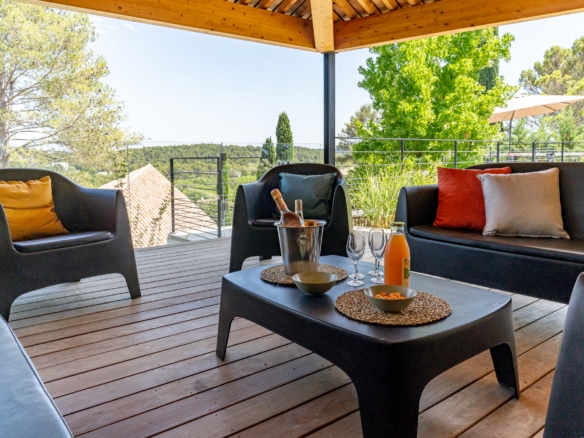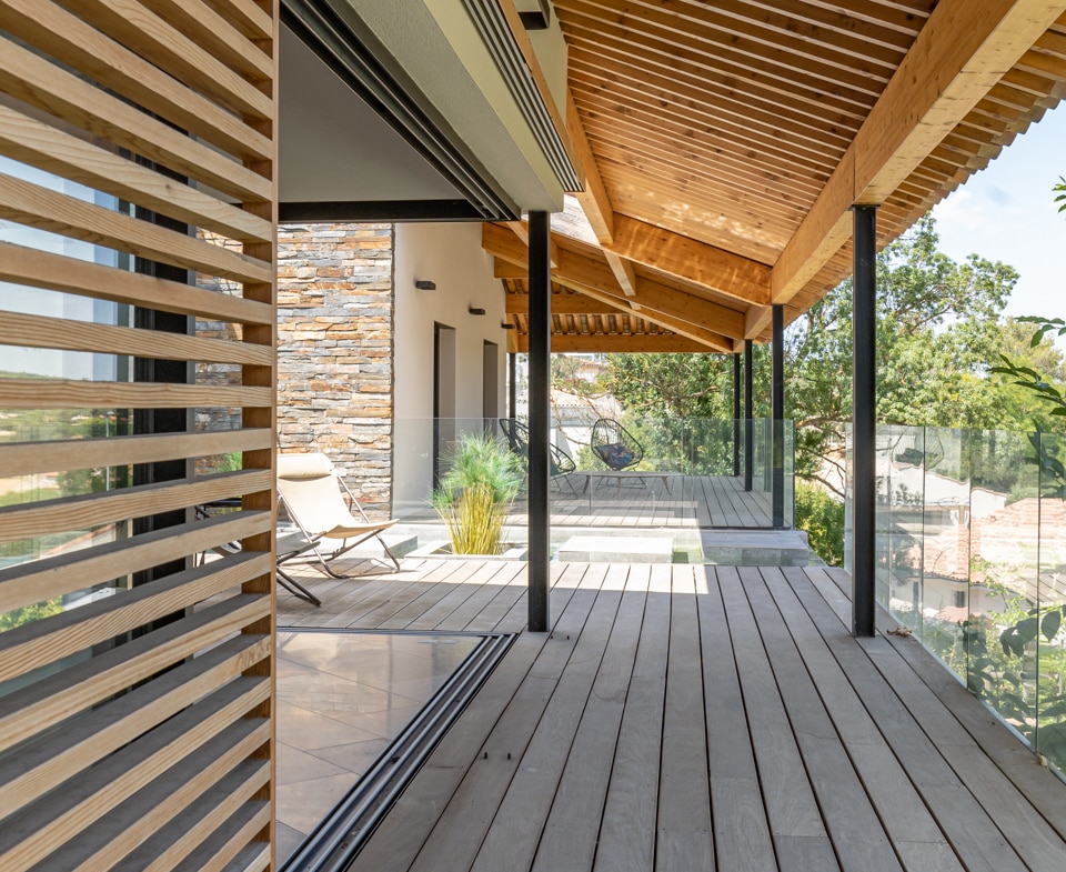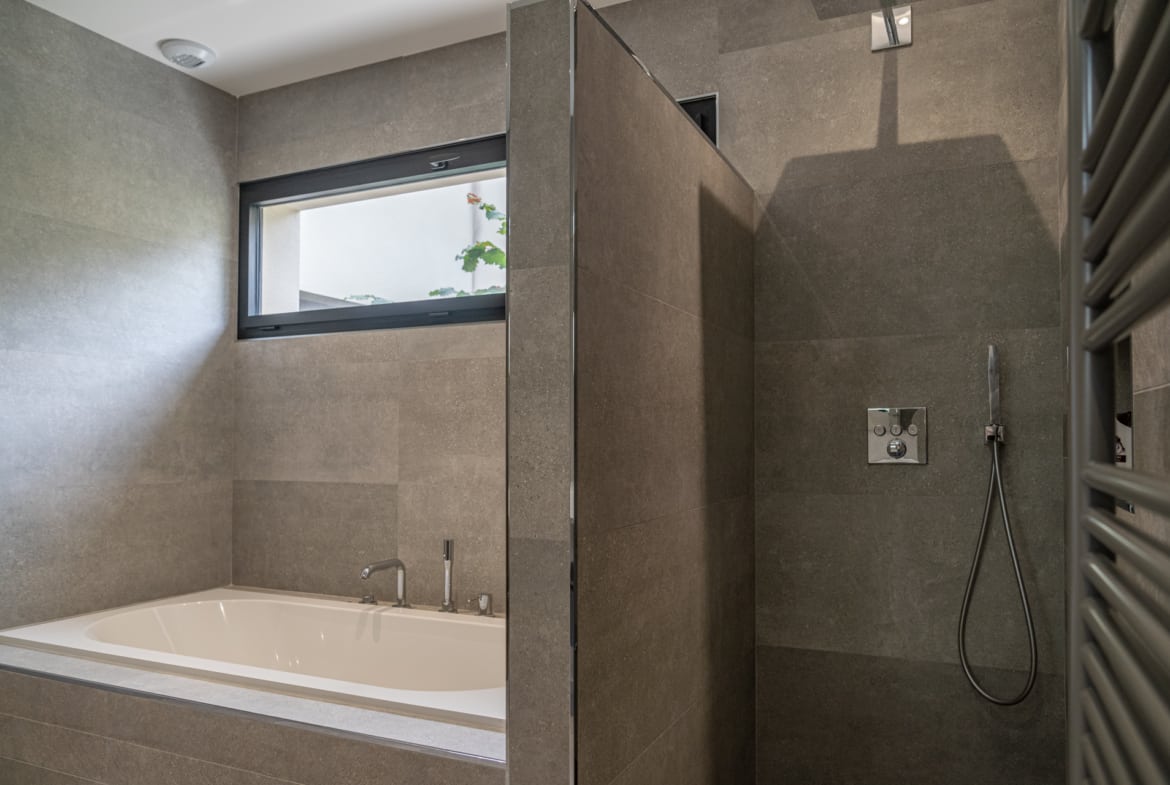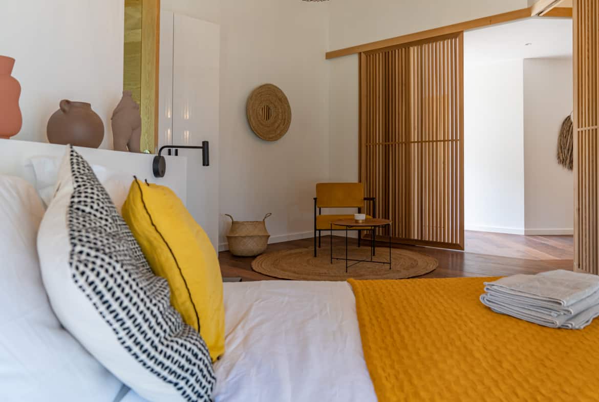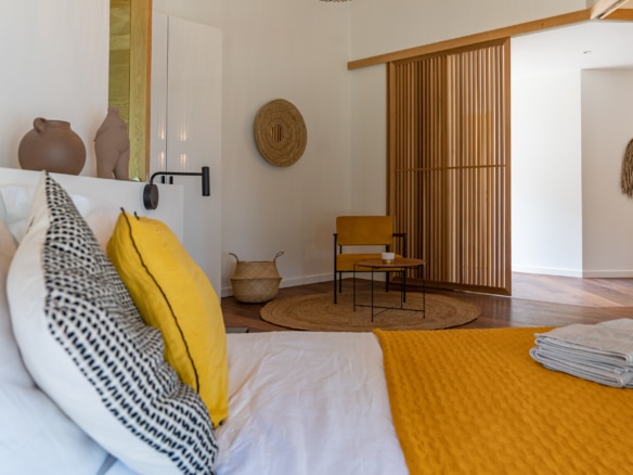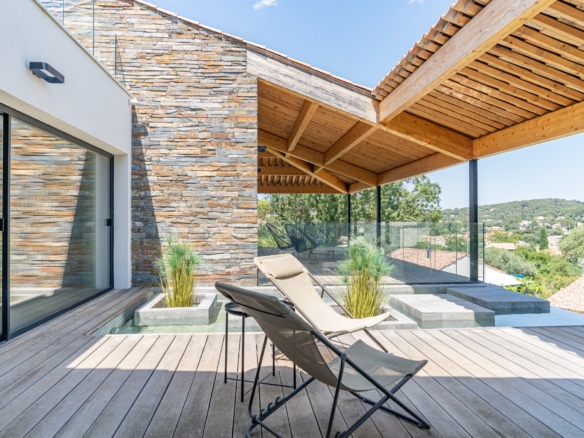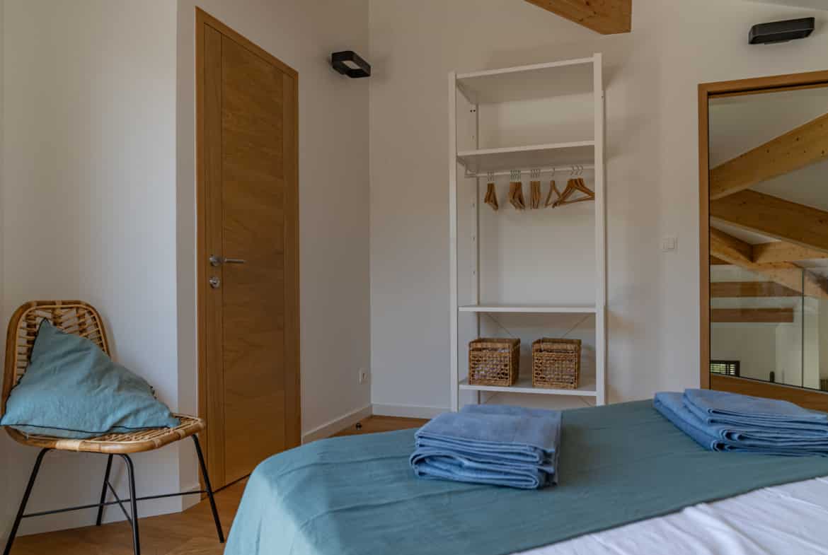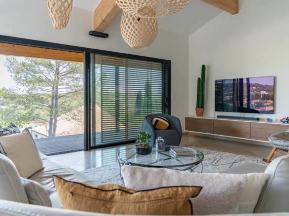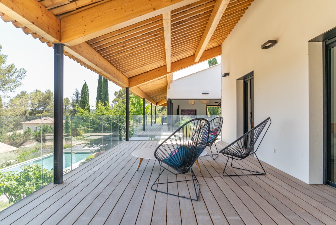 The interior of Villa Bel-Air flawlessly blends serenity and high-end design. From the outdoor living area, there is direct access to the indoor dining area for 12. The open-floor concept allows for fluid access to the fully equipped, spacious kitchen with contemporary designs and a central island, and to the living room with a leather sofa, wall-mounted flat-screen TV and a high-quality audio equipment. At the centre of this open space is a spectacular glasshouse with an interior garden which goes up 2 levels. From the living area, travellers will be mesmerised by the sounds of the water from the fountain trickling down to the lower garden and the breathtaking views of the village on the hills. On the East side of the house a separate corridor leads to the first bedroom section which comprises 3 double bedrooms (160x200cm). Two of the rooms have direct access to a private terrace fitted with chairs and endowed with views of the swimming pool and its surroundings. These rooms share a spacious family bathroom equipped with a shower, a bathtub, and a separate toilet. The master bedroom is on the west side of the ground floor; it is composed of two rooms, one sitting room with a chic leather sofa and an office area, and a sleeping room with a double bed (160x200cm) with direct access to a private terrace and garden views. The private bathroom is equipped with an open shower and a large bathtub. The toilet is independent.