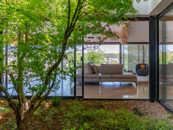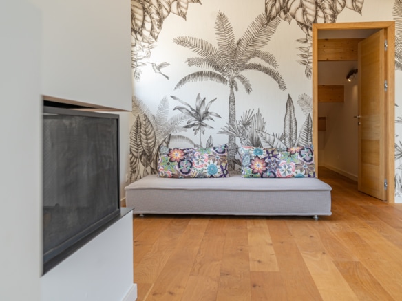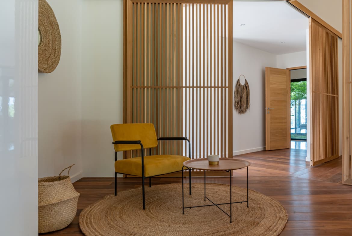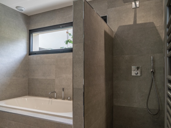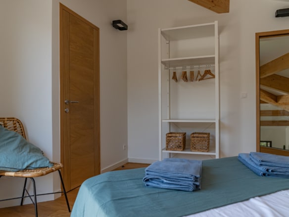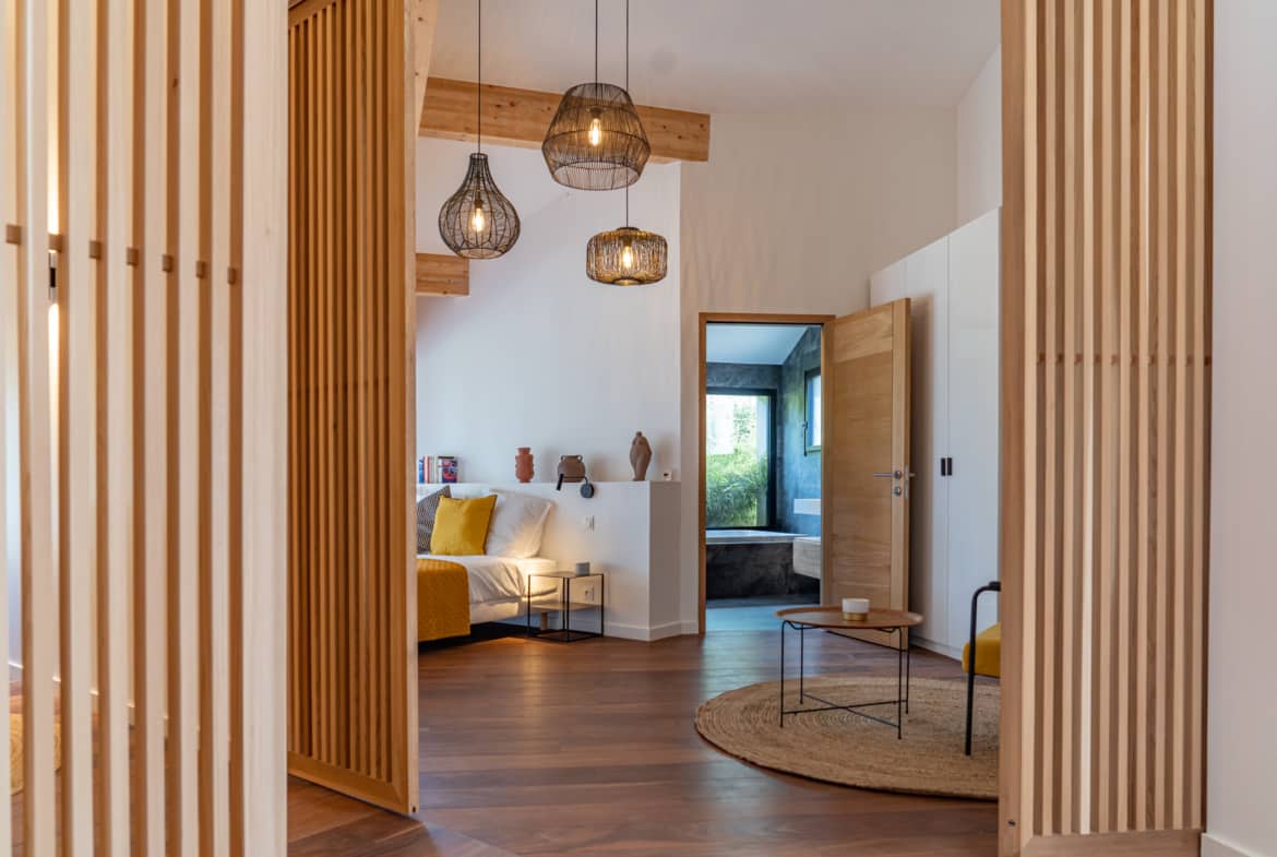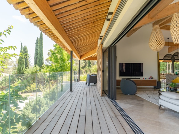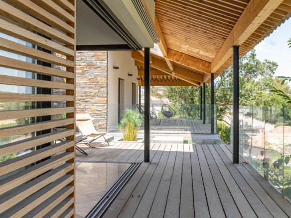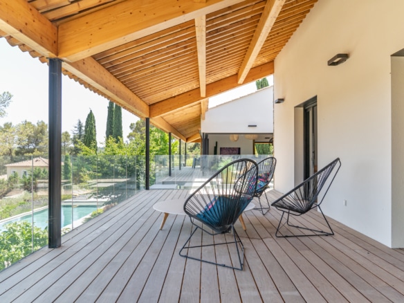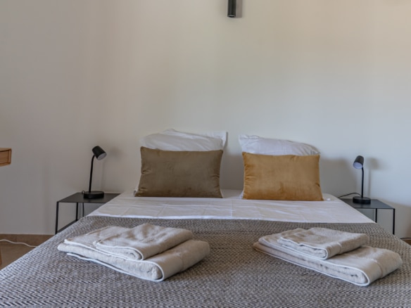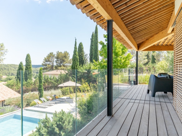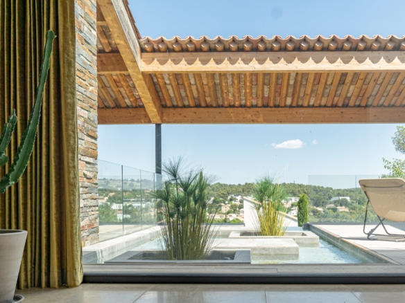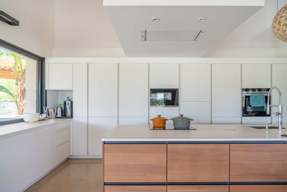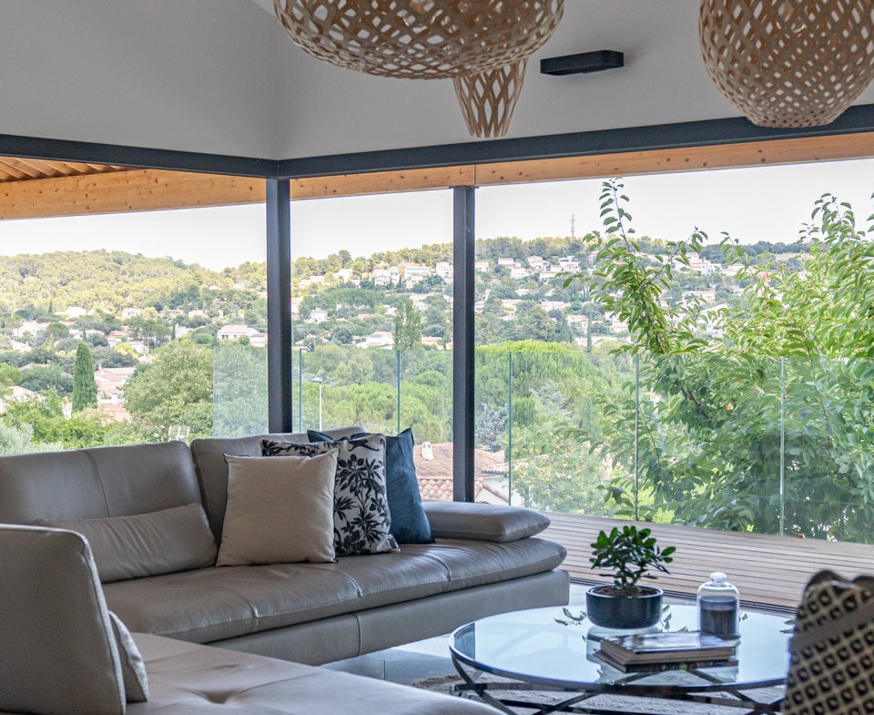 The interior of Villa Bel-Air flawlessly blends serenity and high-end design. From the outdoor living area, there is direct access to the indoor dining area for 12. The open-floor concept allows for fluid access to the fully equipped, spacious kitchen with contemporary designs and a central island, and to the living room with a leather sofa, wall-mounted flat-screen TV and a high-quality audio equipment. At the centre of this open space is a spectacular glasshouse with an interior garden which goes up 2 levels. From the living area, travellers will be mesmerised by the sounds of the water from the fountain trickling down to the lower garden and the breathtaking views of the village on the hills. On the East side of the house a separate corridor leads to the first bedroom section which comprises 3 double bedrooms (160x200cm). Two of the rooms have direct access to a private terrace fitted with chairs and endowed with views of the swimming pool and its surroundings. These rooms share a spacious family bathroom equipped with a shower, a bathtub, and a separate toilet. The master bedroom is on the west side of the ground floor; it is composed of two rooms, one sitting room with a chic leather sofa and an office area, and a sleeping room with a double bed (160x200cm) with direct access to a private terrace and garden views. The private bathroom is equipped with an open shower and a large bathtub. The toilet is independent.