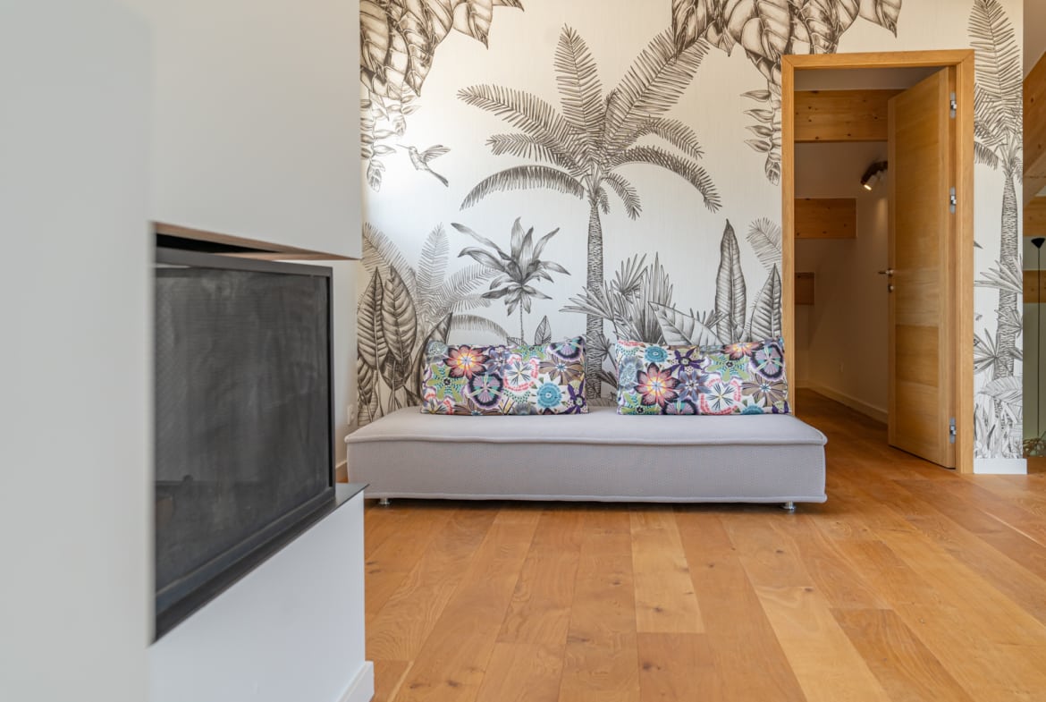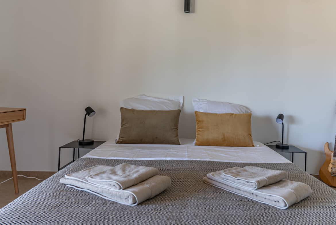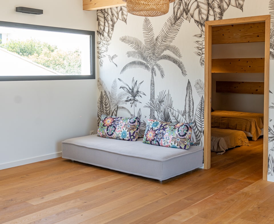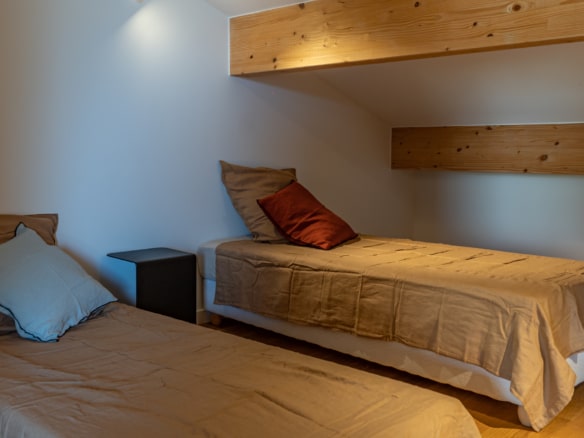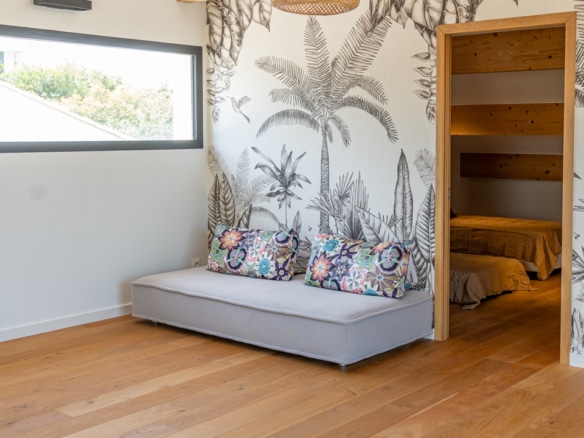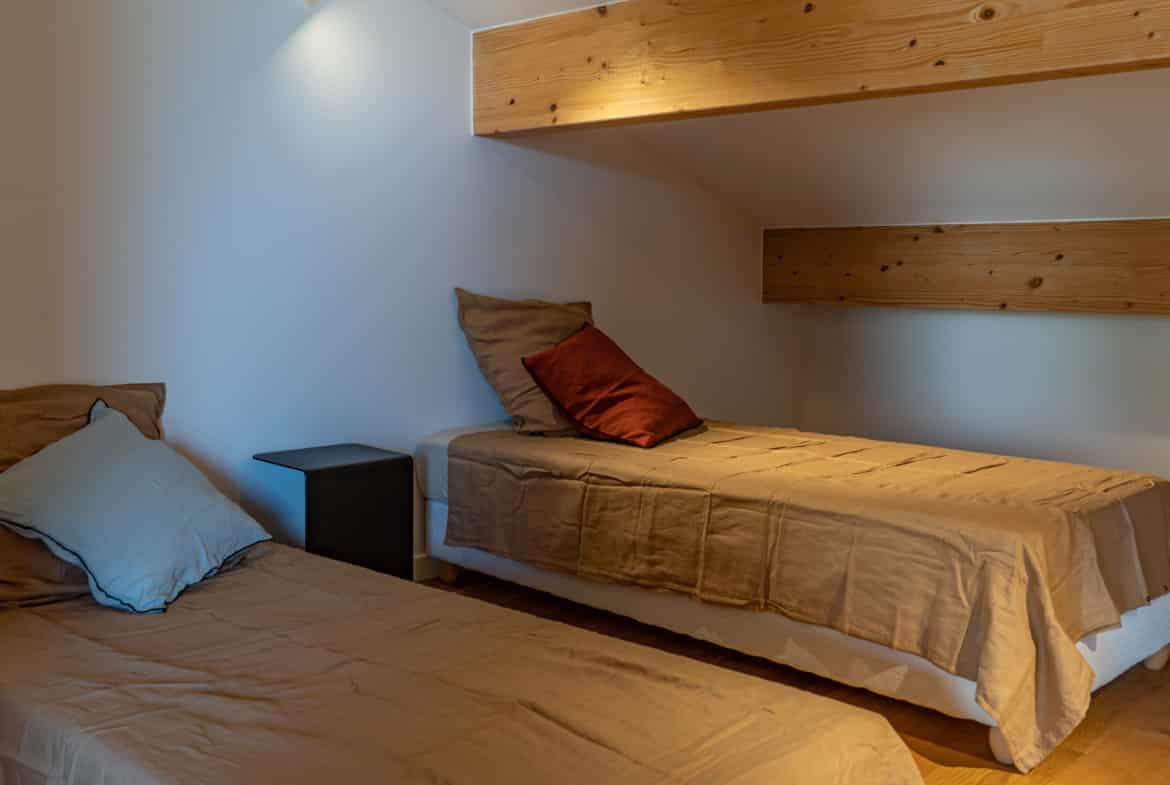 The upper level of the villa is accessible via two different staircases leading to a very large landing area used as a playroom or sitting room facing large sliding glass doors and a terrace. There are two other bedrooms on this floor, one double bedroom (160x200cm) with its en-suite shower room and a second bedroom with 2 single beds.