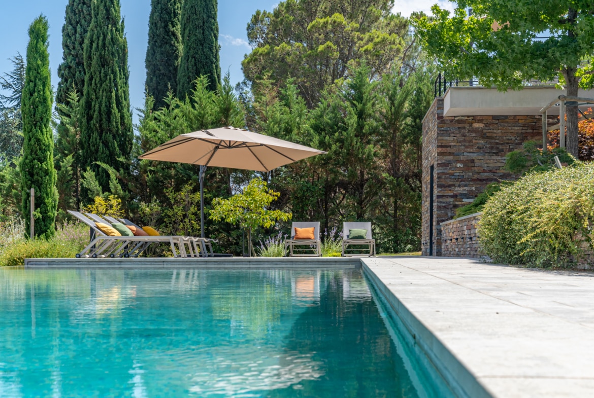 Villa Bel-Air: stylish modern villa with a fountain and a swimming pool, direct view of Golf de Coulondres