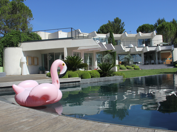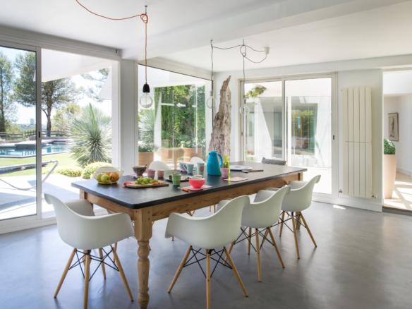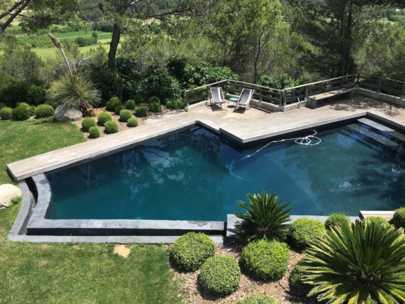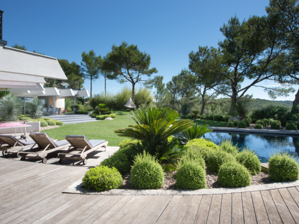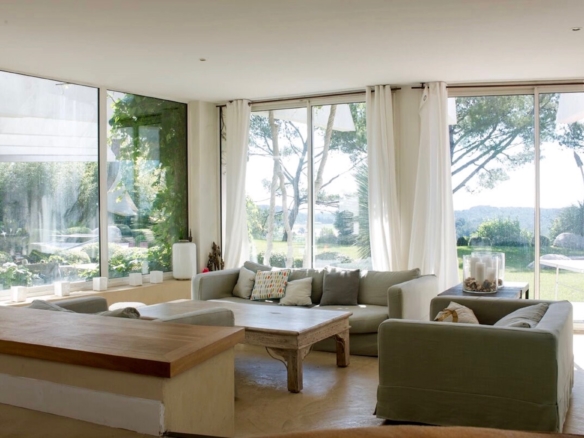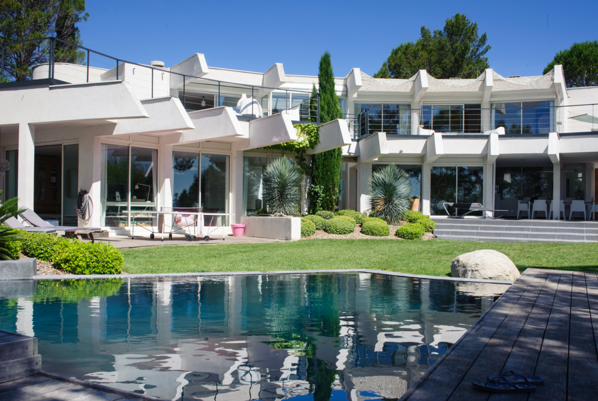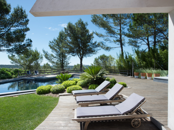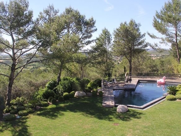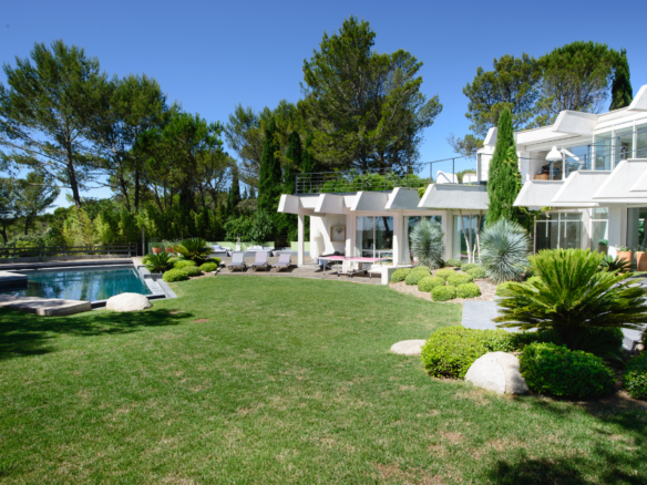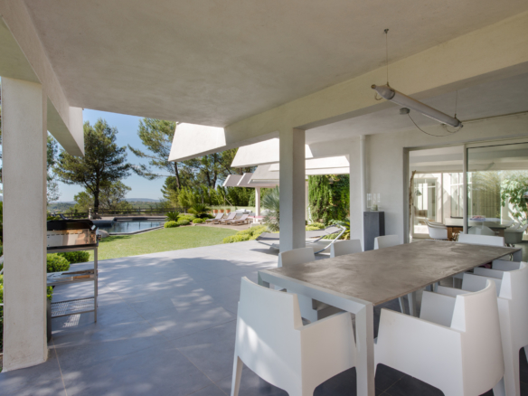 It is composed of a large living room over different levels. On one side, there is a sunken living room with a TV area, and a wood-burning fireplace. On the other, a living room on sits behind a pool table in a veranda that is surrounded by gardens. The spacious family kitchen has a dining area, while the villa offers a formal dining room indoors, and an outdoor dining area with a large gaz barbecue and a plancha. A long south facing terrace follows the front of the house up until the side of the swimming pool where large built-in sun beds await you, as well as sun loungers and other design garden furniture.