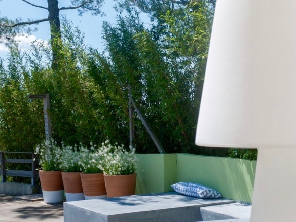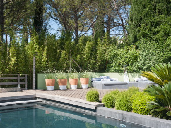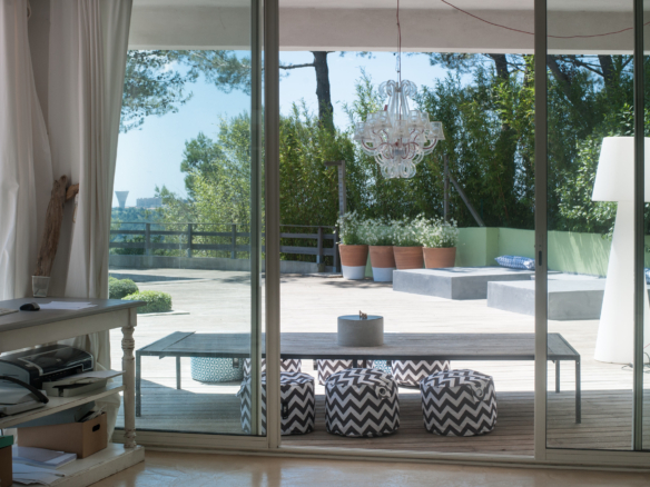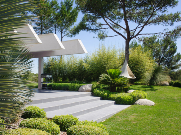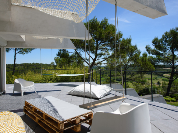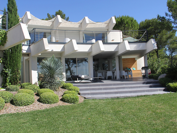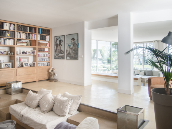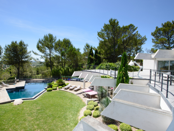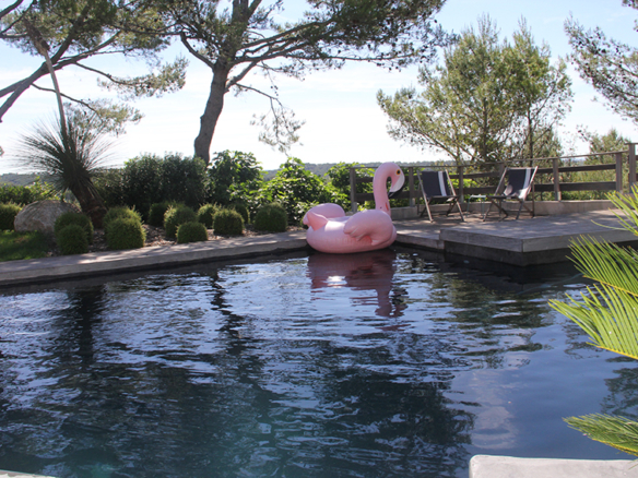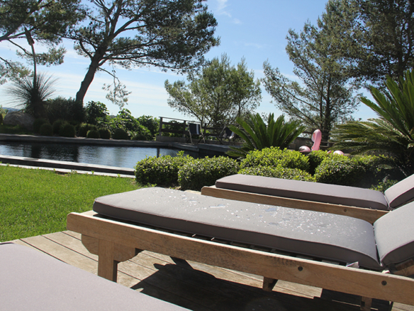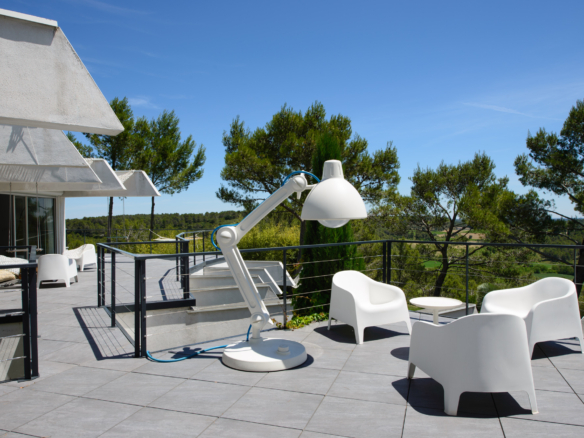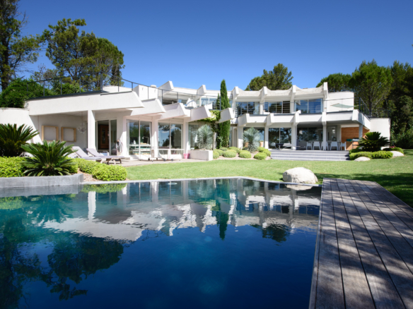 It is composed of a large living room over different levels. On one side, there is a sunken living room with a TV area, and a wood-burning fireplace. On the other, a living room on sits behind a pool table in a veranda that is surrounded by gardens. The spacious family kitchen has a dining area, while the villa offers a formal dining room indoors, and an outdoor dining area with a large gaz barbecue and a plancha. A long south facing terrace follows the front of the house up until the side of the swimming pool where large built-in sun beds await you, as well as sun loungers and other design garden furniture.