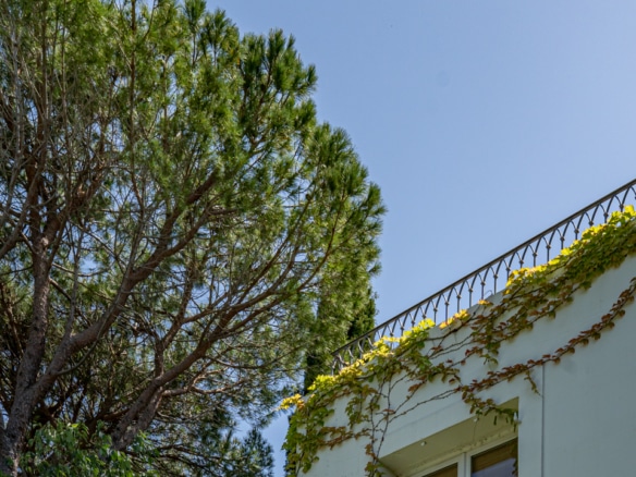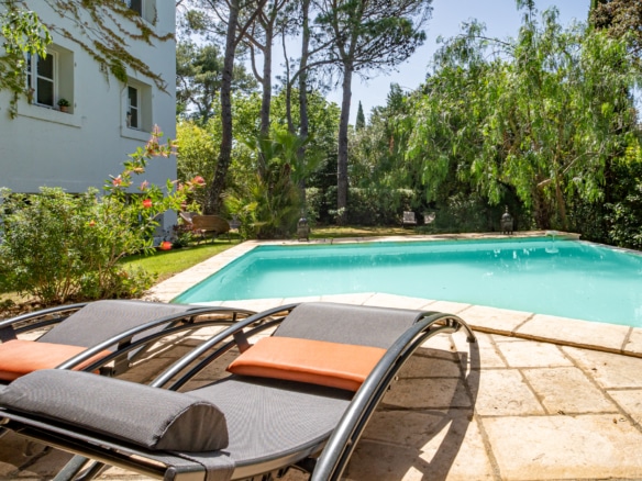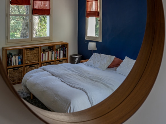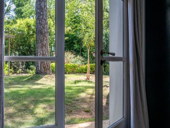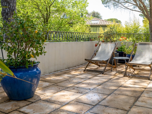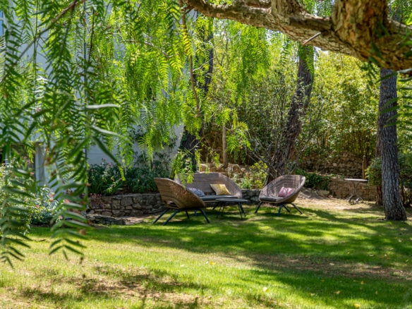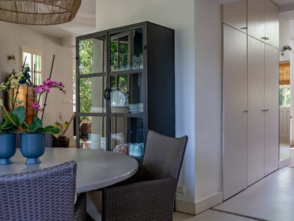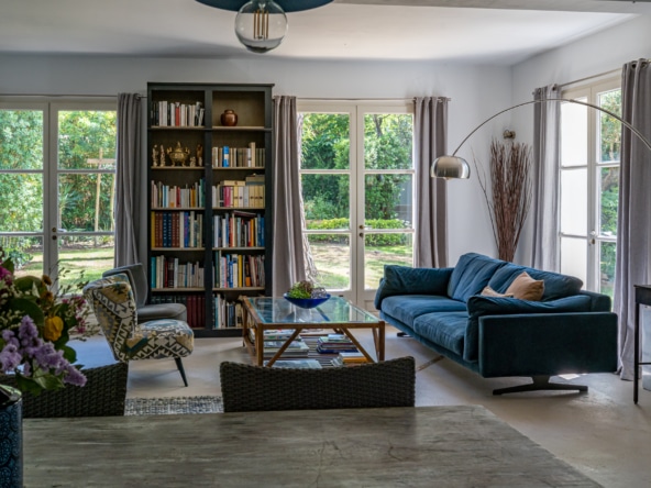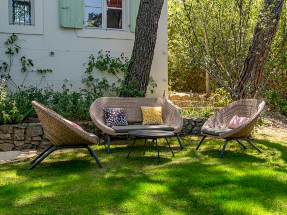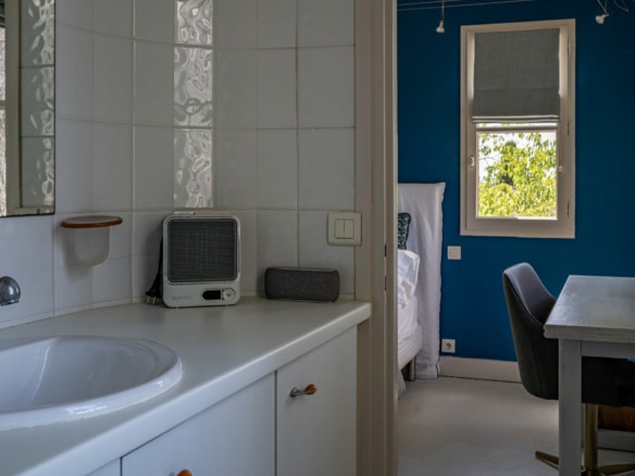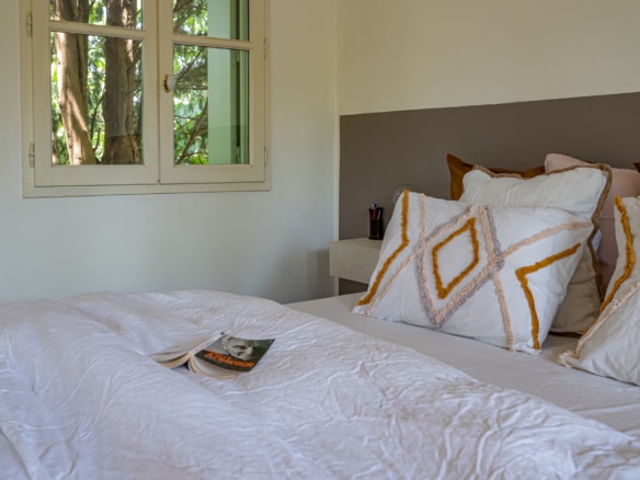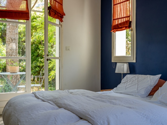 This villa welcomes visiors to a traditional double-height foyer with a staircase, and immediately after, a generous 60-square-meters south-facing living room and open dining area. French windows in this room open straight onto to garden, where a couple of wooden sun deck chairs sit in a peaceful environment, just perfect for an afternoon nap. The partly open Provençal-style kitchen is equipped with all modern appliances and a dining area. The ground floor has one double bedroom with an en-suite shower room. This room has access to a private terrace with a table for two, in front of the garden.