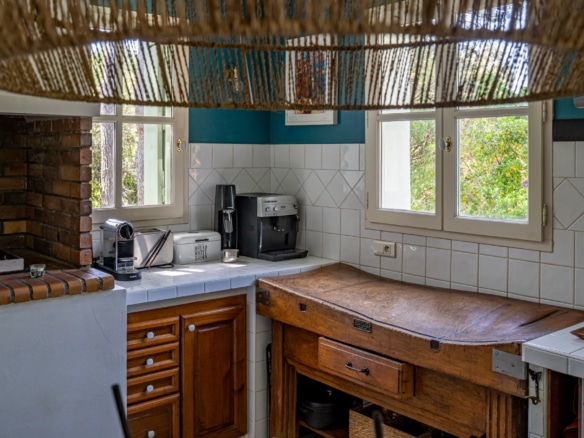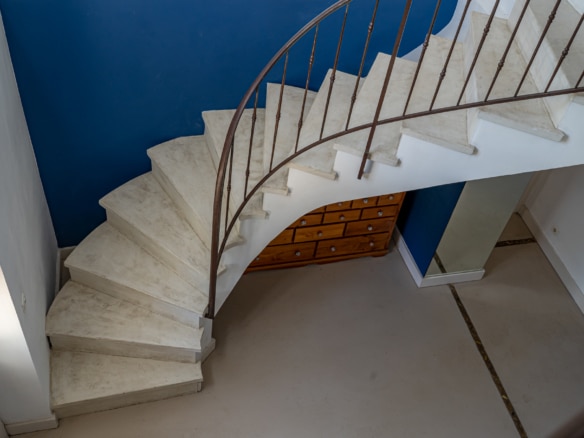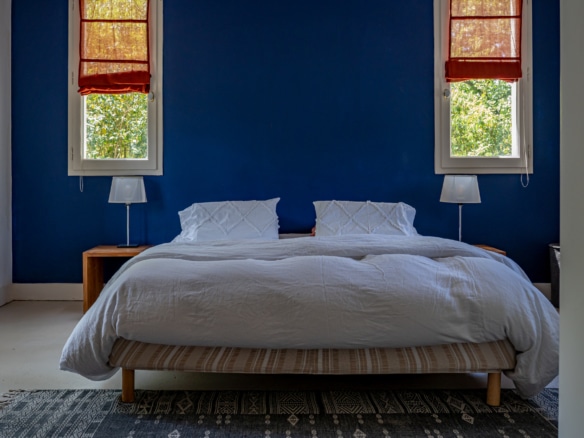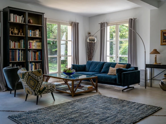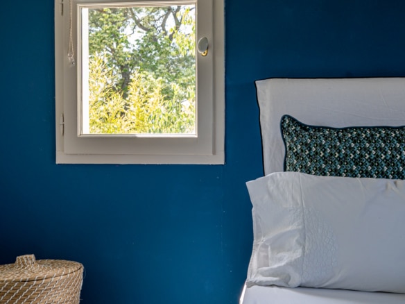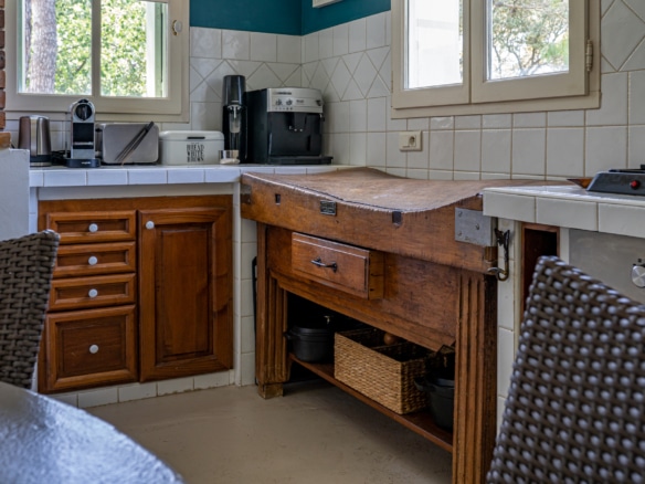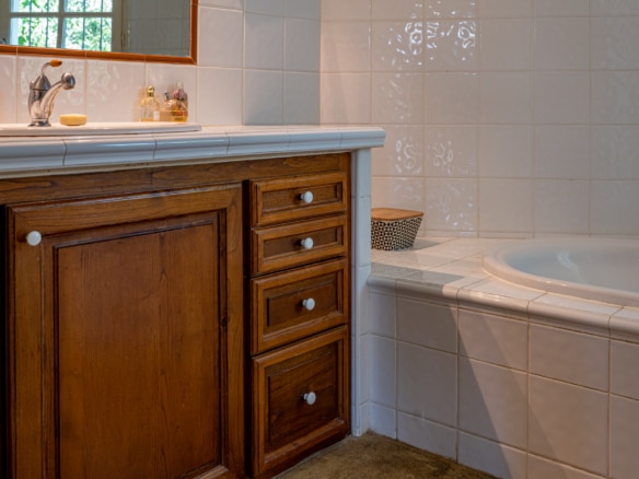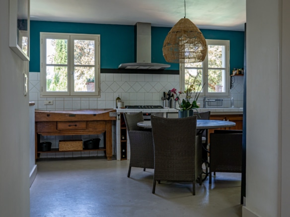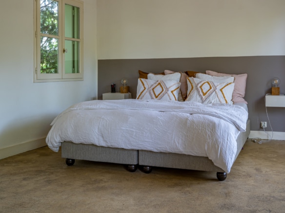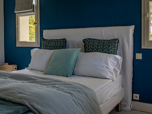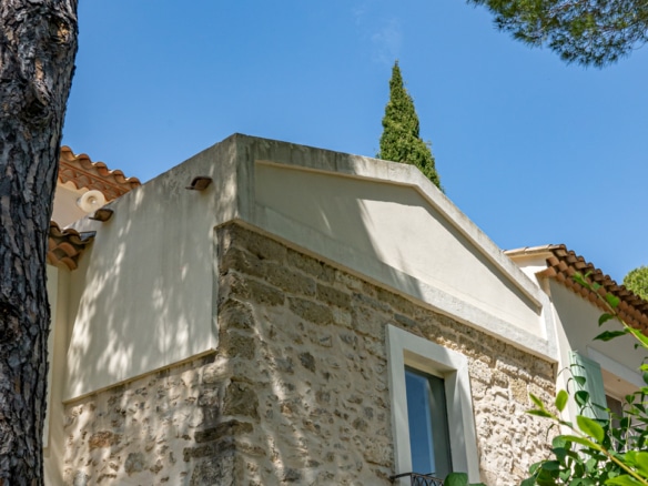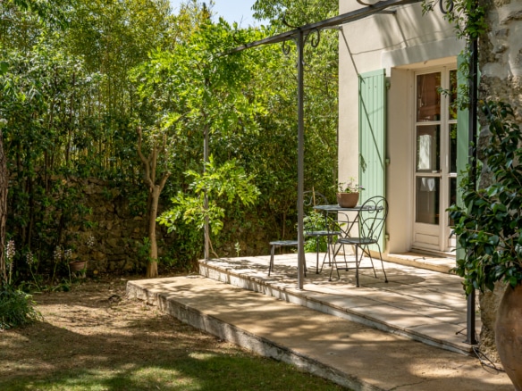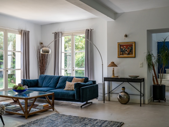 This villa welcomes visiors to a traditional double-height foyer with a staircase, and immediately after, a generous 60-square-meters south-facing living room and open dining area. French windows in this room open straight onto to garden, where a couple of wooden sun deck chairs sit in a peaceful environment, just perfect for an afternoon nap. The partly open Provençal-style kitchen is equipped with all modern appliances and a dining area. The ground floor has one double bedroom with an en-suite shower room. This room has access to a private terrace with a table for two, in front of the garden.