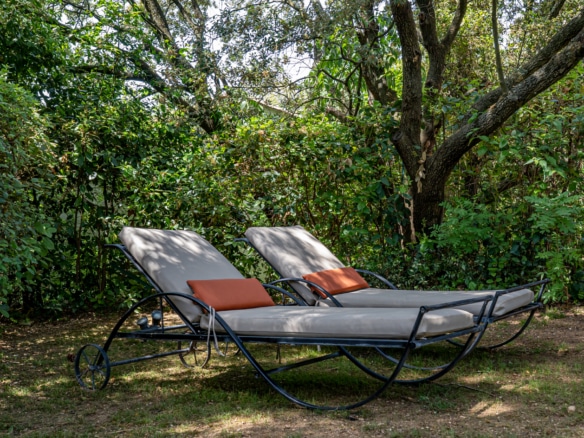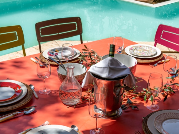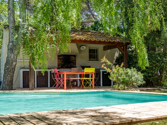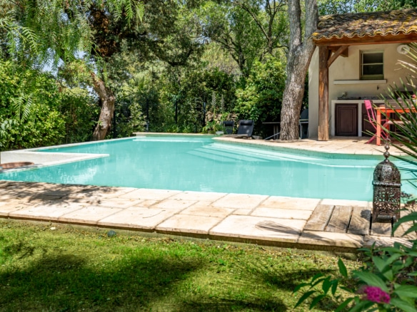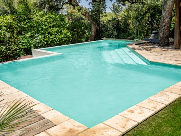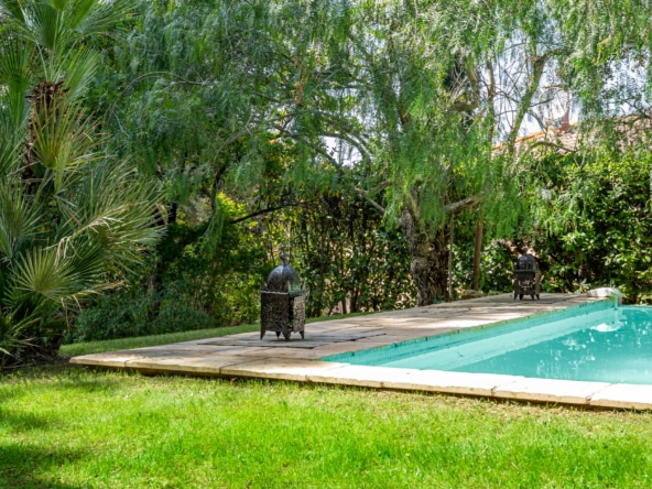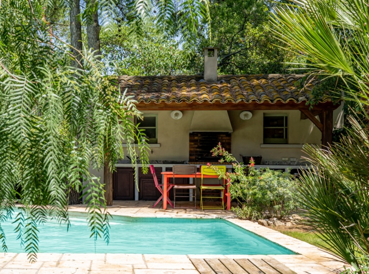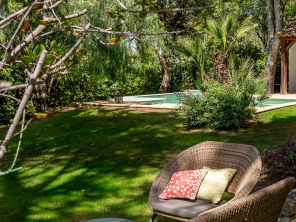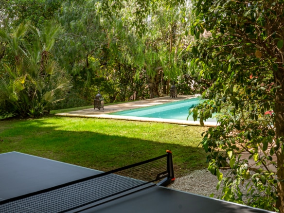 The mature garden is a mixture of local species and tall palm trees that a pleasent shade to keep you cool under the summer sun. The focal point is surely the geometrically-shaped overflowing swimming pool. Next to it, you will find a pool house fitted with a barbecue and a covered dining area for 8, as well as a gas barbecue and a mini fridge. Around tthe garden, yyou will also find a ping-pong table, garden couches under the shade and sun loungers.
