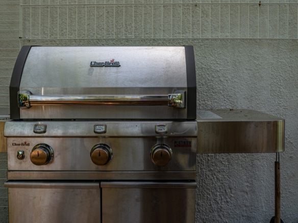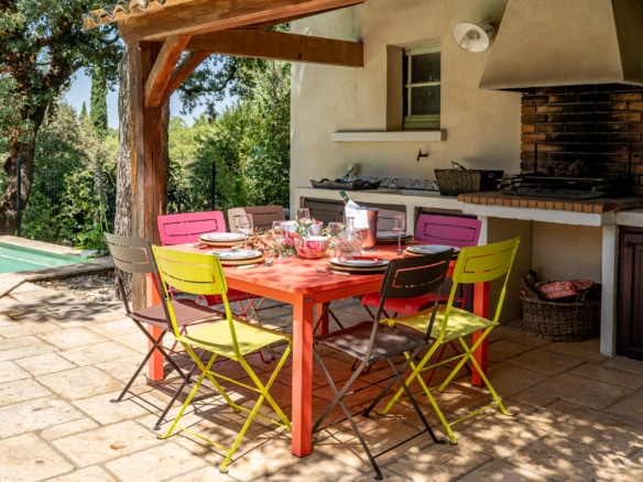 Terrace equiped with a summer kitchen, table and chairs and barbecue