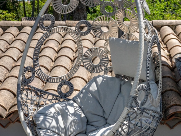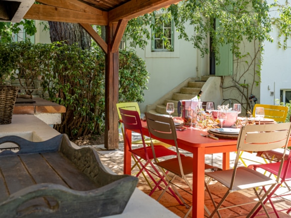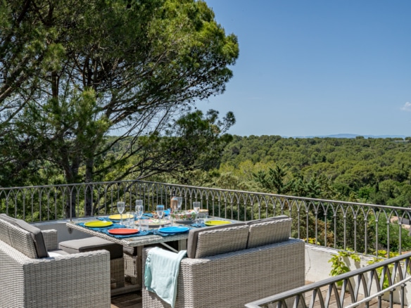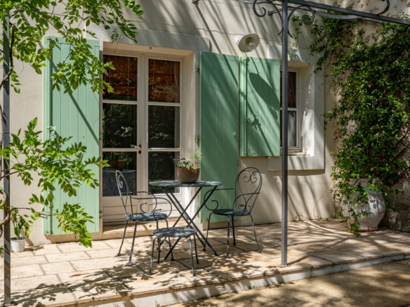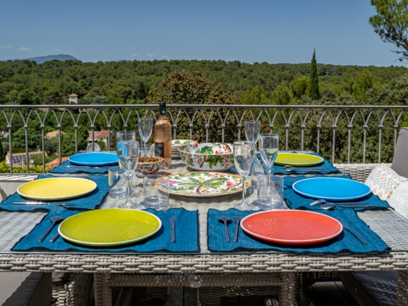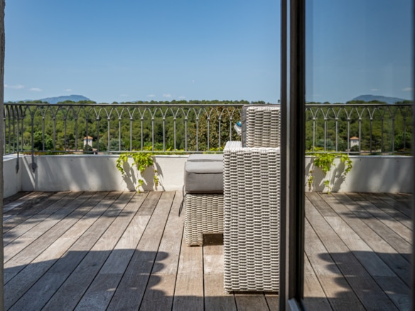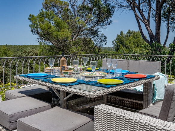 The roofttop terrace has stunning views over the legendary Pic Saint Loup mountain and over the green hills around the property. It is equipped with a dining table for an al fresco drink with a view.