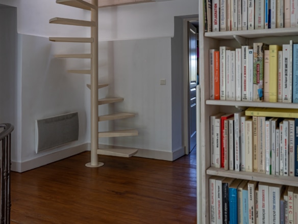 Upstairs, there are two other bedrooms. The main bedroom is equiped with an exercise bicycle and an en-suite bathroom with a bathttub. This bedroom enjoys access to large south-facting private terrace where you will find a deck chair and plants. The second bedroom has an en-suite shower room and views all around over the trees. The landing of the stairs extends to create a small living room, from where you can access the mezzanine wih an extra bed through a spiral staircase.