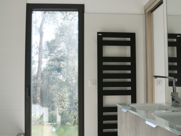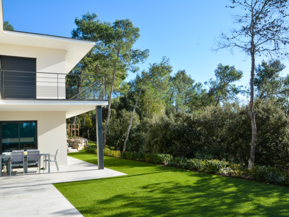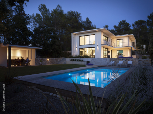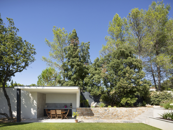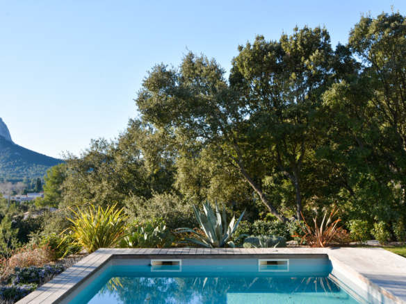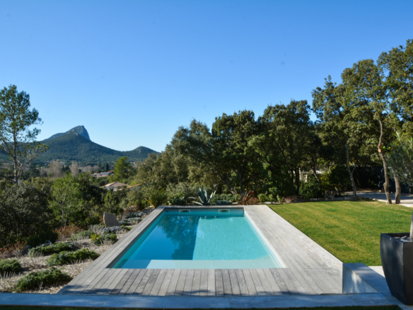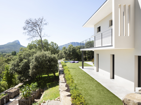 The clean contemporary lines of the villa’s architecture and its beautifully terraced garden blend perfectly well in the garrigues landscape . The pool is surrounded by a wooden terrace and a well manicured garden where you will find lounge chairs and comfortable sofas. Facing the pool, a covered dining area with barbecue will be the perfect retreat for long summer evenings and al fresco meals with unobstructed views of the Pic Saint Loup peak. Right next to it, under the trees is a pétanque field which can be lit for the evening boules games. At the back of the house you will be able to pick vegetables and grapes from the a vegetable garden.
