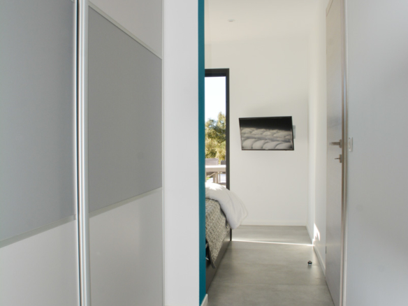 This 180-square-meter house is arranged over two floors and is equipped with radiant floor cooling throughout. The entrance is through the top level. A hallway opens onto a mezzanine with frameless glass railings that overlooks the living room. There you will find a foosball table and in a corner, an office area ; a french window gives access to the south facing terrace. On this floor are two bedrooms, one bedroom with a double sofa bed and another single bedroom with extra single bed; both of these bedrooms share a modern shower room.