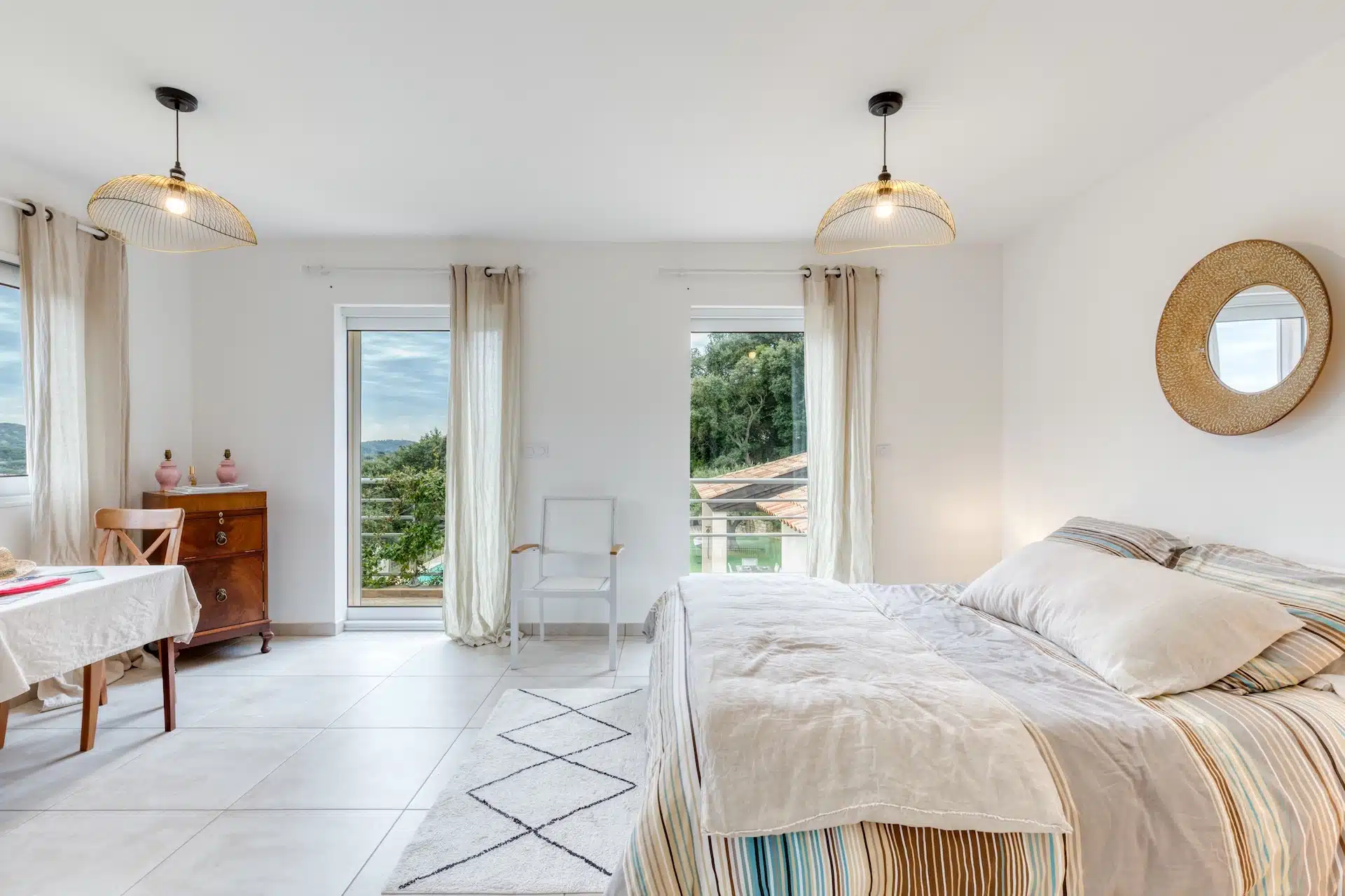 Bedroom 1: Queen bed (160×200 cm), en-suite bath, air conditioning, private terrace.